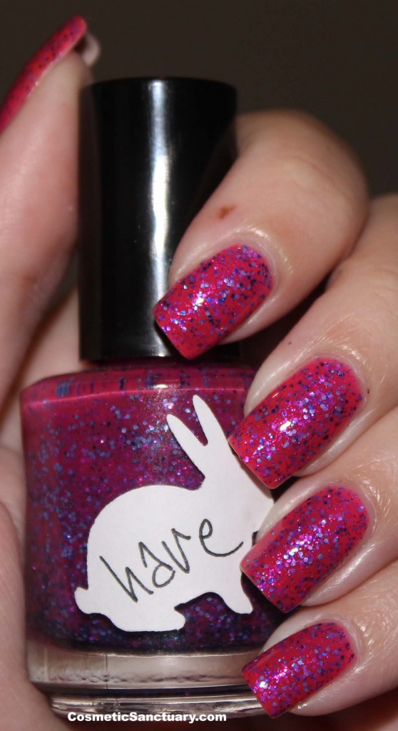 I saved my absolute #1 for last. The Sky Was Pink is fabulous! This one has a vibrant hot pink base with blue, purple and pink glitter as well as a a gorgeous pink shimmer throughout. I used 3 coats for this! I actually put this on last Friday. I didn’t want to take it off so I could swatch the rest of the Hare polishes. Of the 5 – this would be the MUST HAVE!