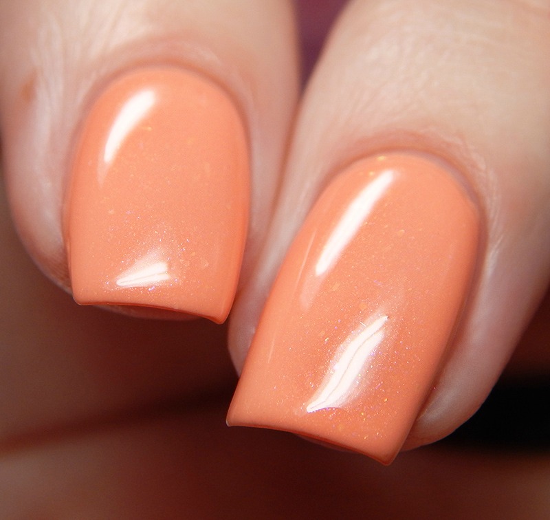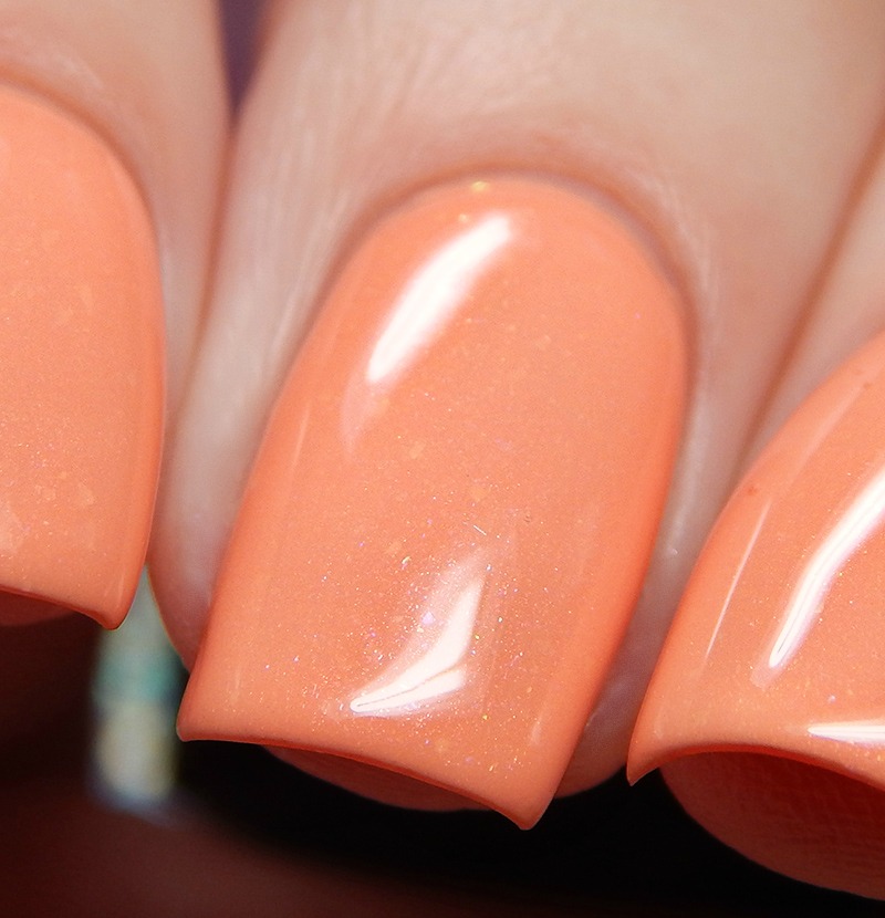 Peach Believe In Me is a medium pastel peach creme with pink to gold shimmer flecks mixed in. I used 3 thin coats and a glossy top coat for these photos.