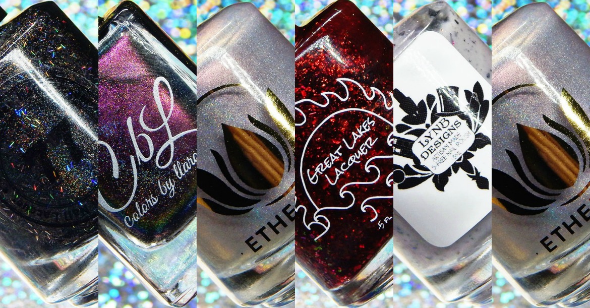 For this month, I have creations from 77 Nail Lacquer, Colors by Llarowe, Ethereal Lacquer, Great Lakes Lacquer, LynBDesigns and Necessary Evil Polish to share. I’m still kind of waking up and I haven’t had coffee just yet – so .. let’s get started.
