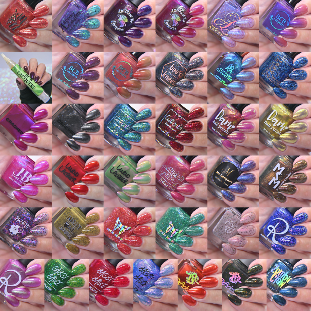 I used a latex base coat for all of these photos that I bottle myself, and for the glossy photos I did Monarch Lacquer Hi-Def Shine Top coat (sent as PR and I’ve also purchased.. and that’s an affiliate link). For all textured polishes, I did use Glisten & Glow Glitter Grabber (PR) and Monarch Lacquer top coat over it.