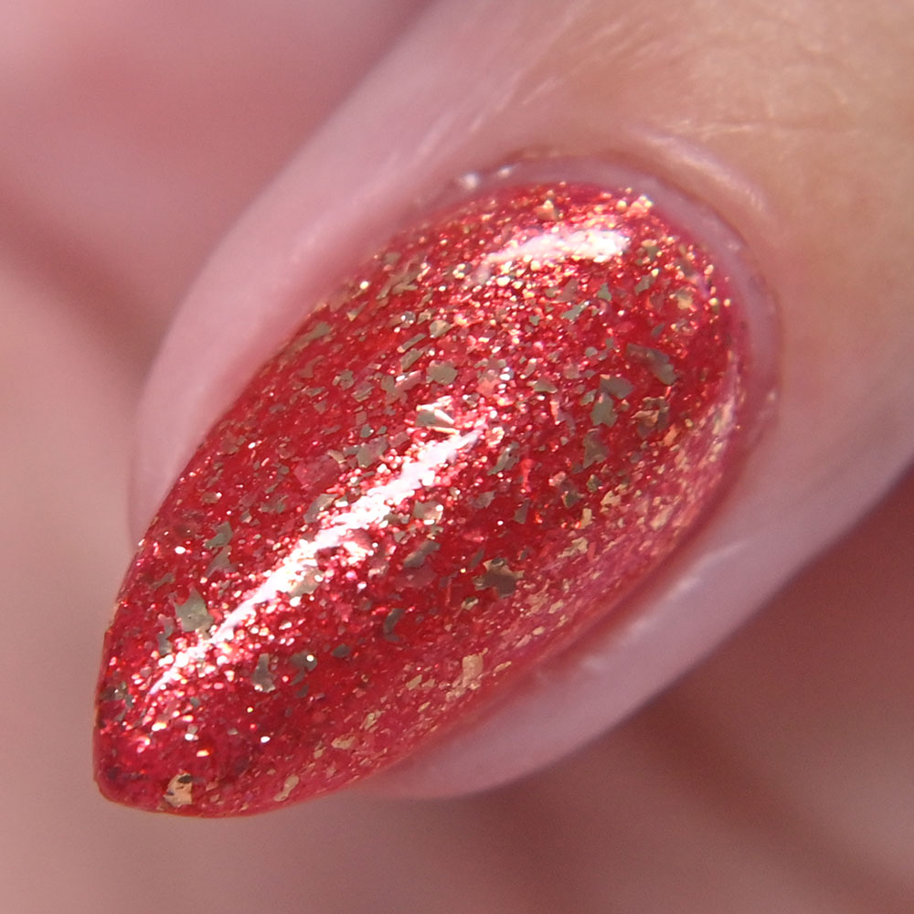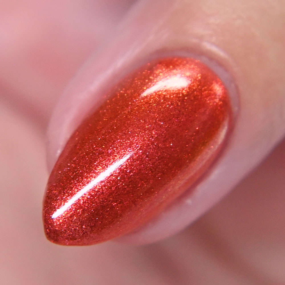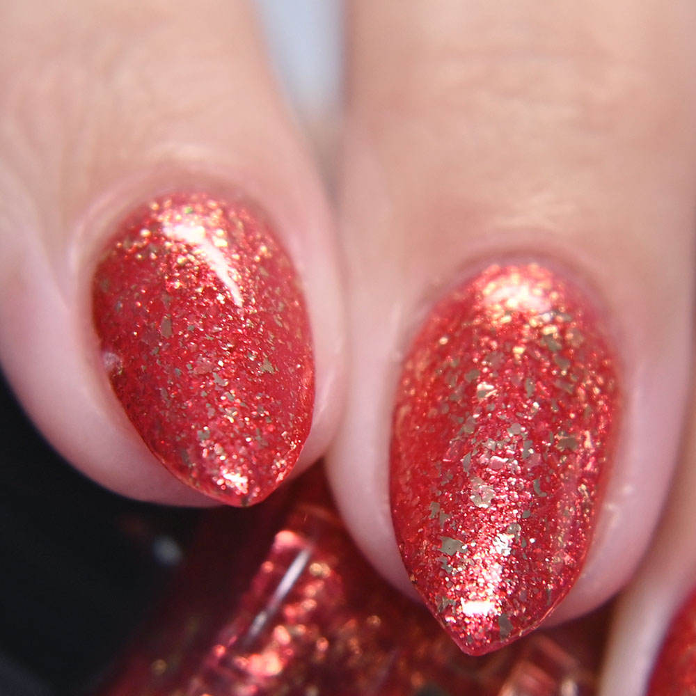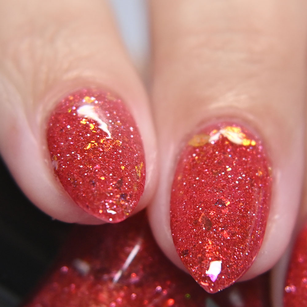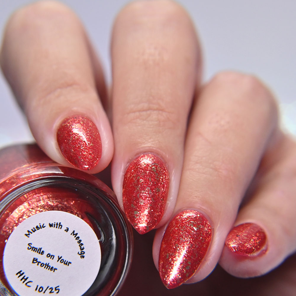 Description: Smile on Your Brother is a bright coralish red jelly base with rose-gold shifting micro flakes and gold metallic flakes.