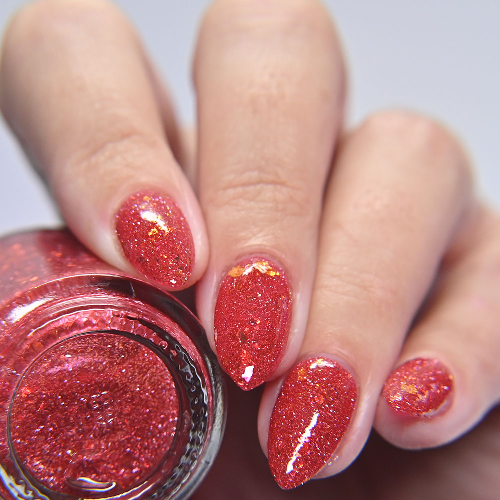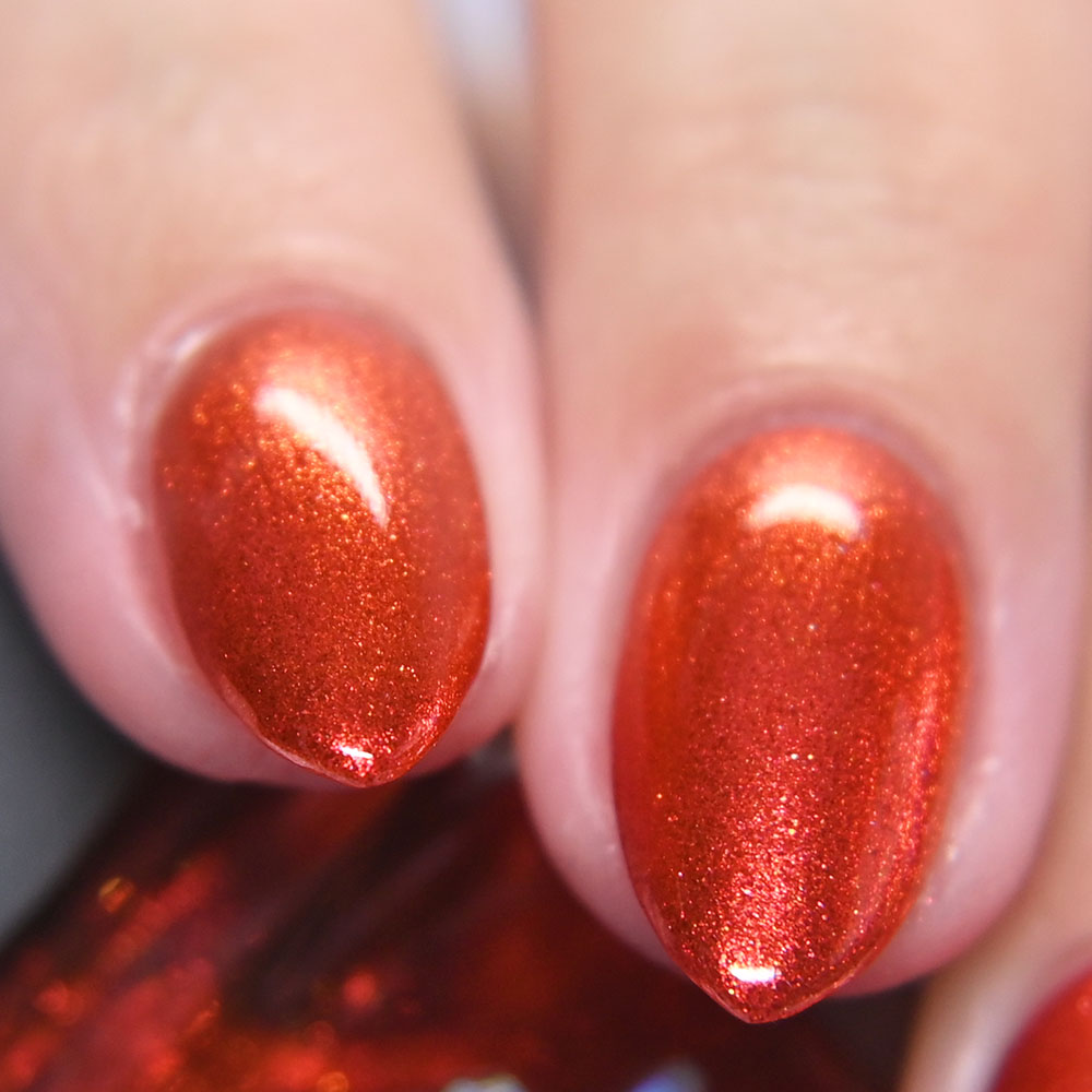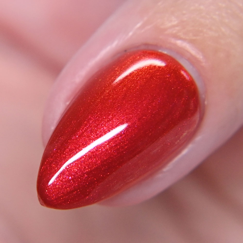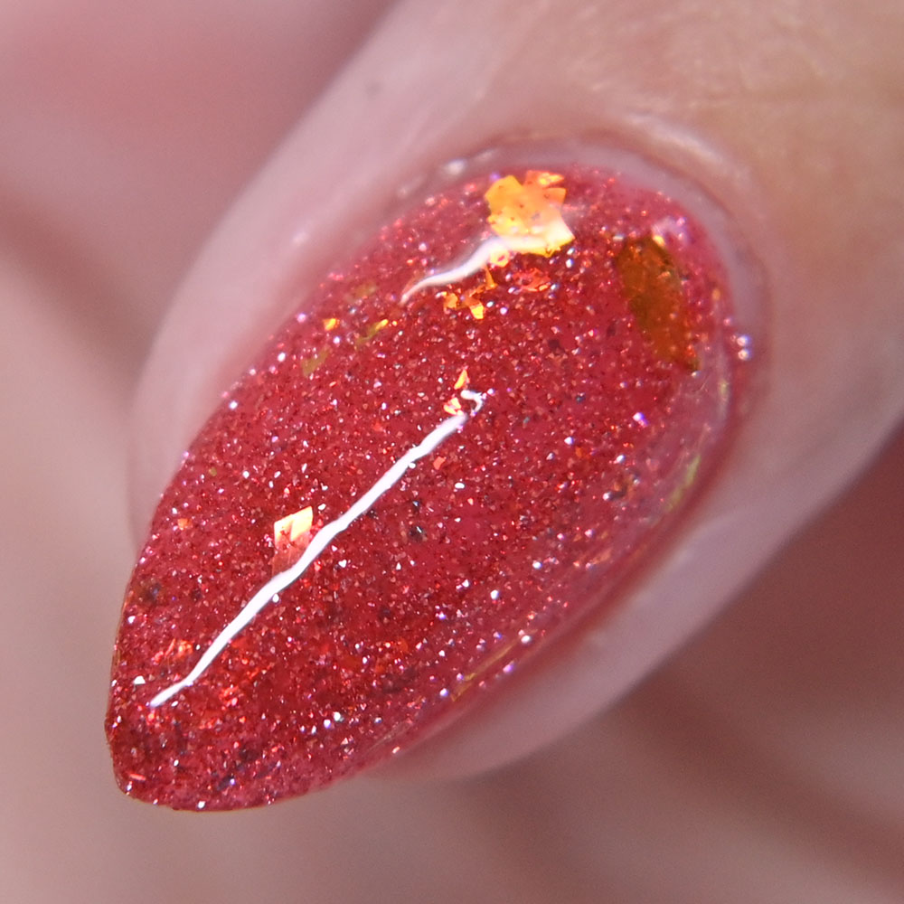 Description: Smile on Your Brother is a bright coralish red jelly base with rose-gold shifting micro flakes and gold metallic flakes.