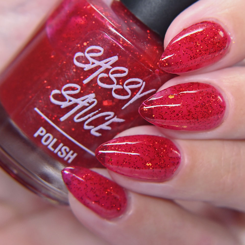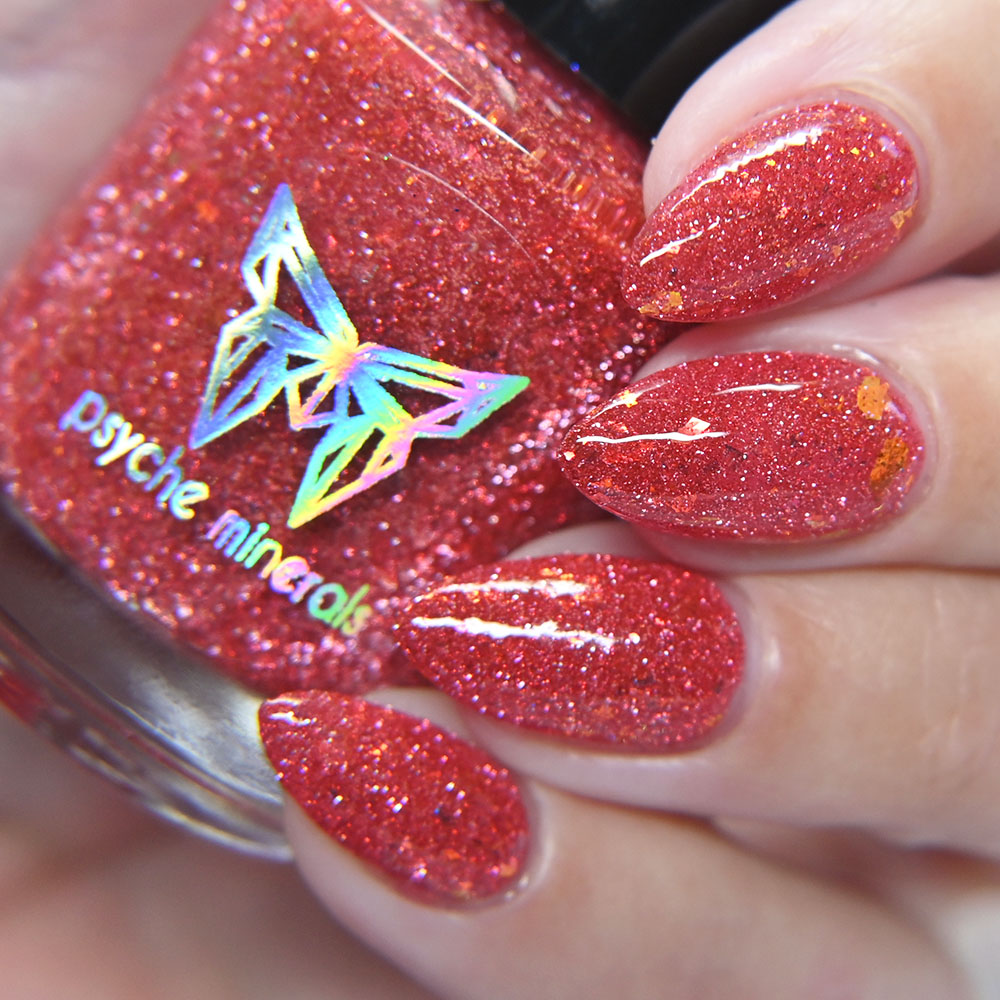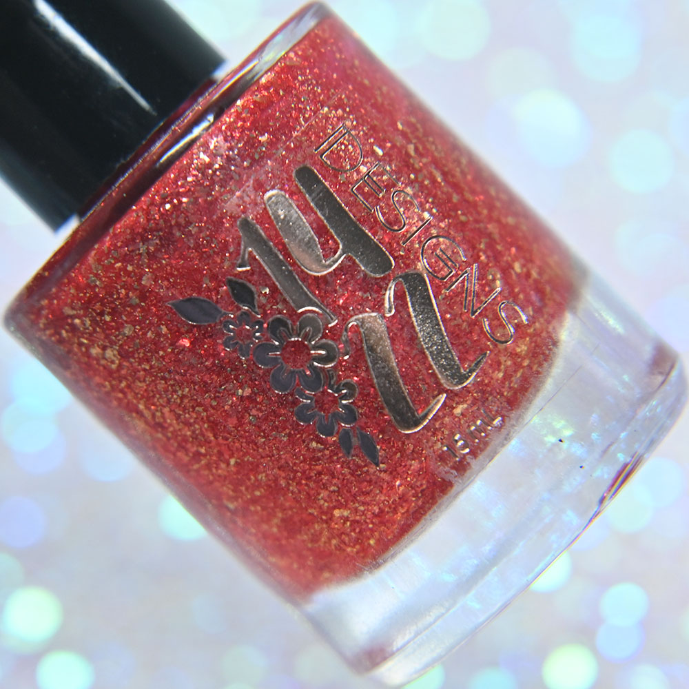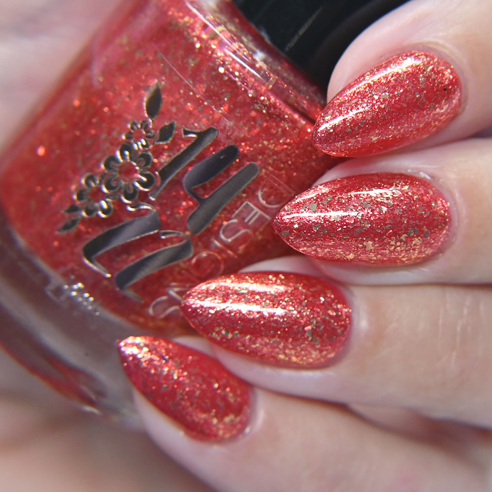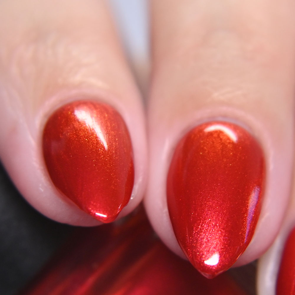 Description: Smile on Your Brother is a bright coralish red jelly base with rose-gold shifting micro flakes and gold metallic flakes.