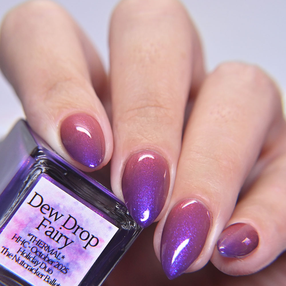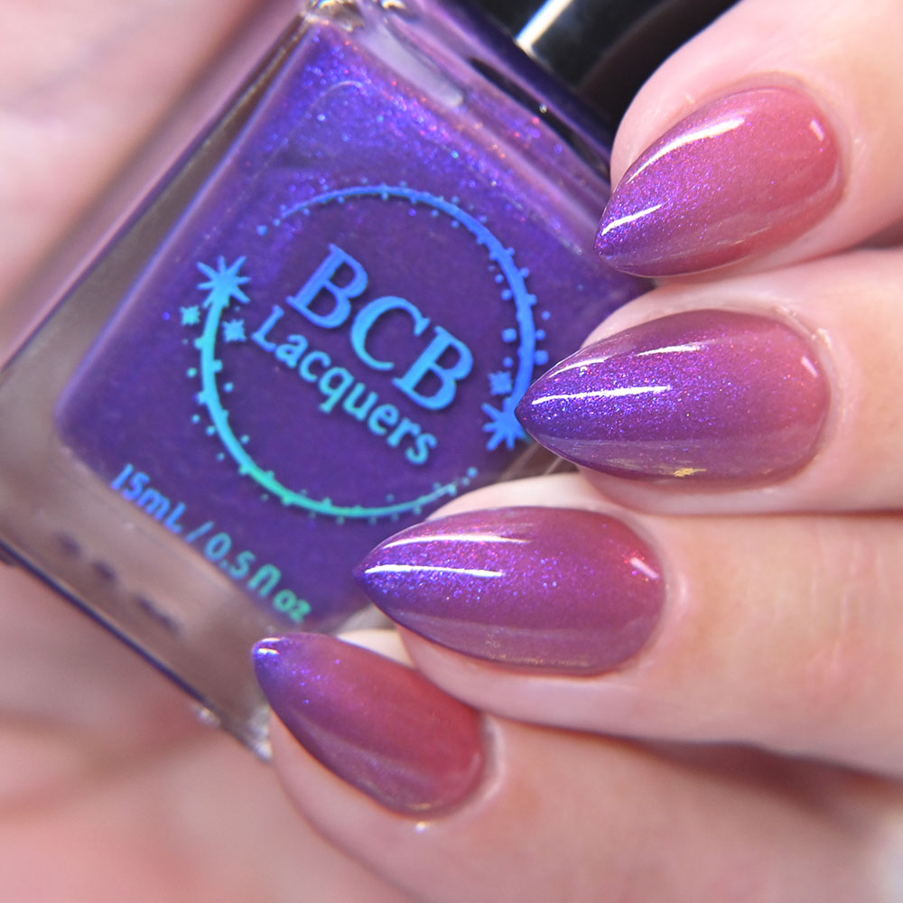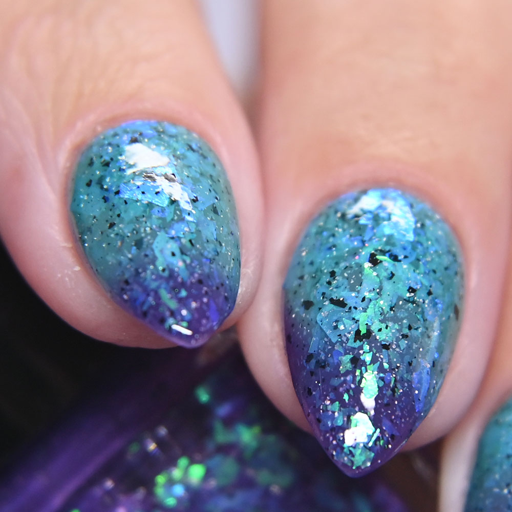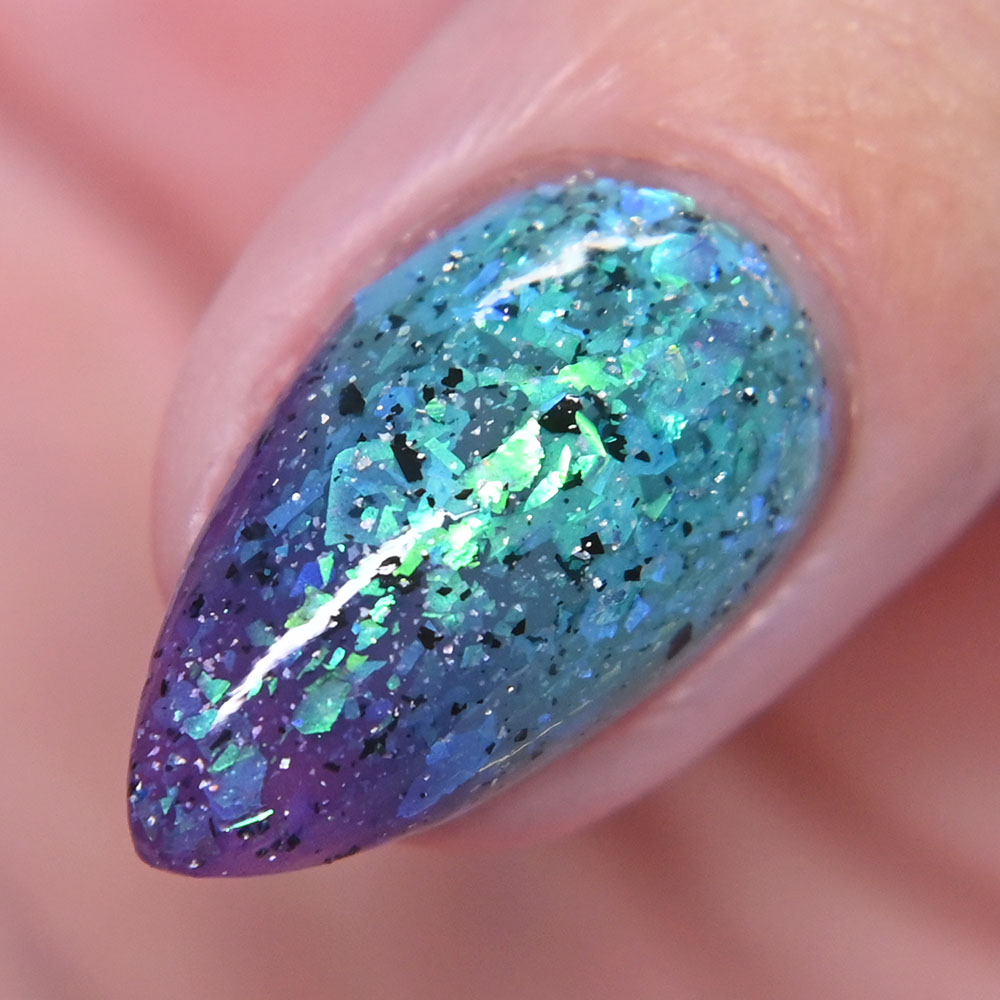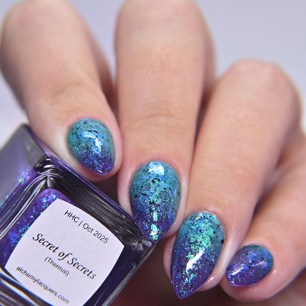 Description: Secret of Secrets is a thermal polish that shifts from a purple when cold to aqua when warm with green to turquoise to blue shifting iridescent flakes and black metallic flakes.