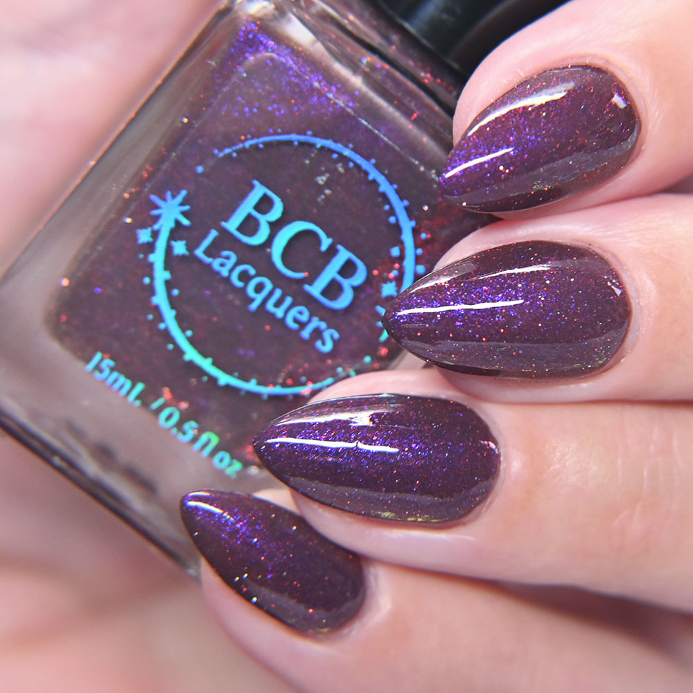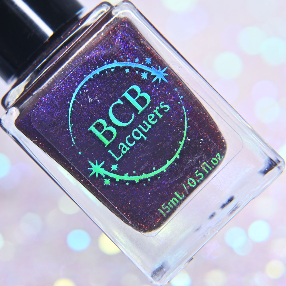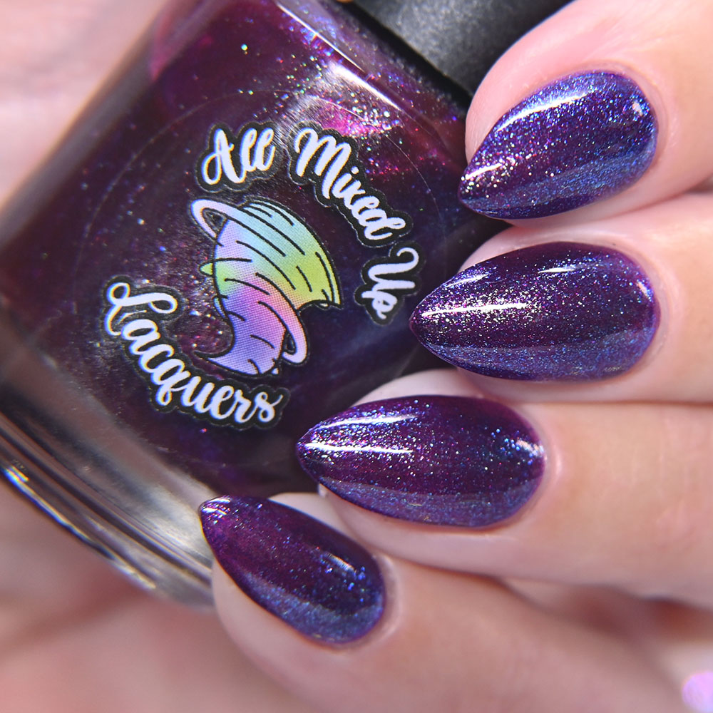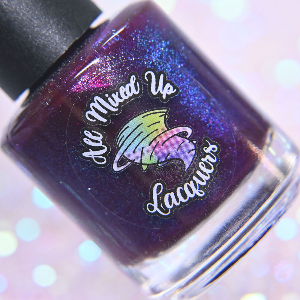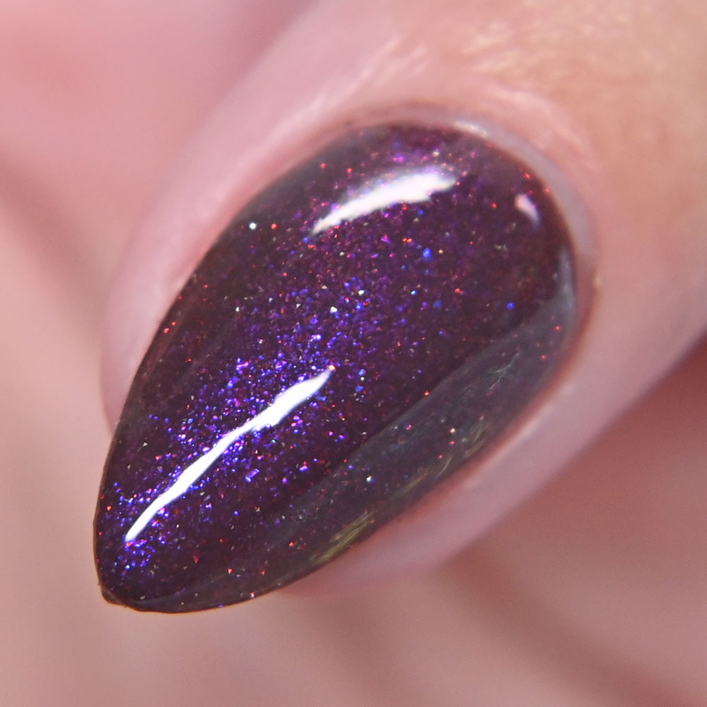 Description: Stab, Strangle, Scoop, Throw is a darkened vampy purple jelly base with green to blue to pink shifting shimmer and scattered colorful shimmers.