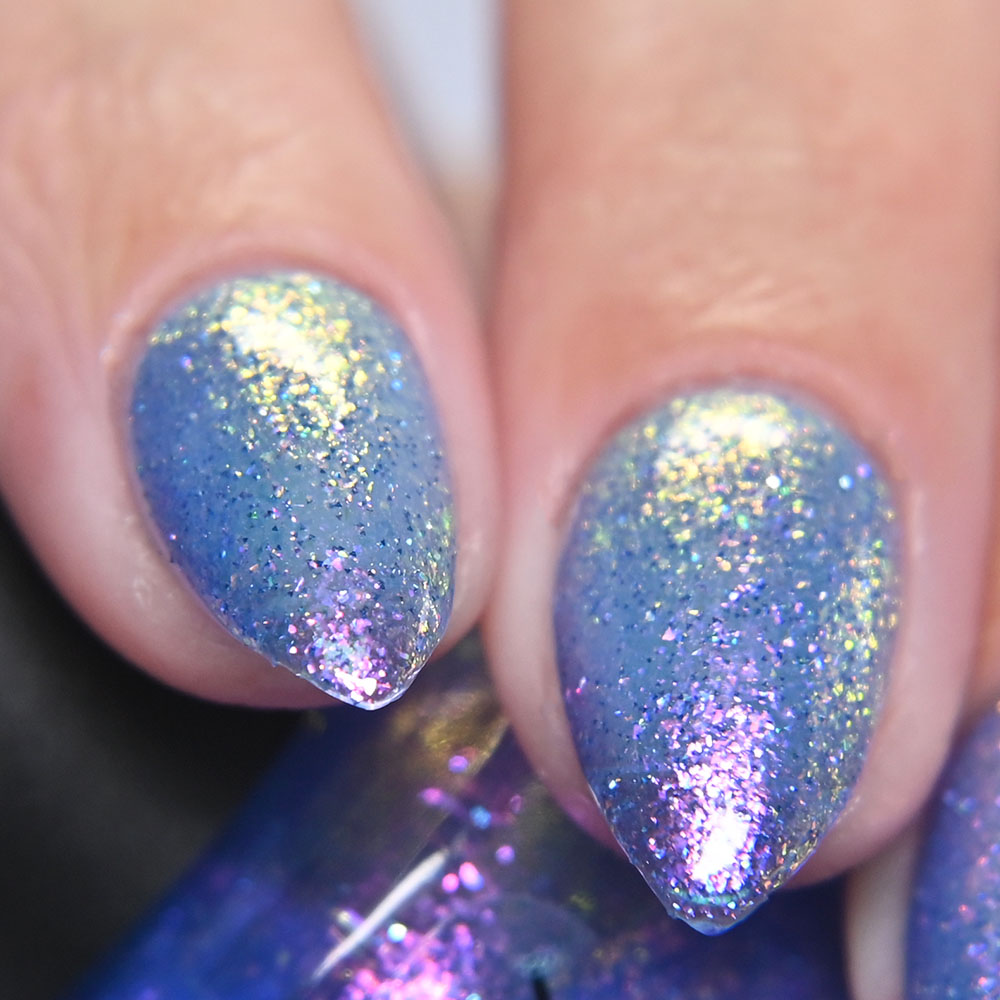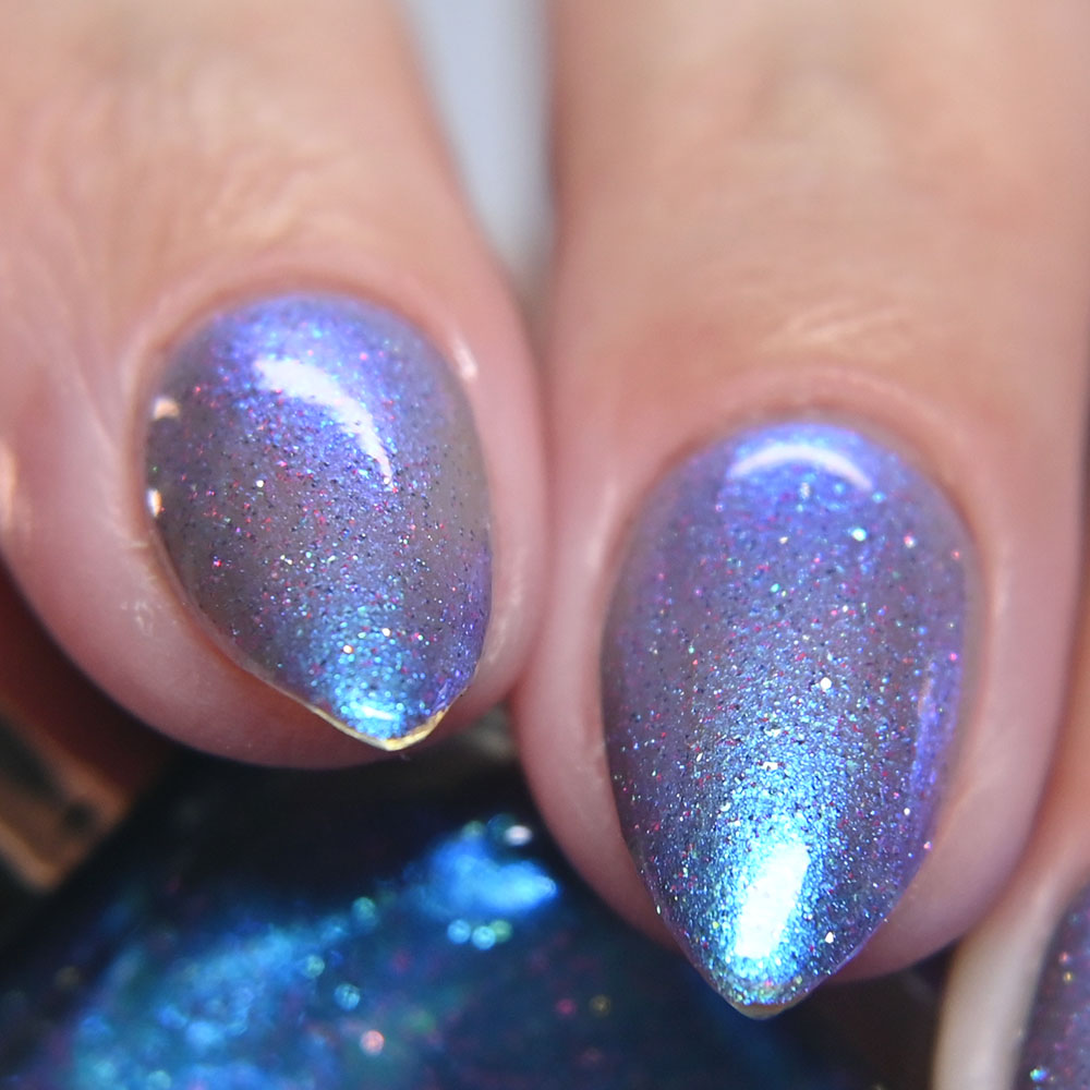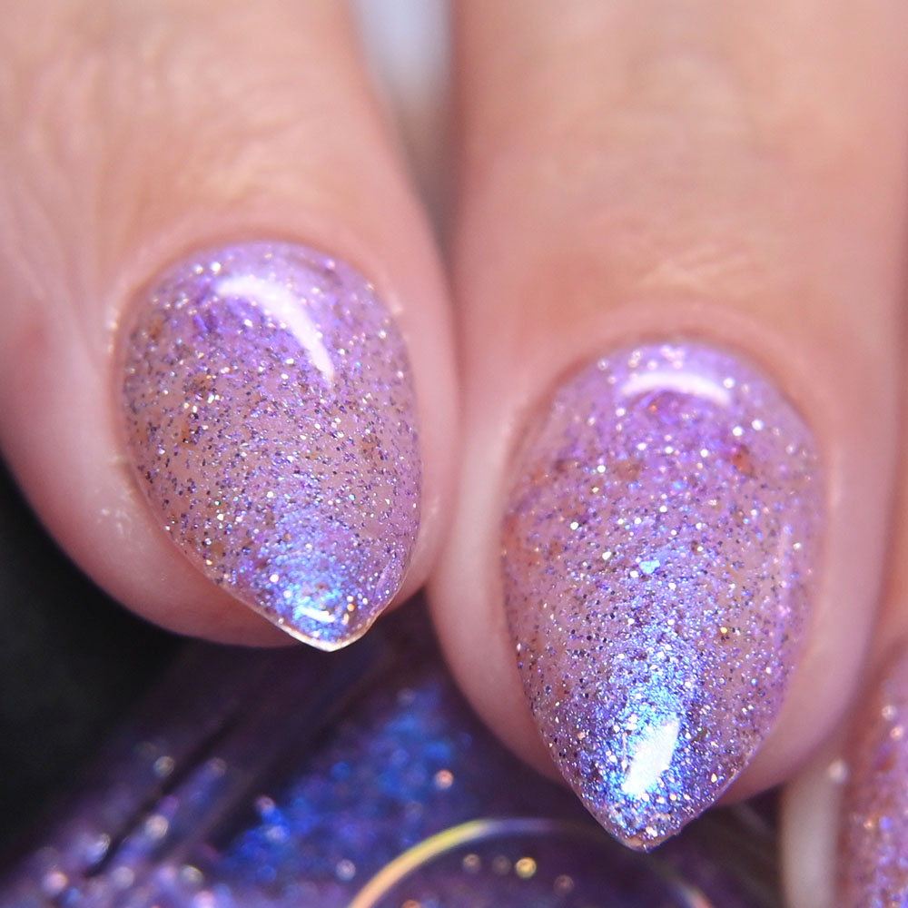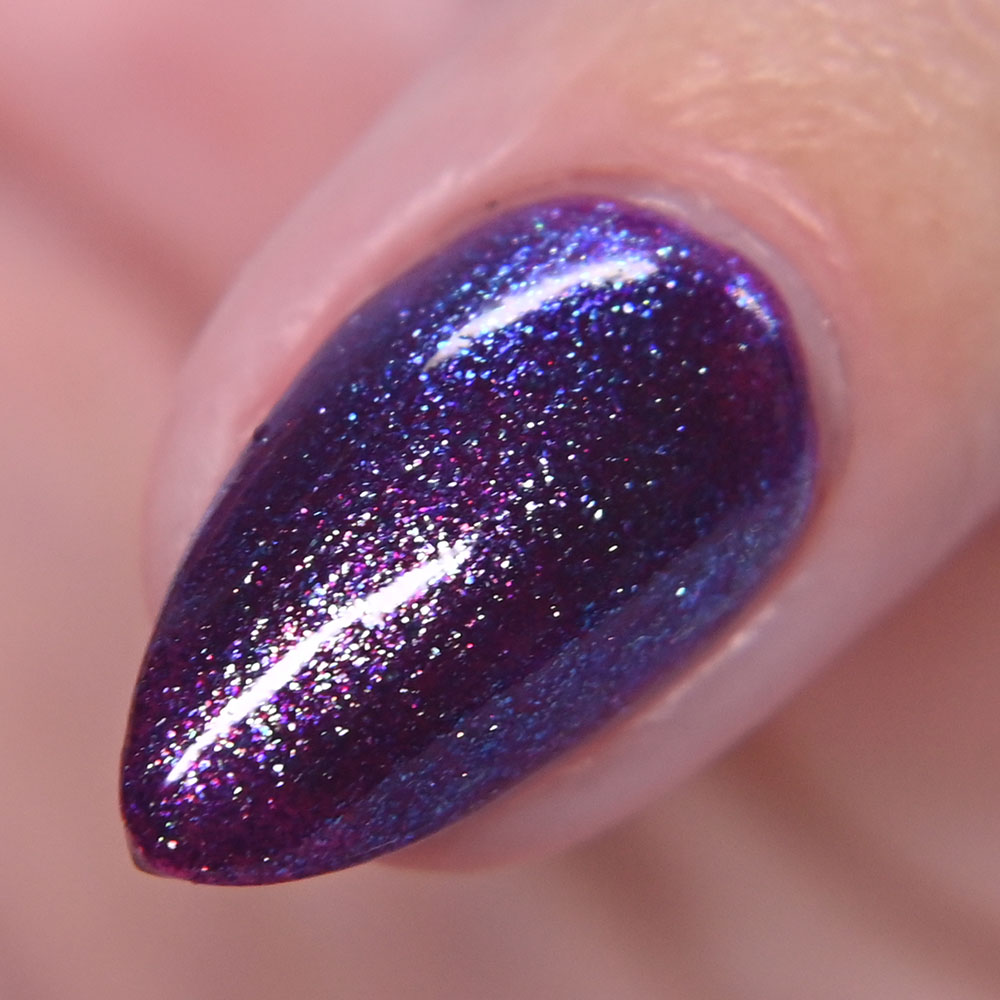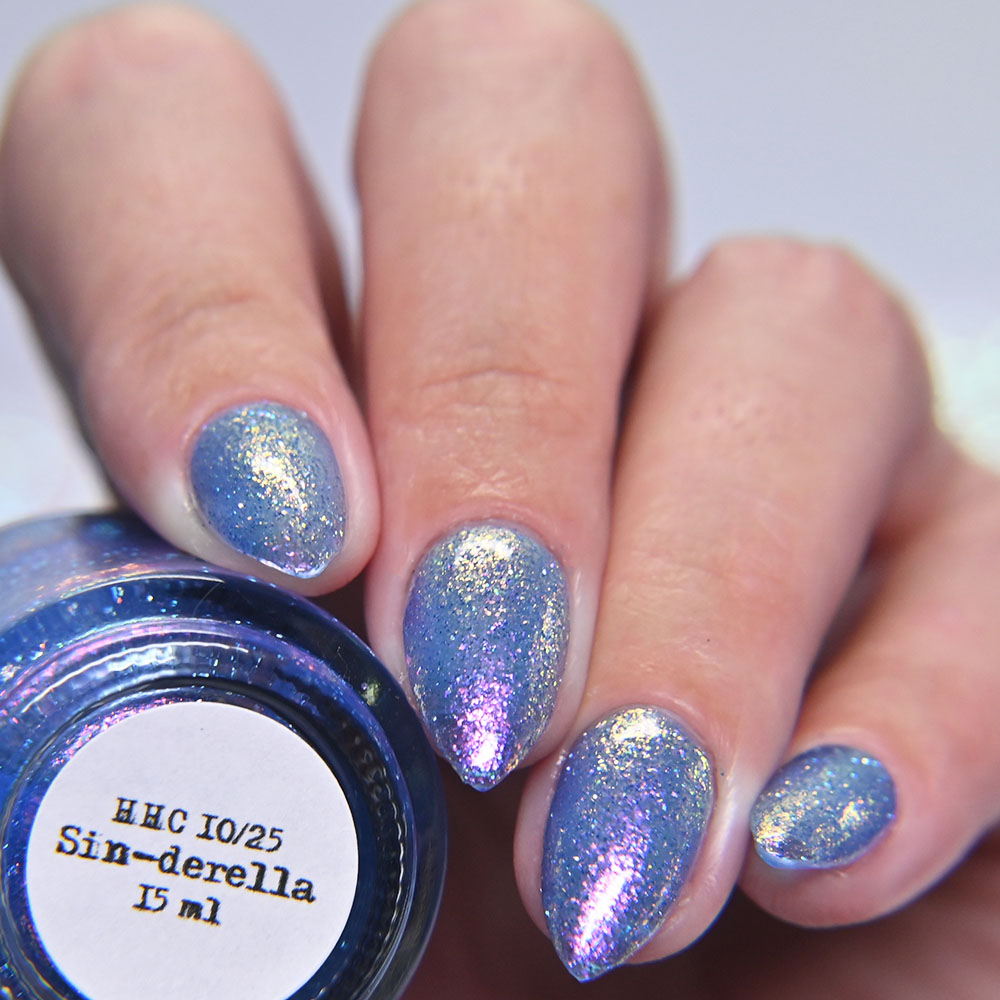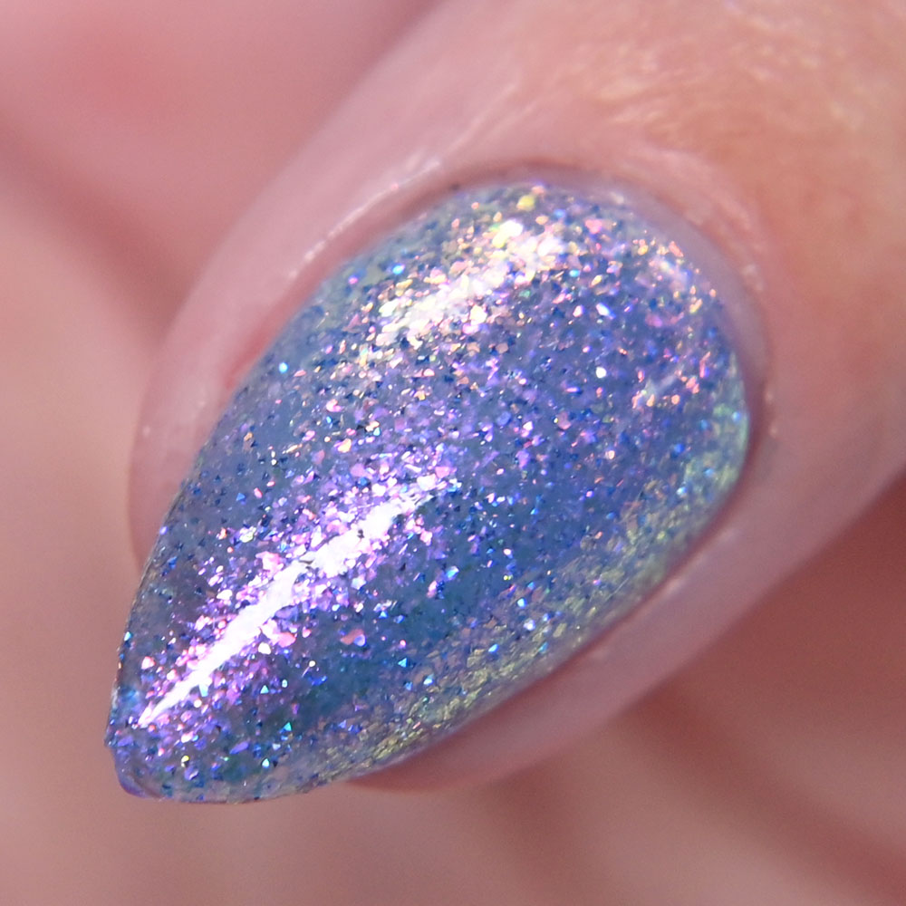 Description: Sin-derella ias a lightly blue tinted base with blue reflective and large particle purple to pink to gold to green shifting shimmer.