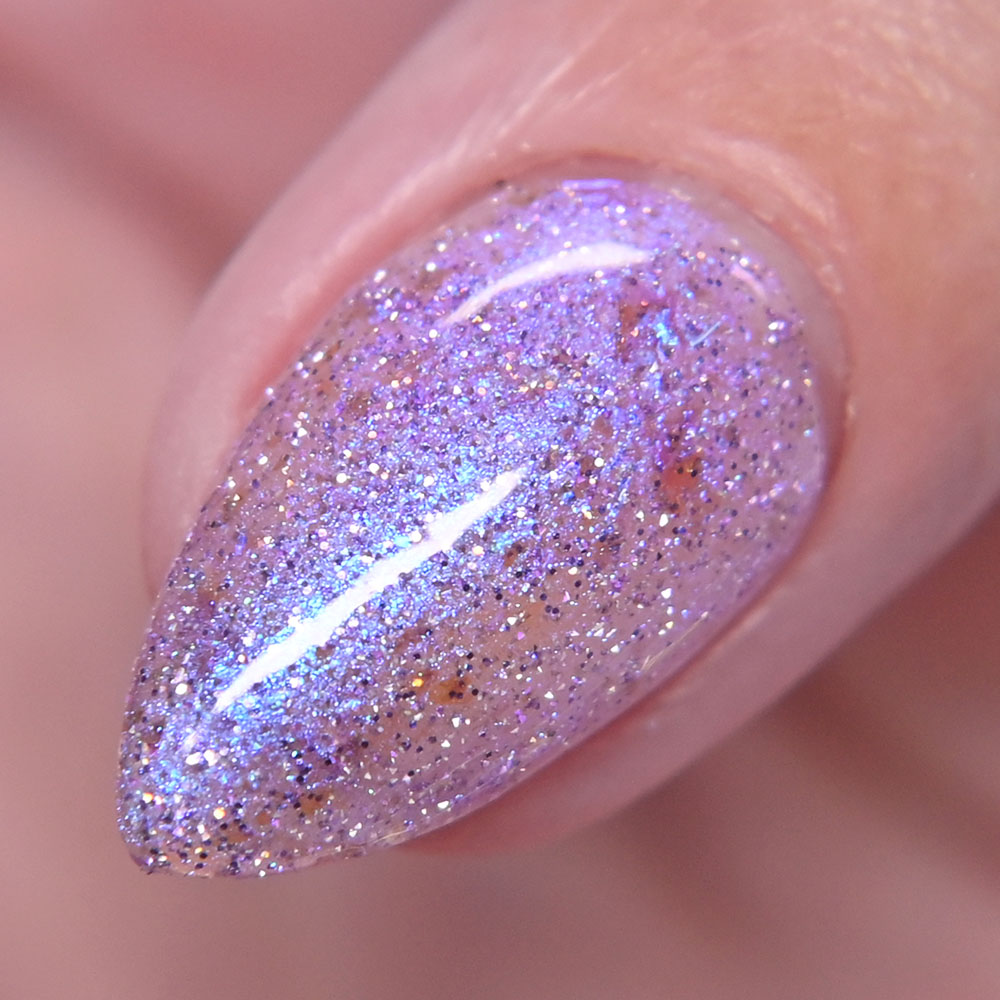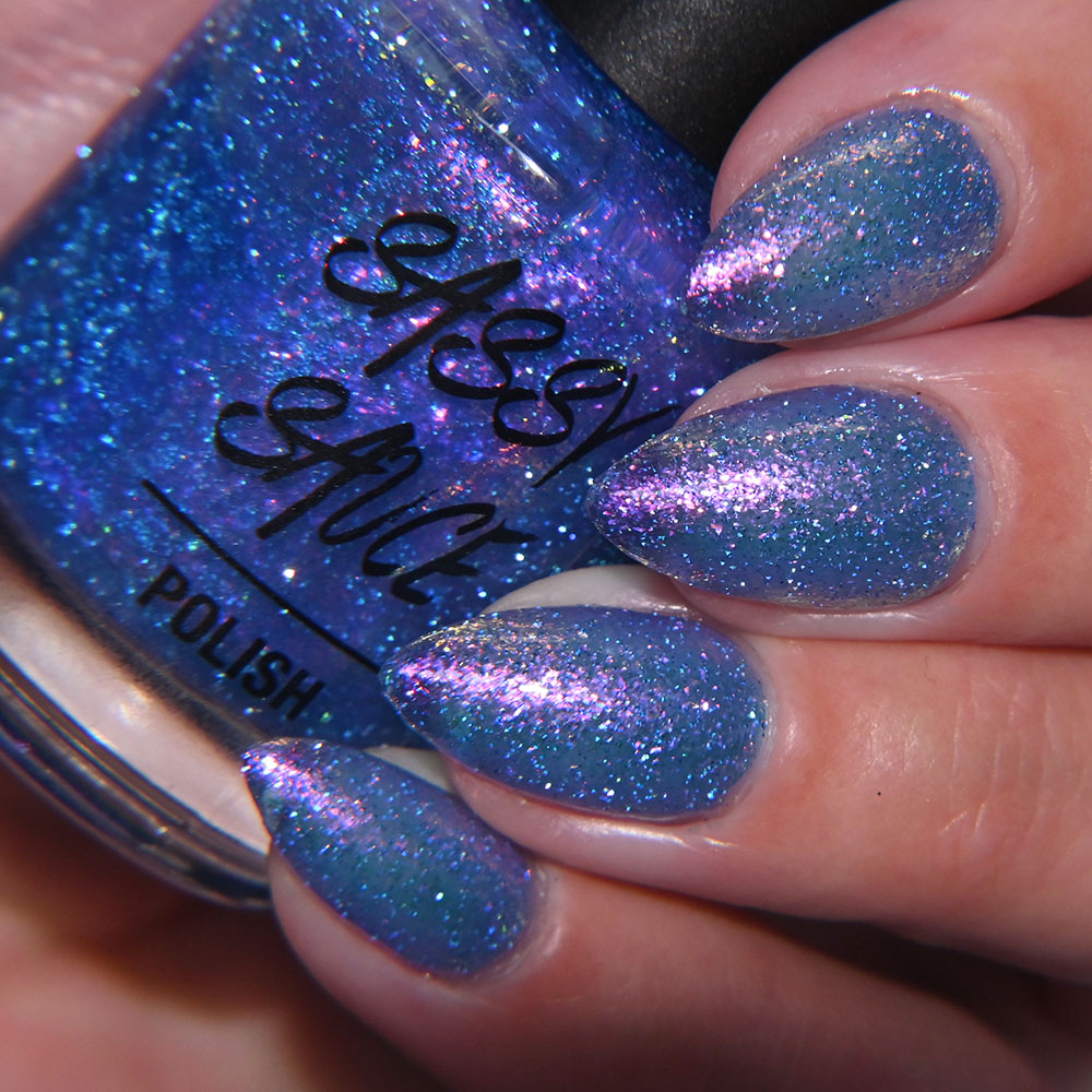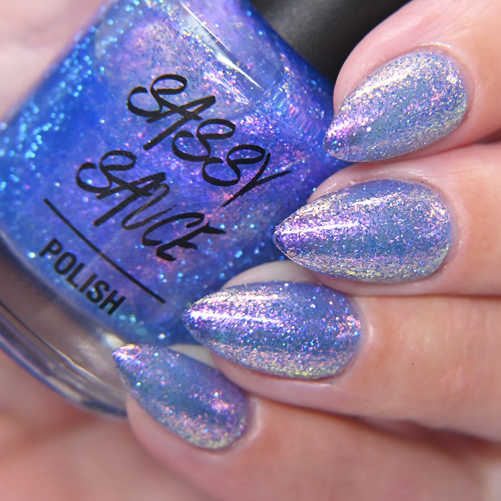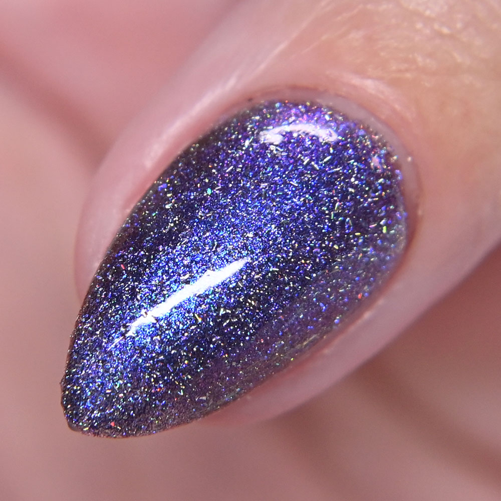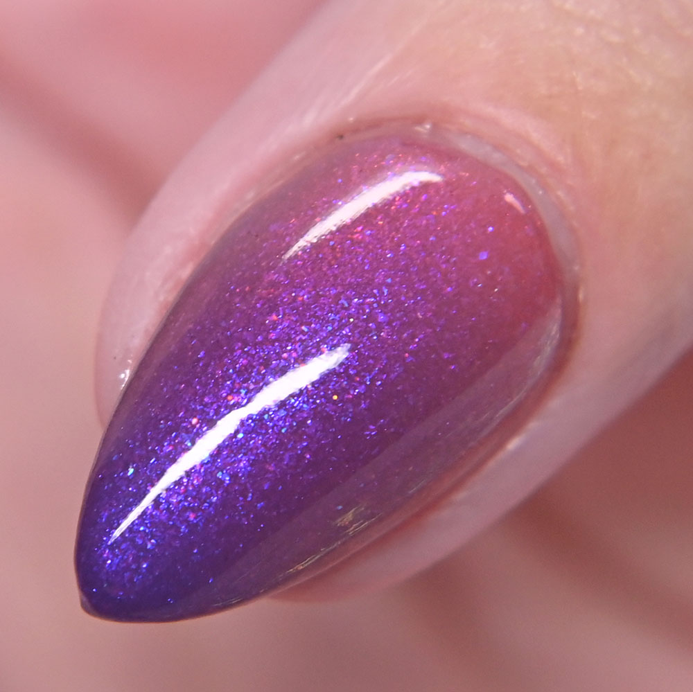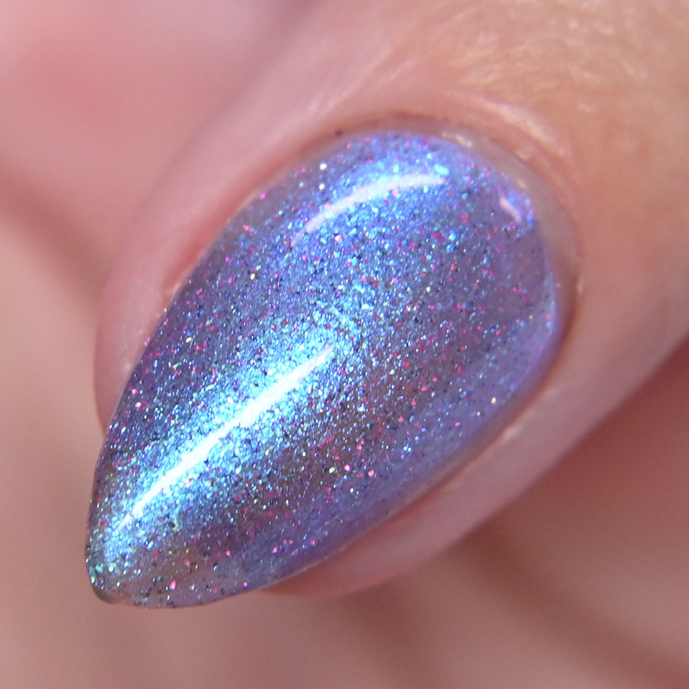 Description: Sin-derella ias a lightly blue tinted base with blue reflective and large particle purple to pink to gold to green shifting shimmer.