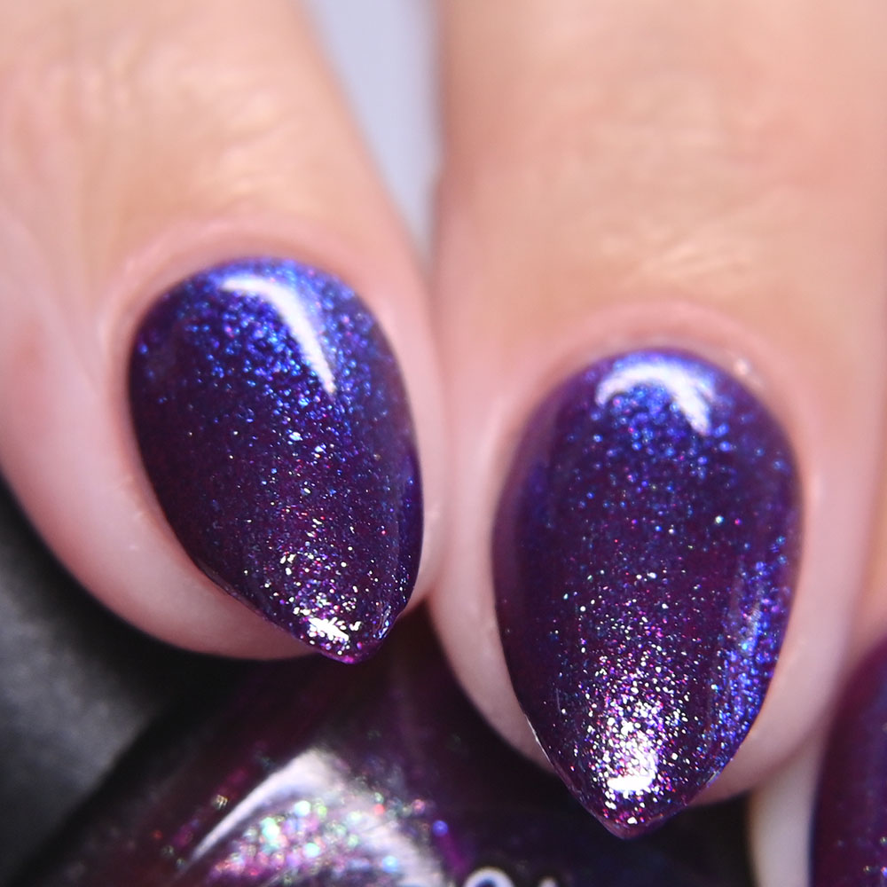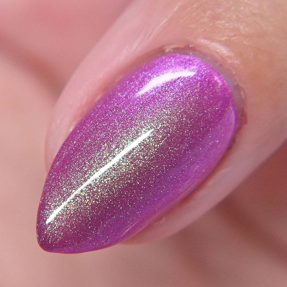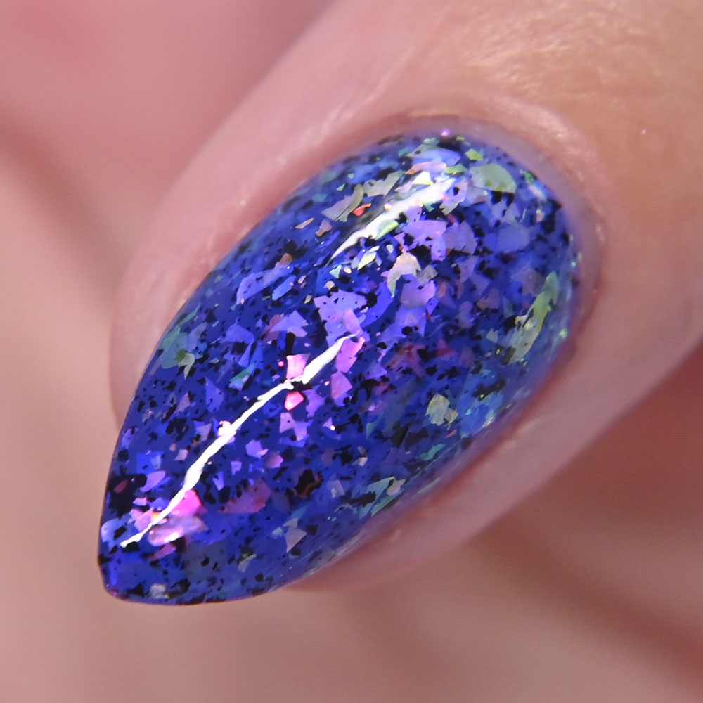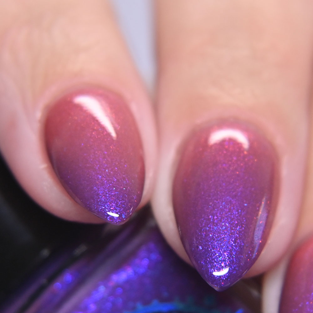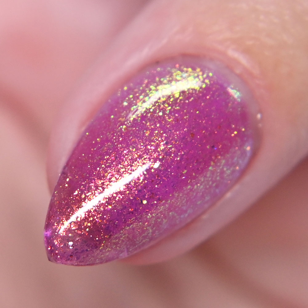 Description: Sin-derella ias a lightly blue tinted base with blue reflective and large particle purple to pink to gold to green shifting shimmer.