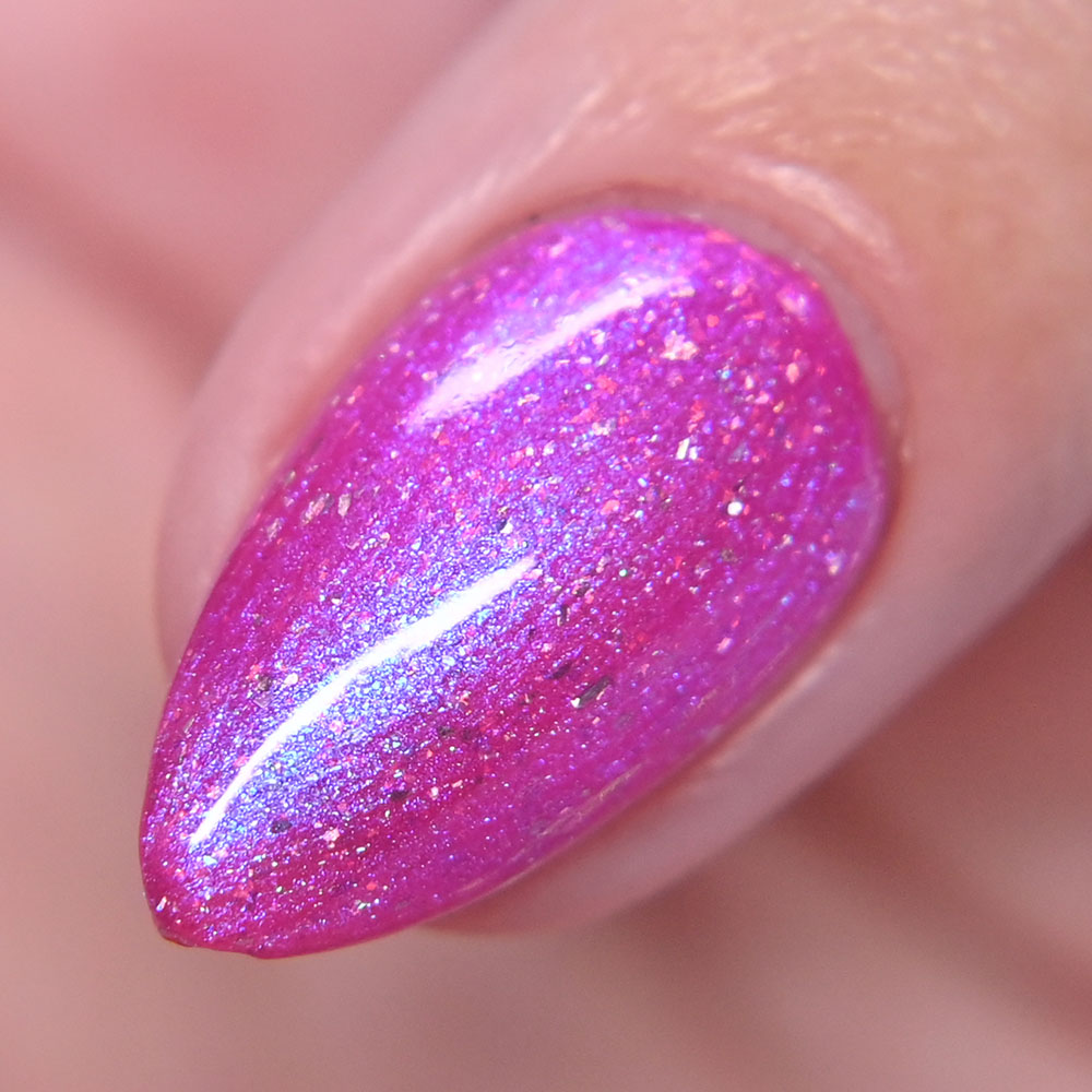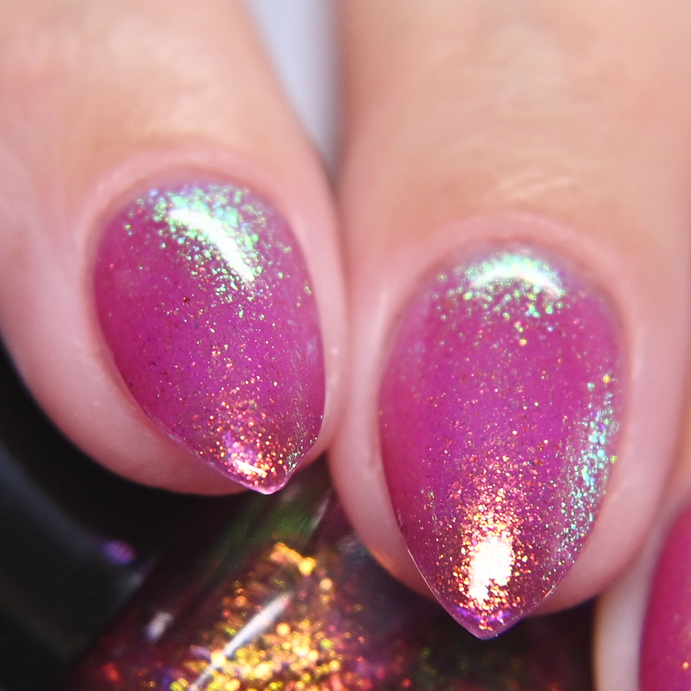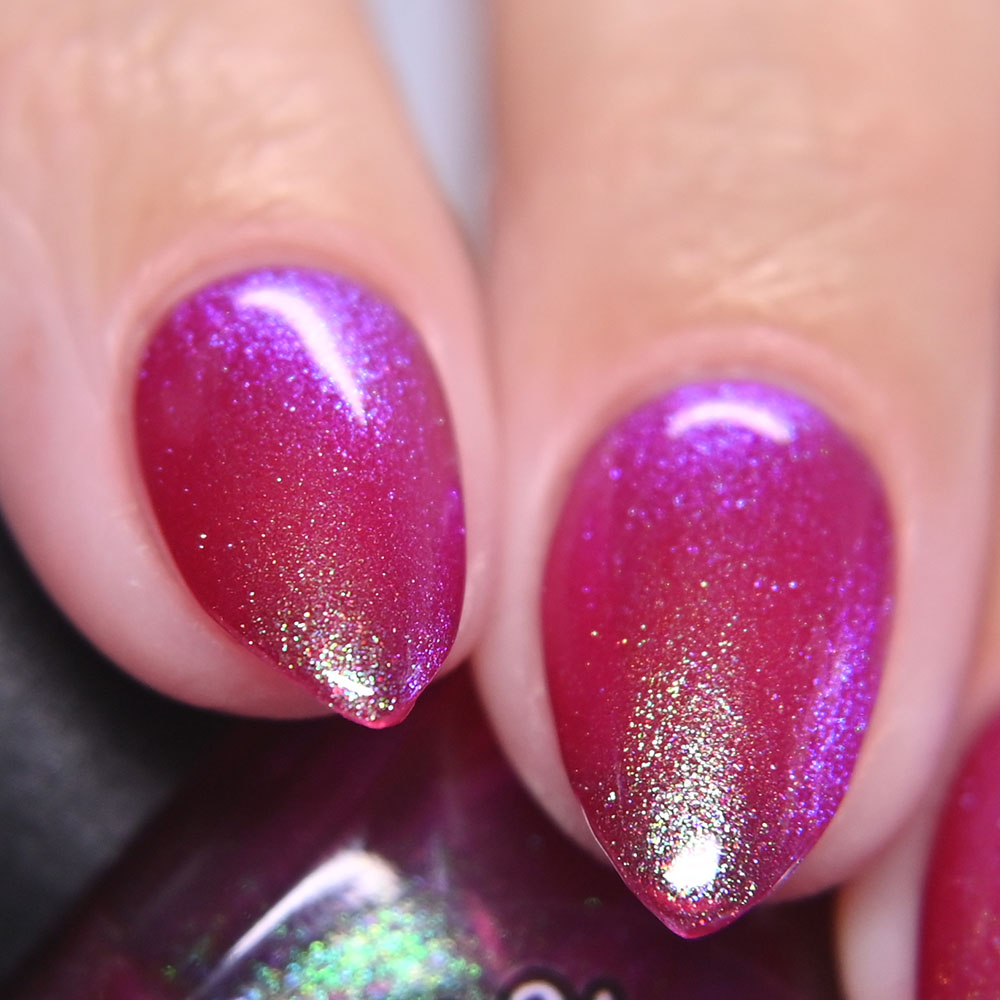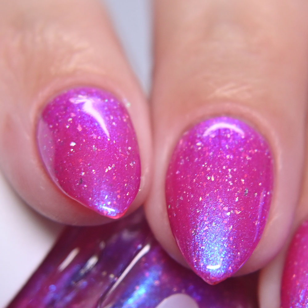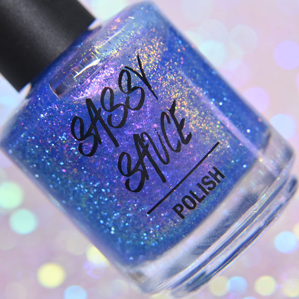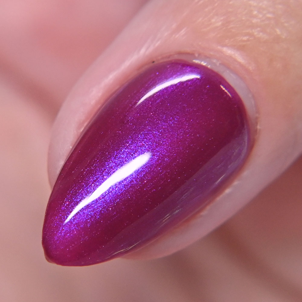 Description: Sin-derella ias a lightly blue tinted base with blue reflective and large particle purple to pink to gold to green shifting shimmer.