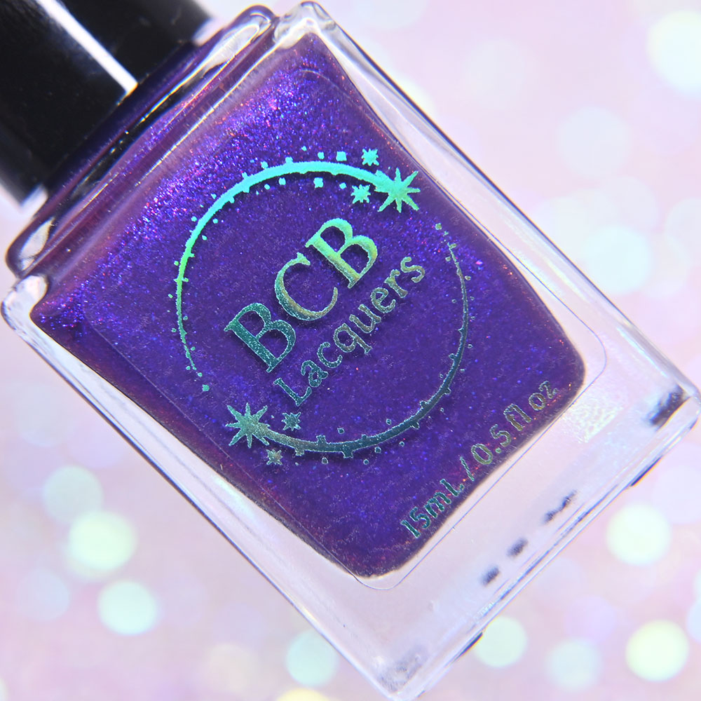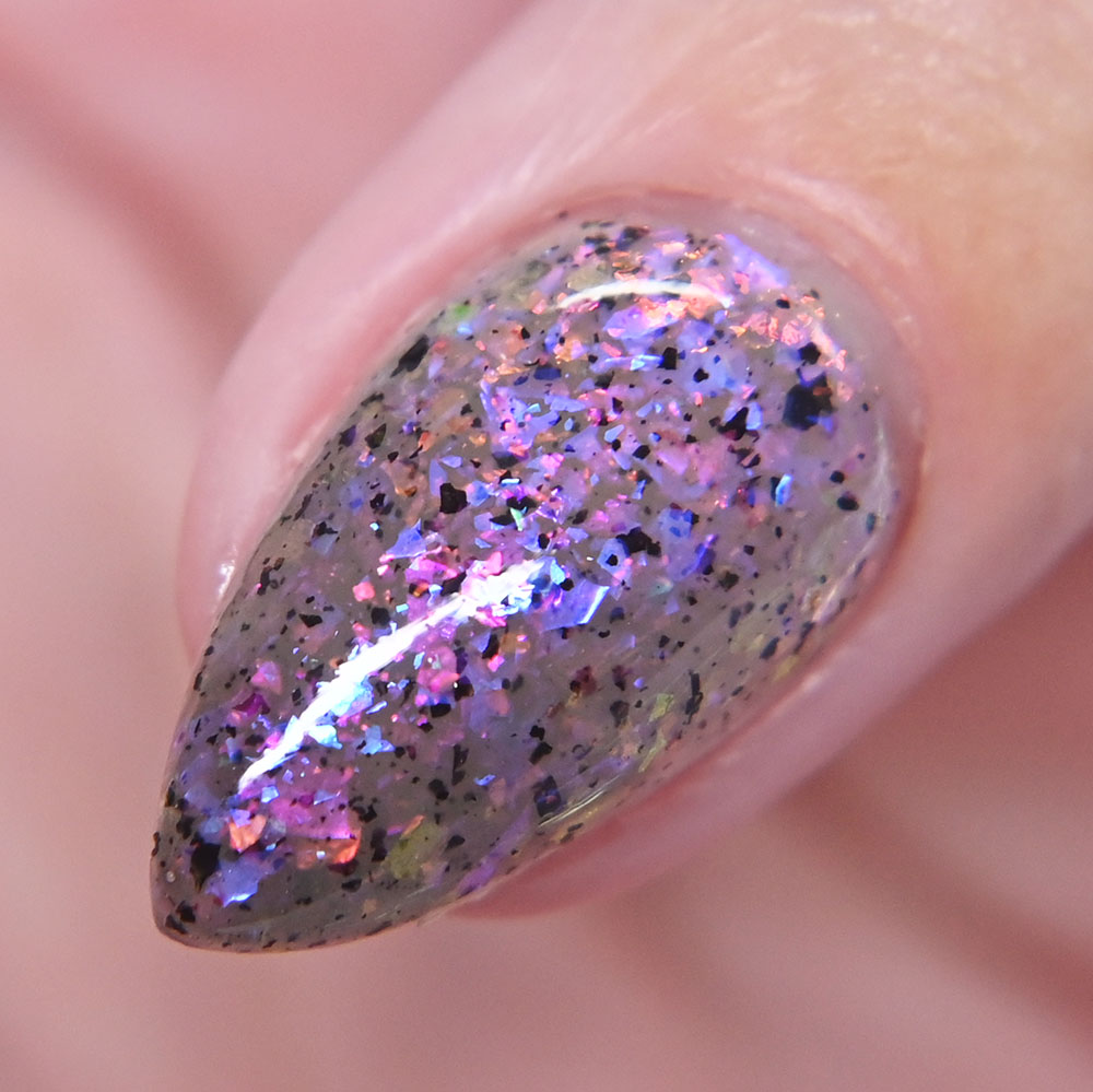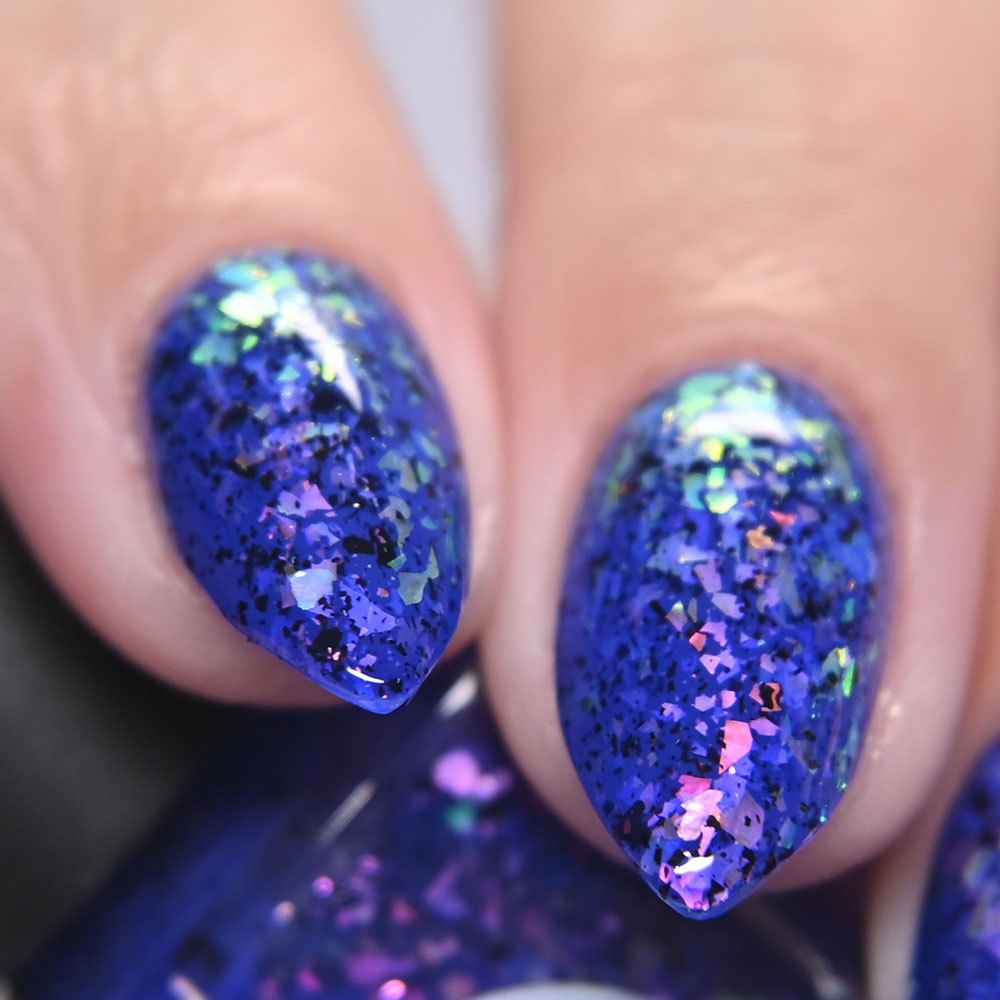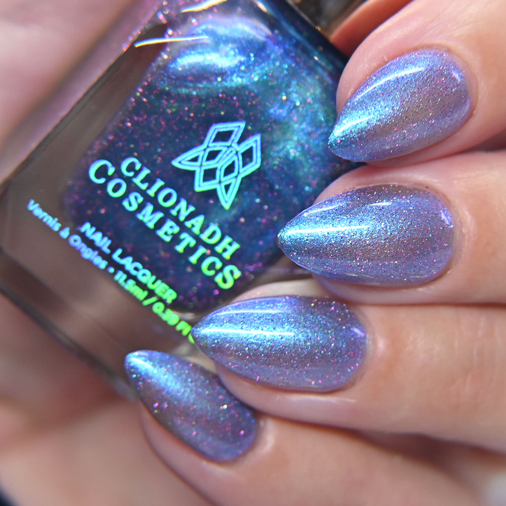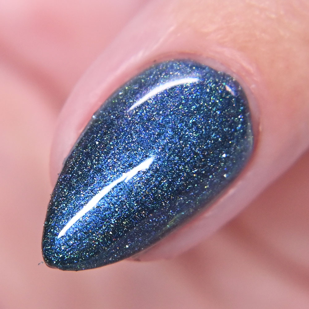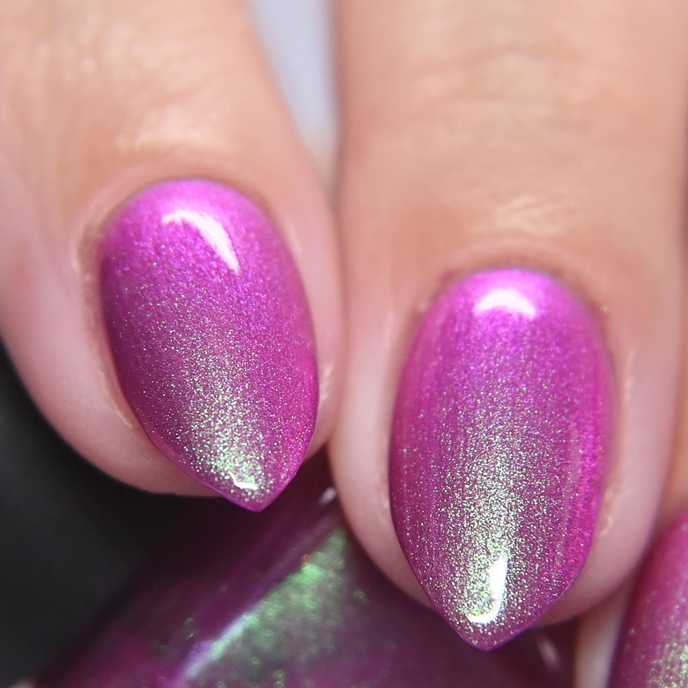 Description: Sin-derella ias a lightly blue tinted base with blue reflective and large particle purple to pink to gold to green shifting shimmer.