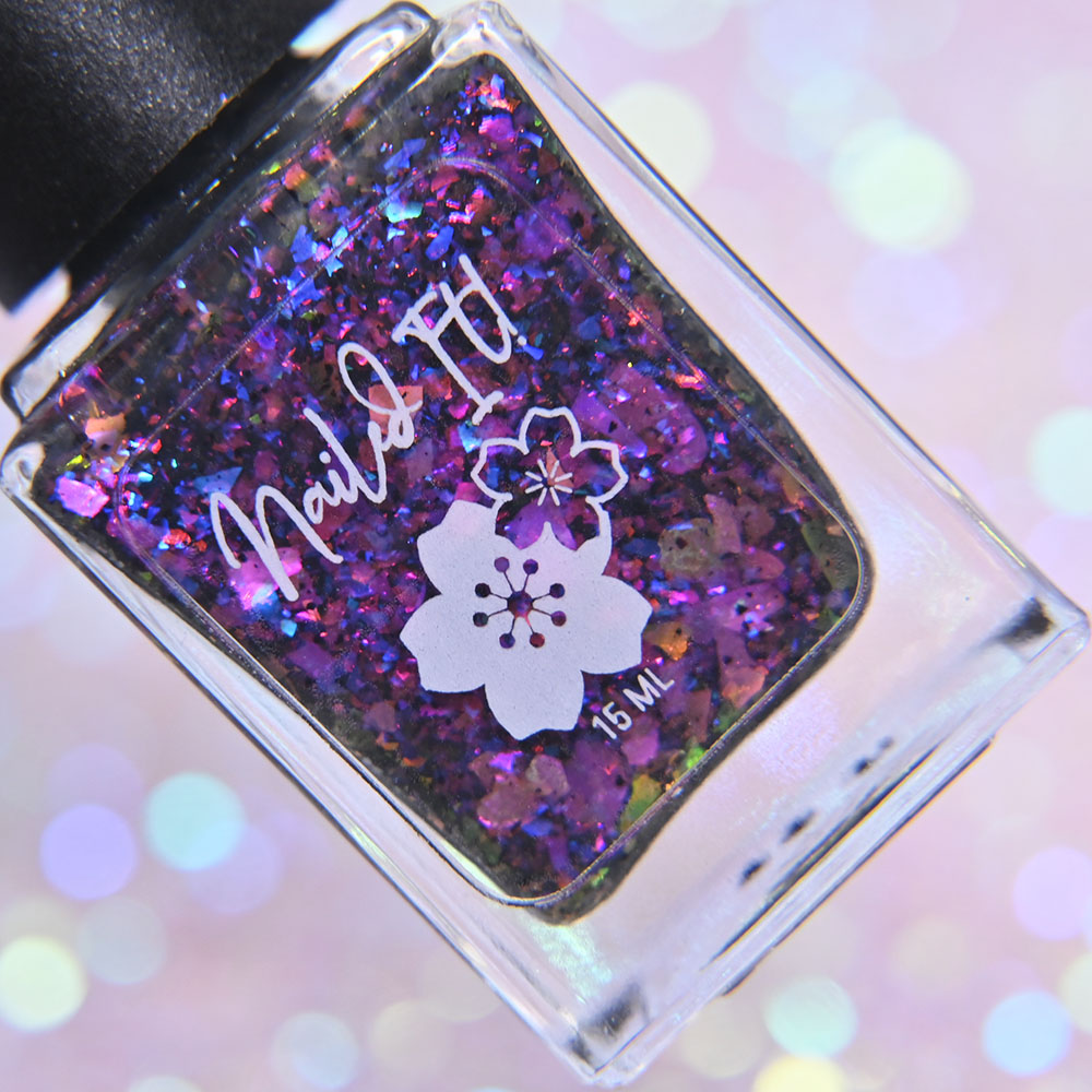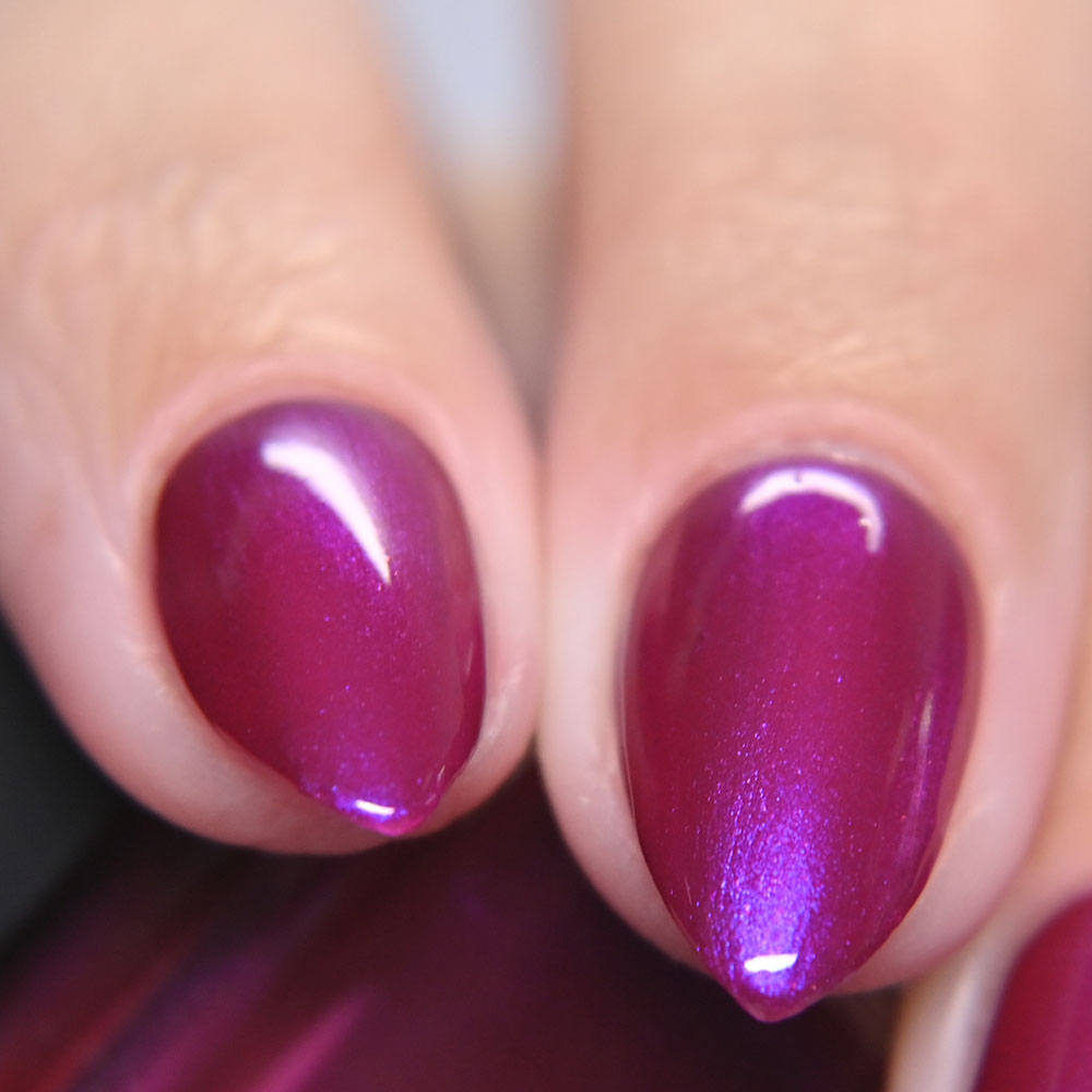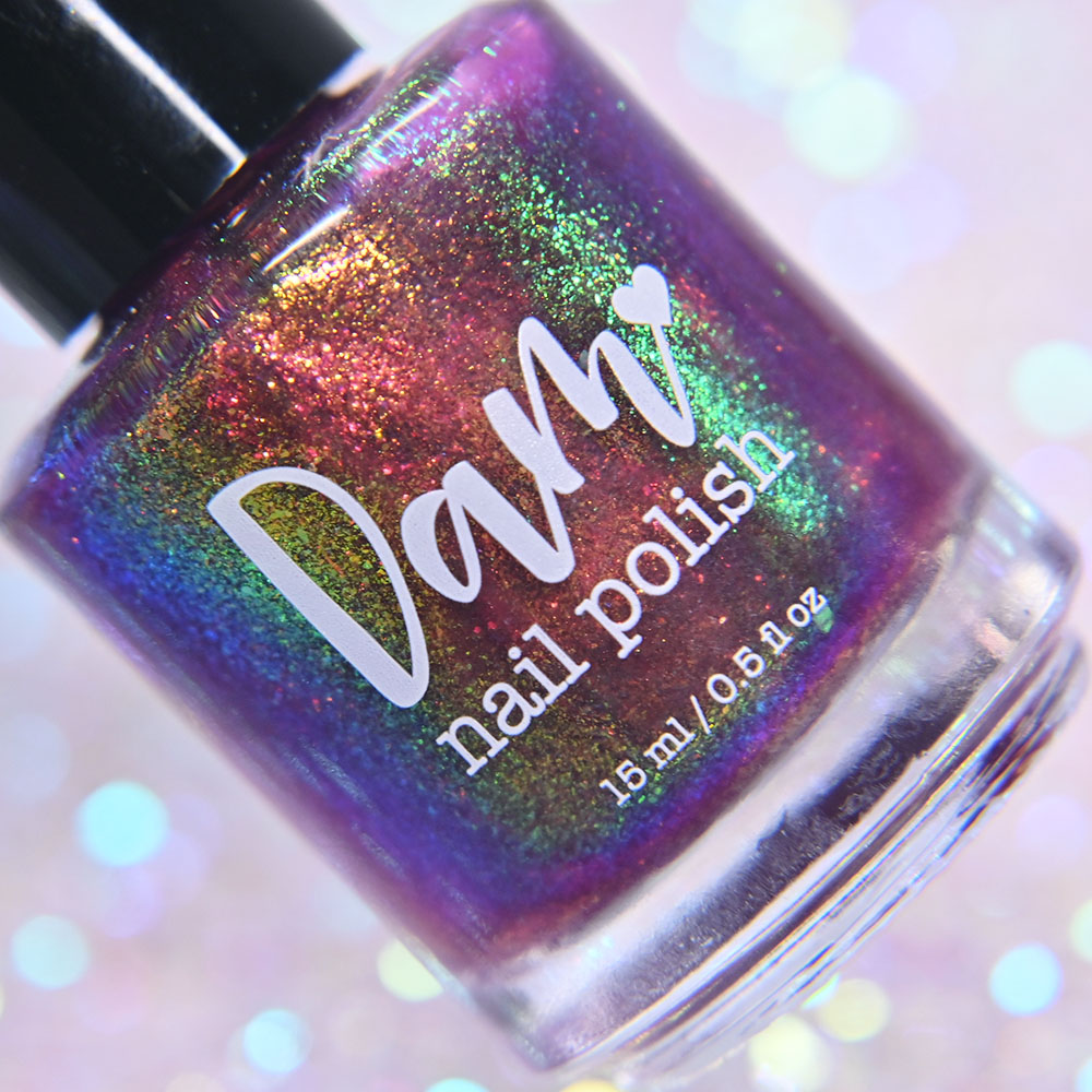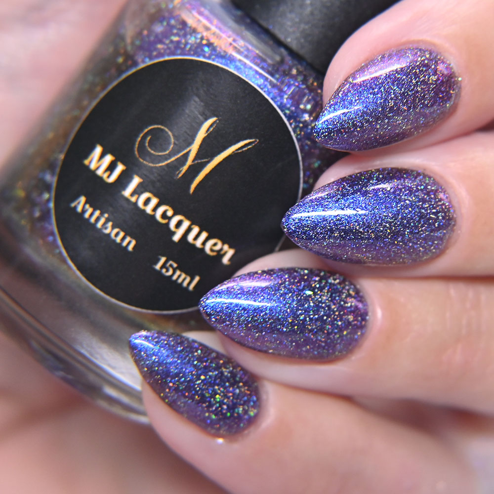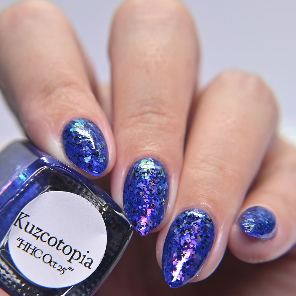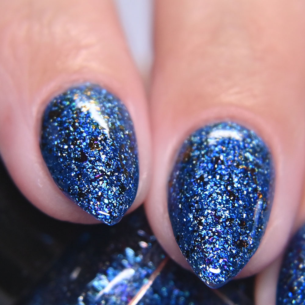 Description: Sin-derella ias a lightly blue tinted base with blue reflective and large particle purple to pink to gold to green shifting shimmer.