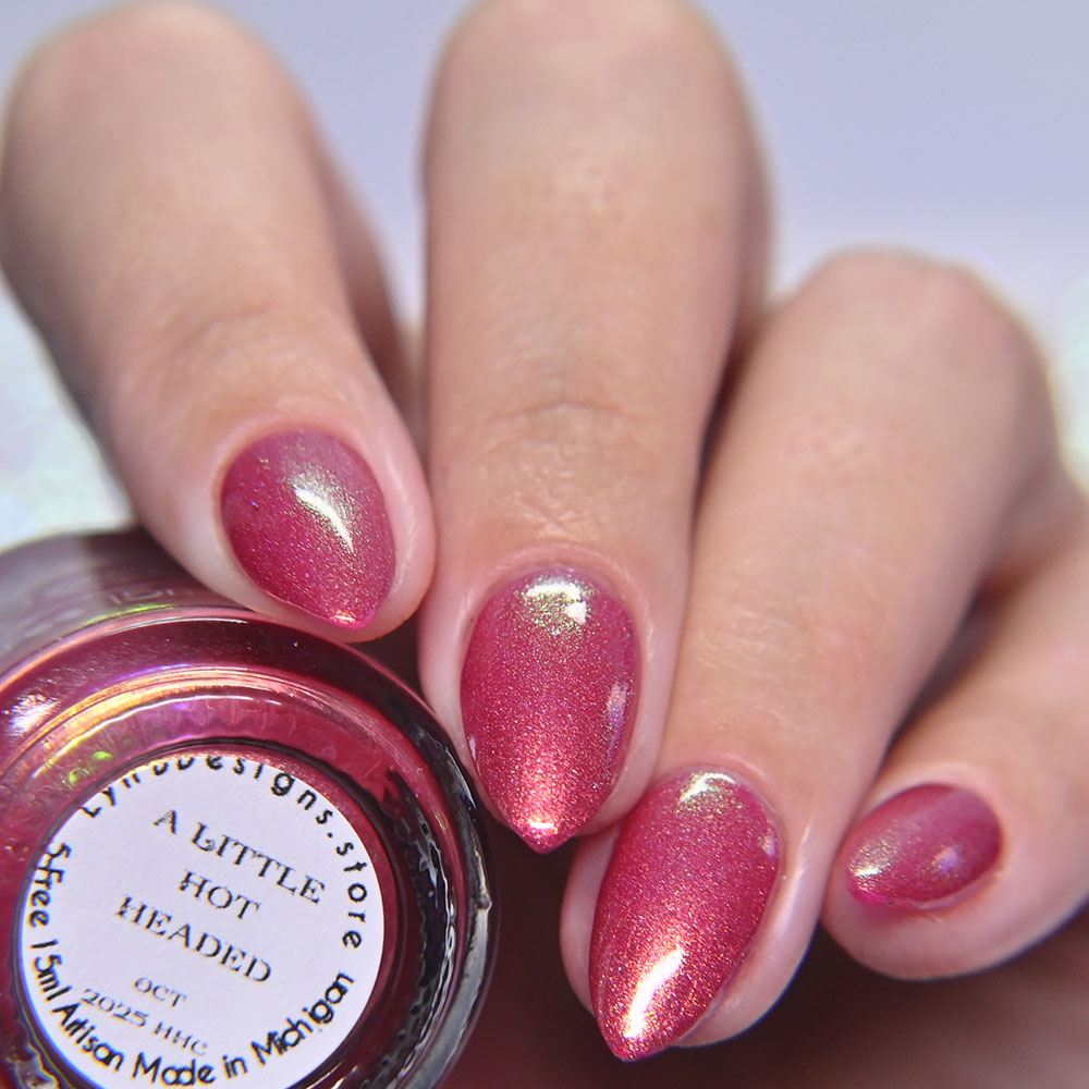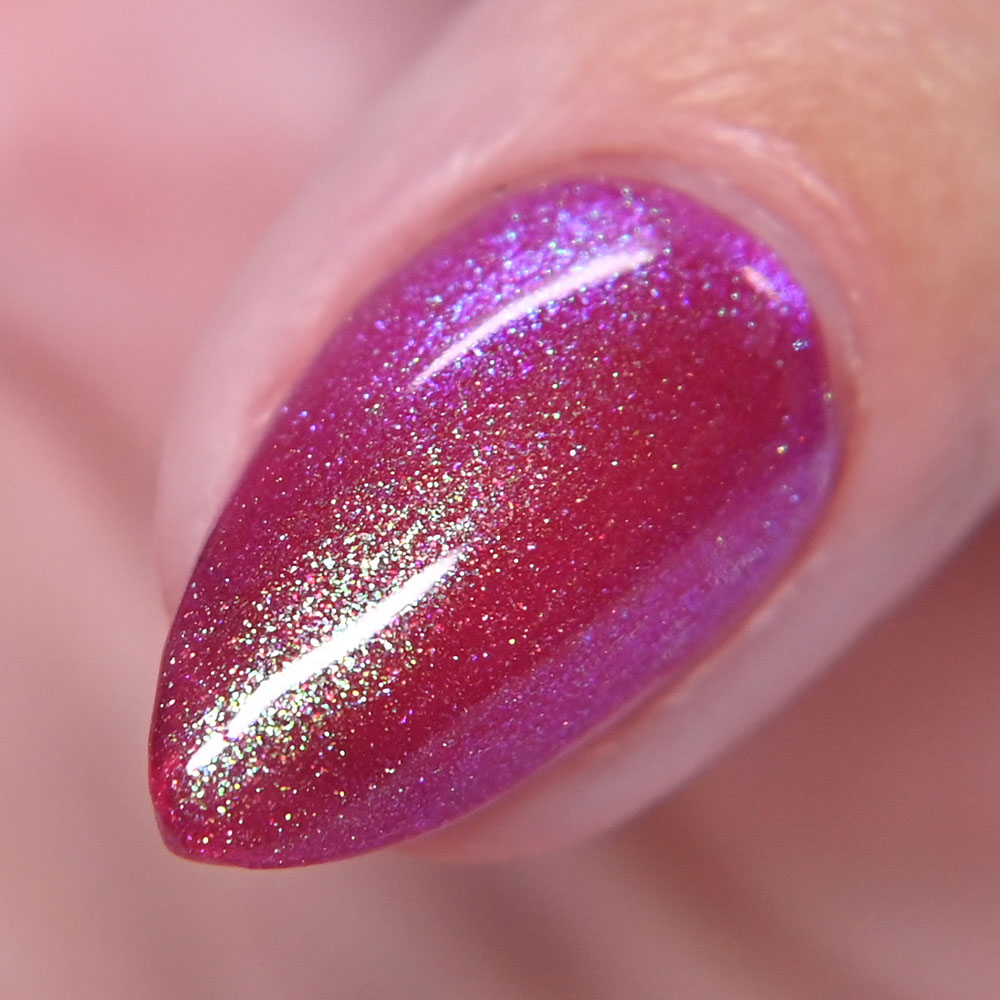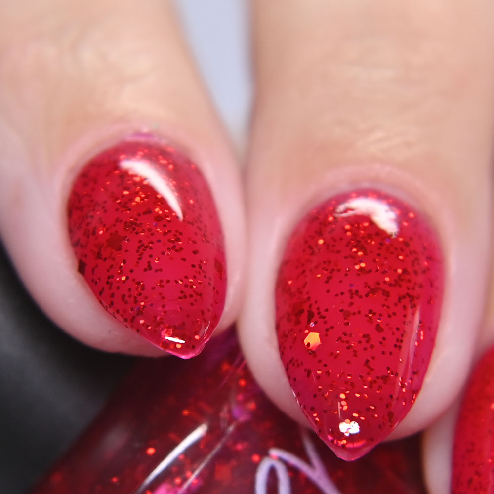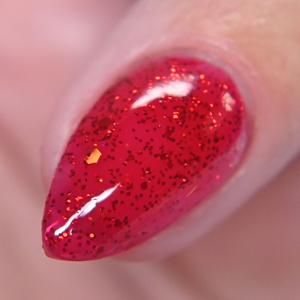 Description: A Little Hot Headed is a pinky red jelly base with gold to green to blue shifting shimmer and added holo shimmer.