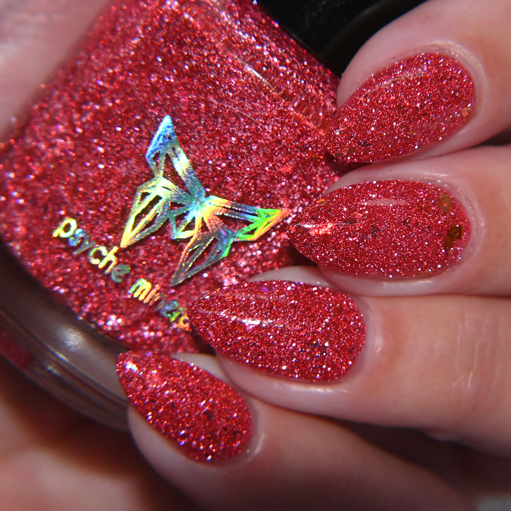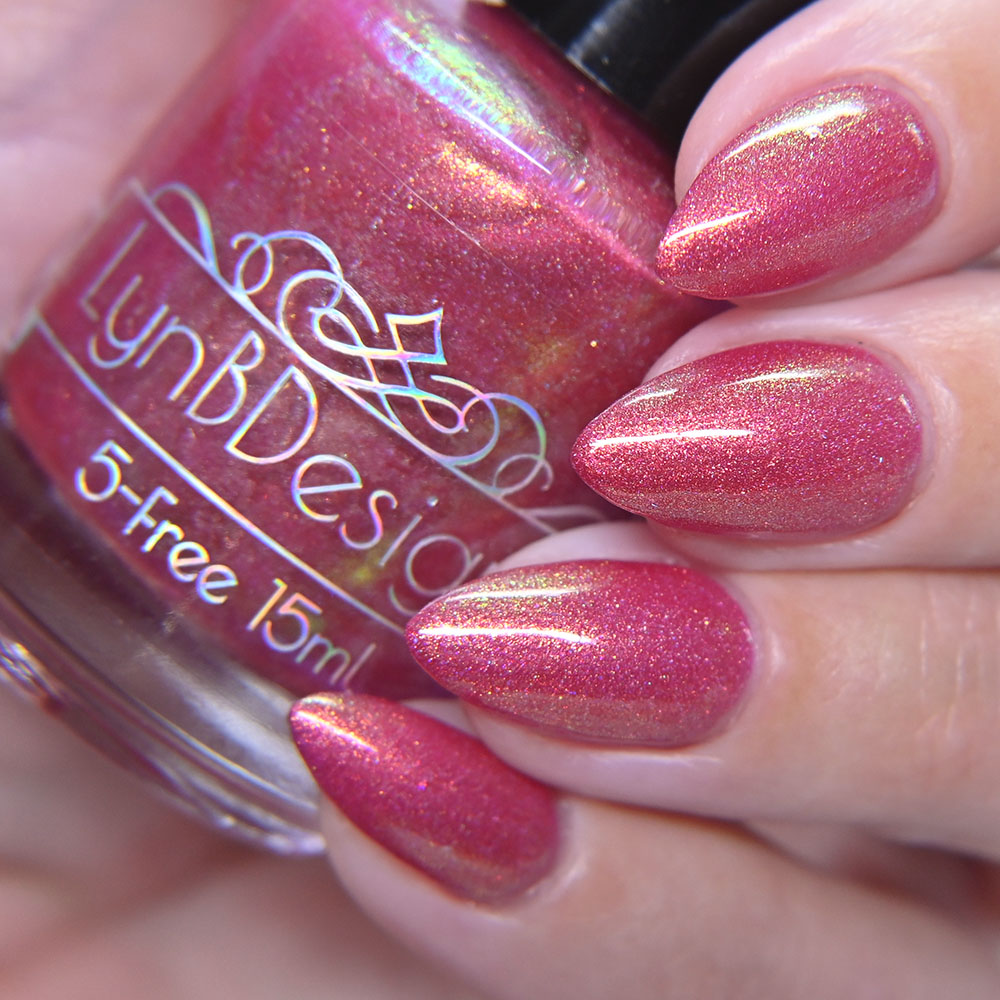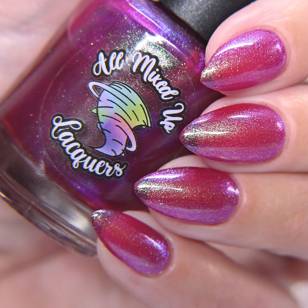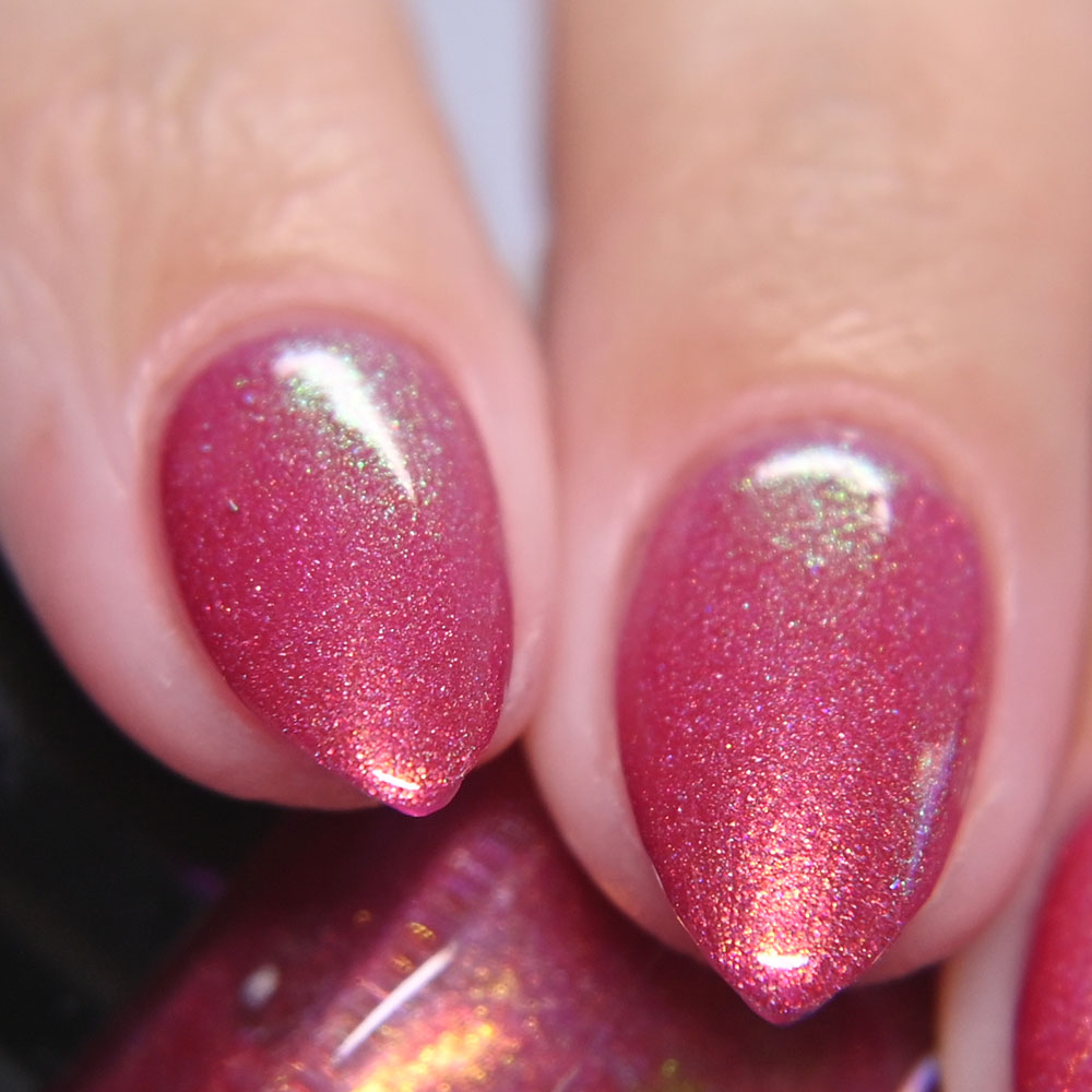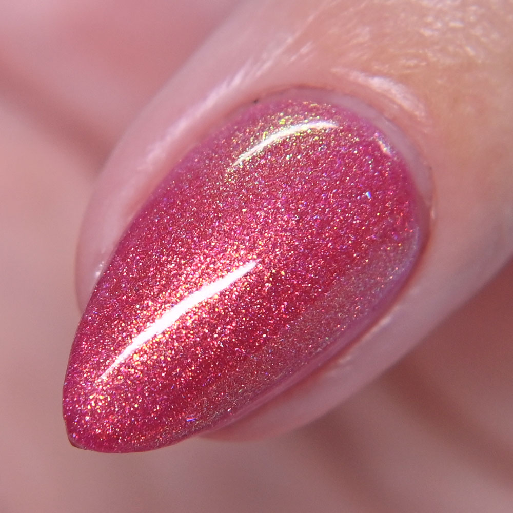 Description: A Little Hot Headed is a pinky red jelly base with gold to green to blue shifting shimmer and added holo shimmer.