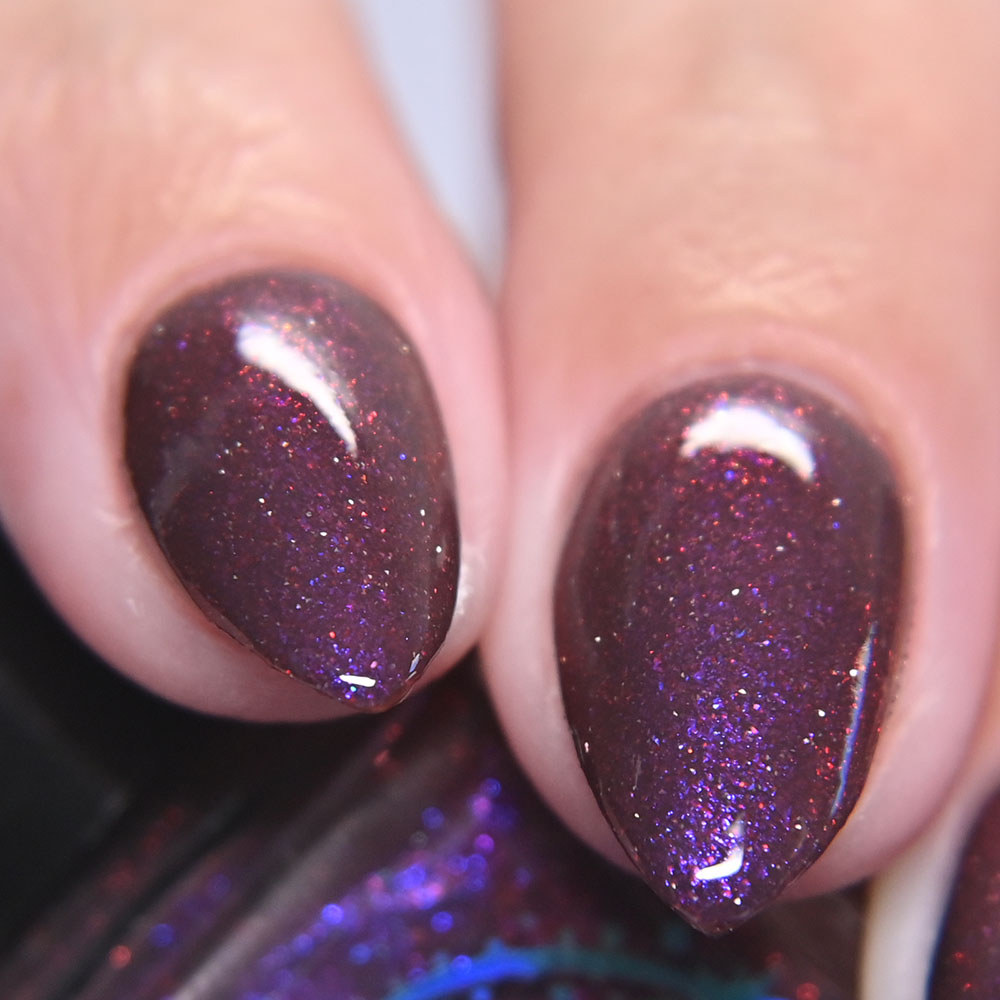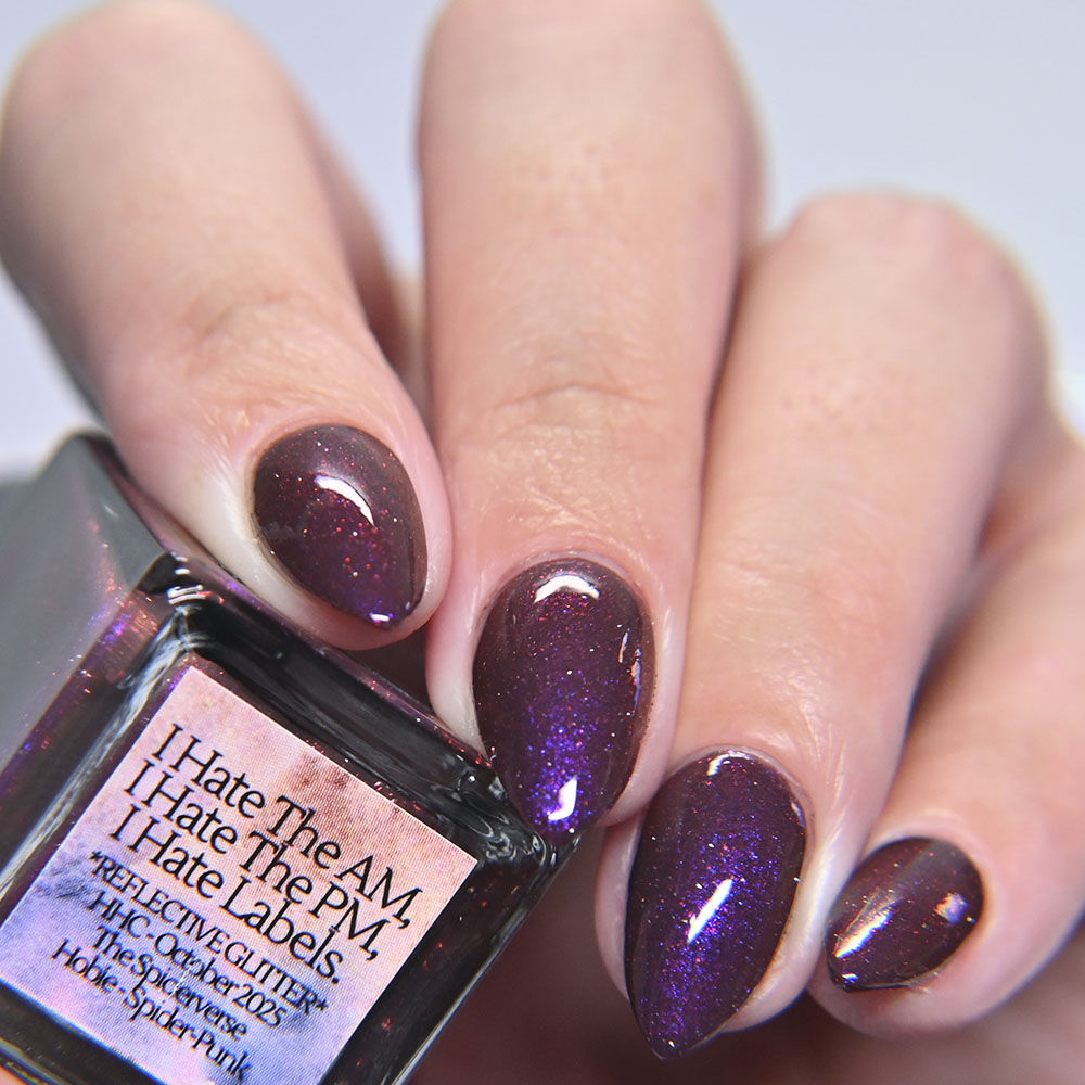Description: I Hate The AM, I Hate The PM, I Hate Labels. is a brown crelly base with a touch of red reflective glitter and a strong purple/blue/pink shifting shimmer.