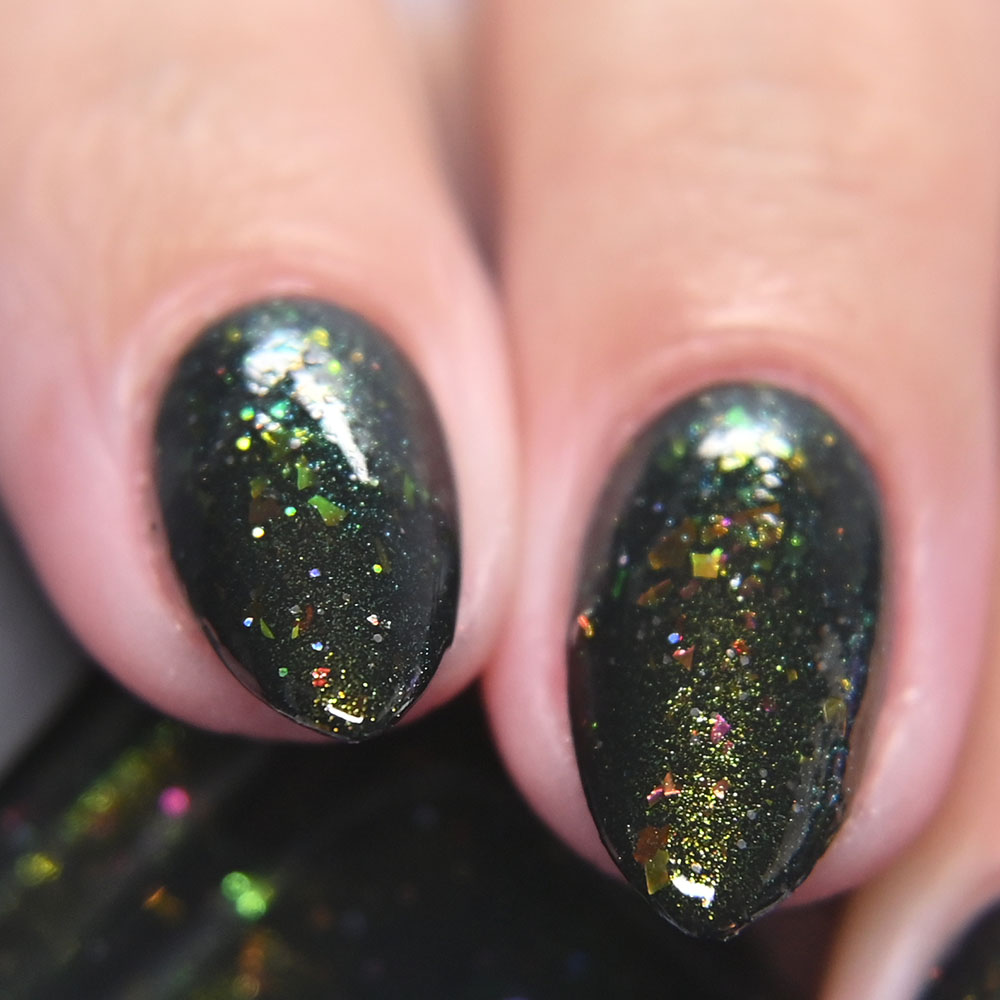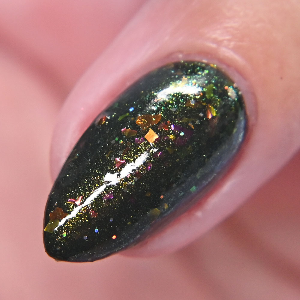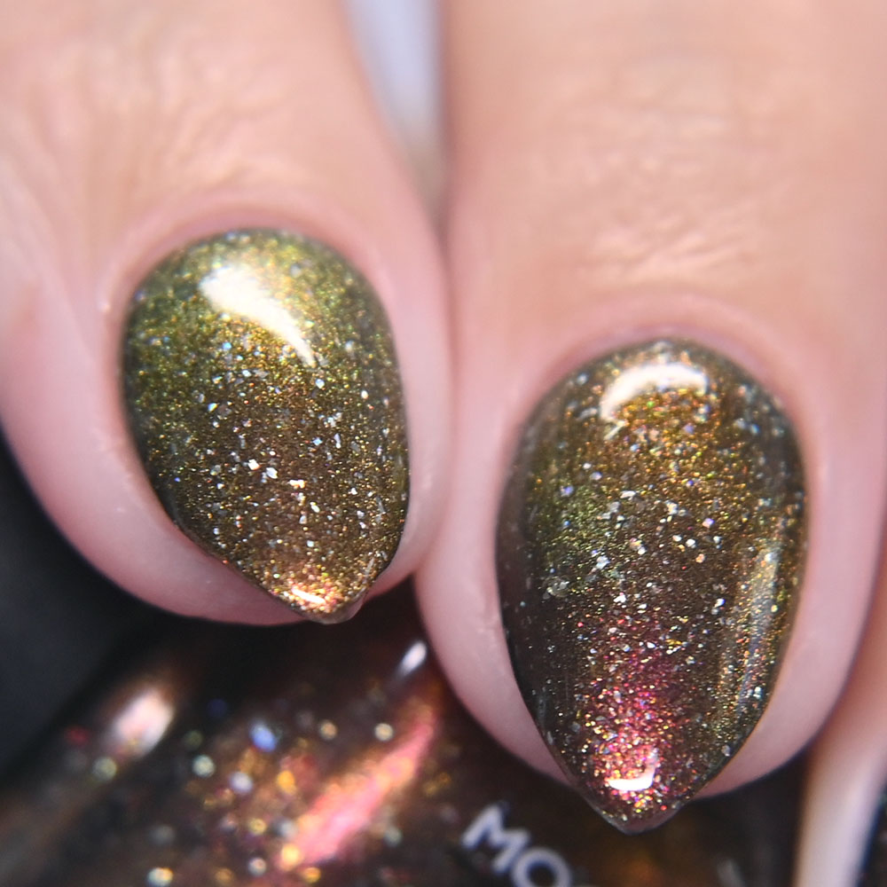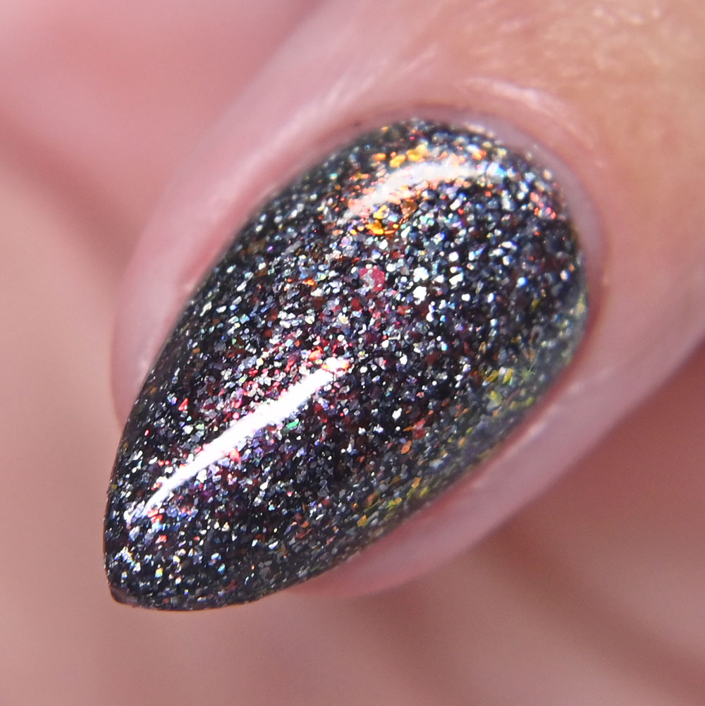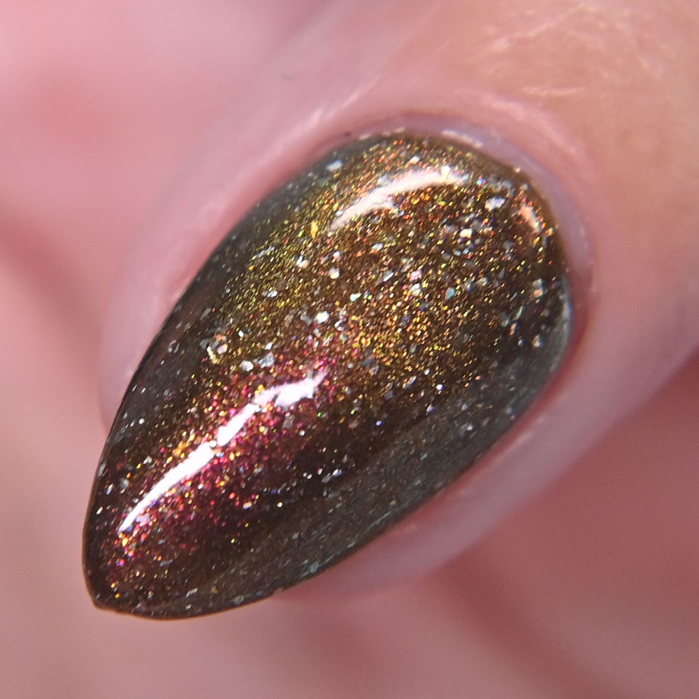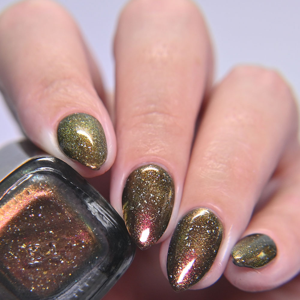Description: Smaug is a smoky charcoal crelly base glowing with red/copper/gold iridescent and multichrome shimmers, lime/gold/aqua magnetic shimmer, holo microflakies and bronze/gold multichrome microflakies.
