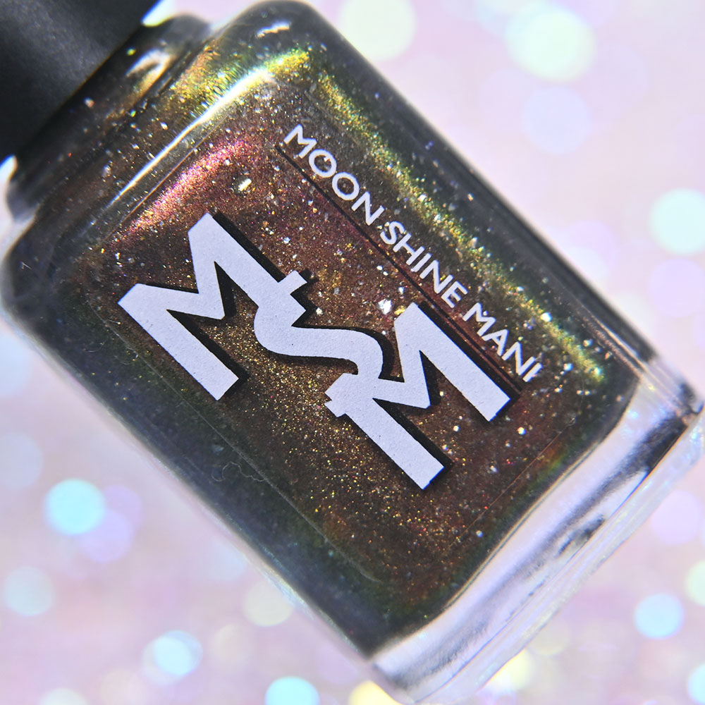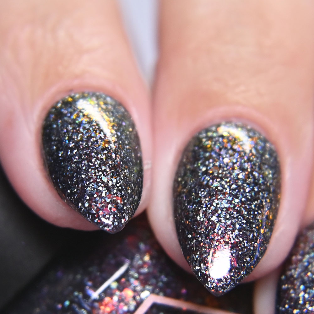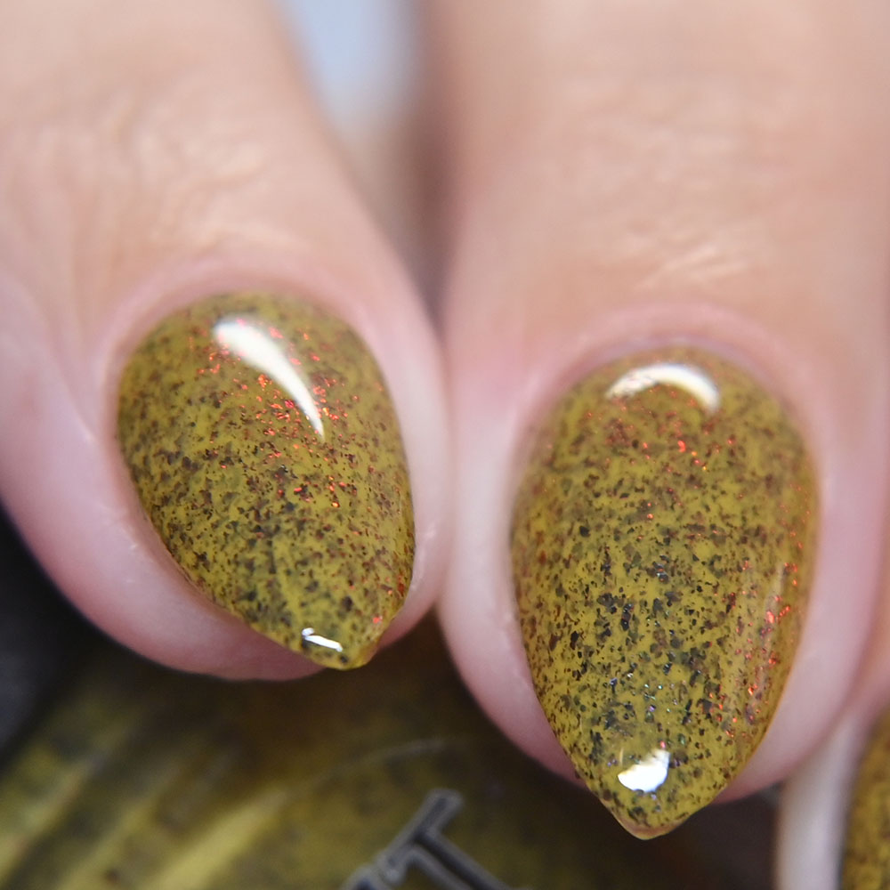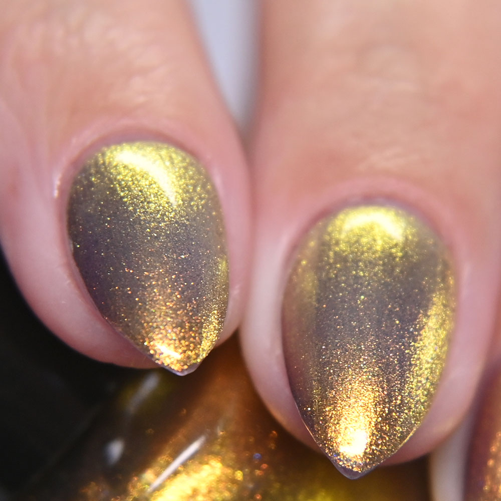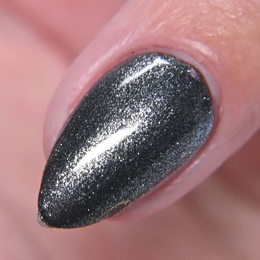 Description: Smaug is a smoky charcoal crelly base glowing with red/copper/gold iridescent and multichrome shimmers, lime/gold/aqua magnetic shimmer, holo microflakies and bronze/gold multichrome microflakies.