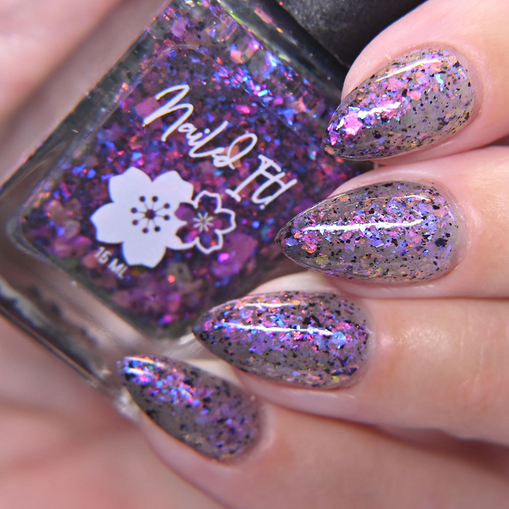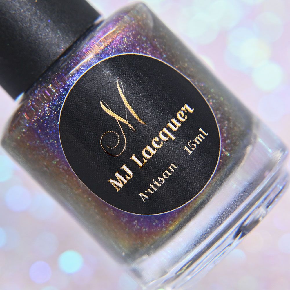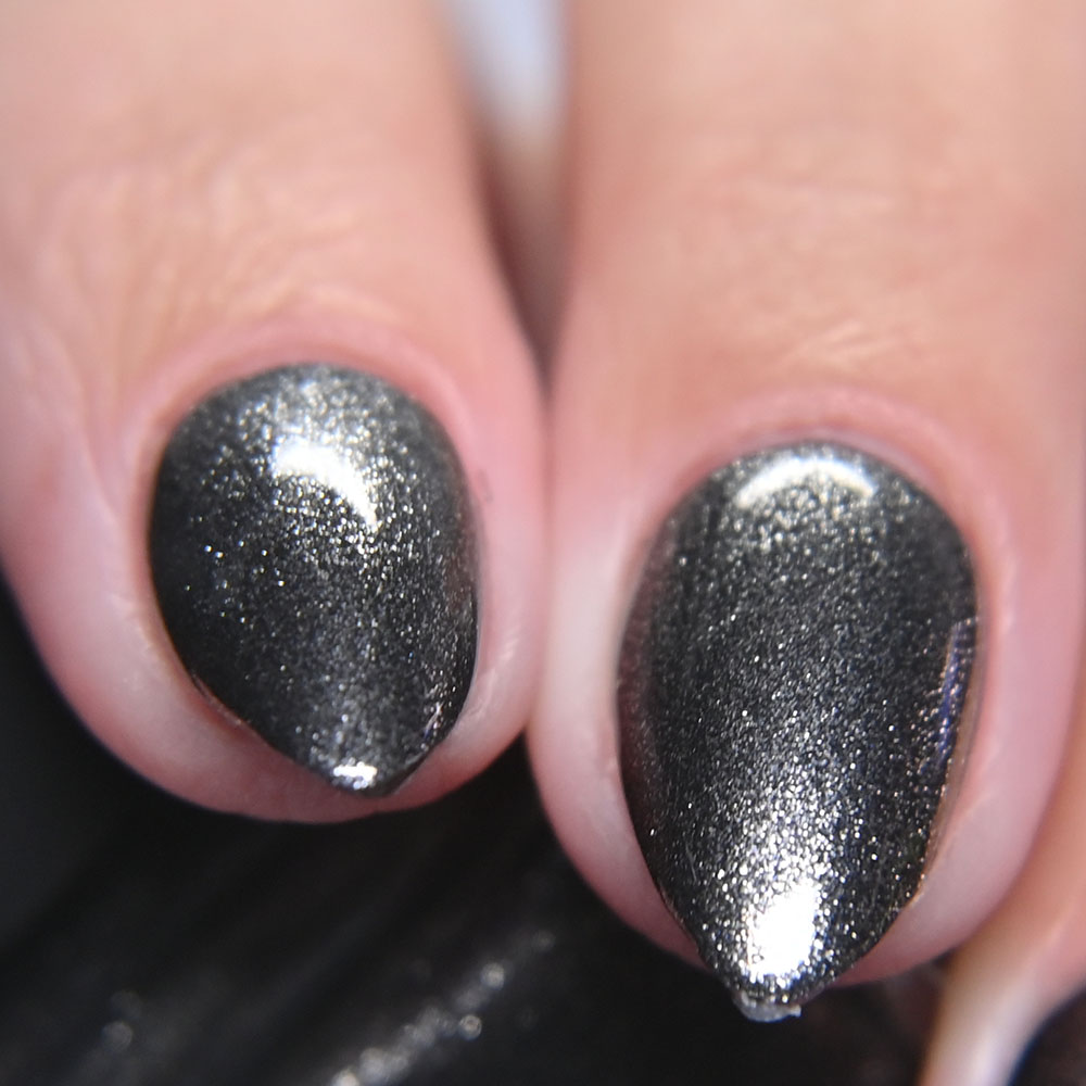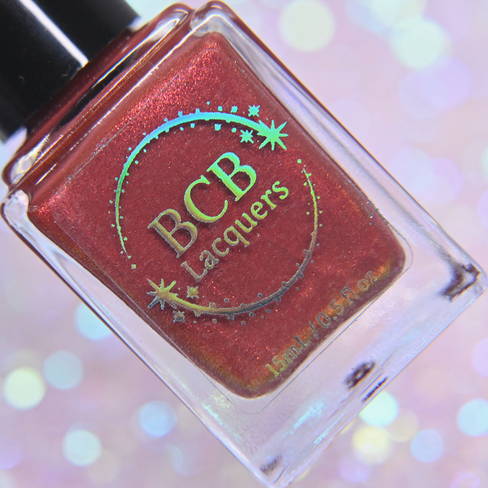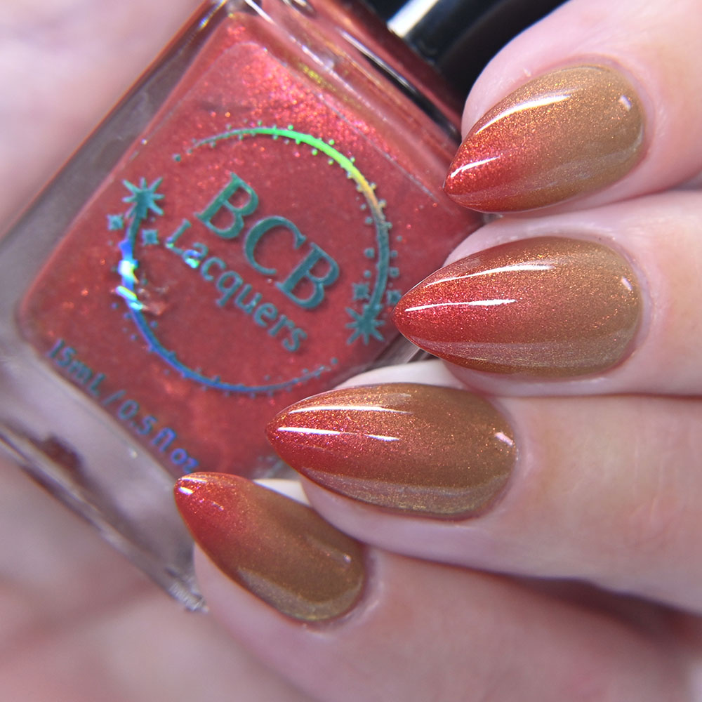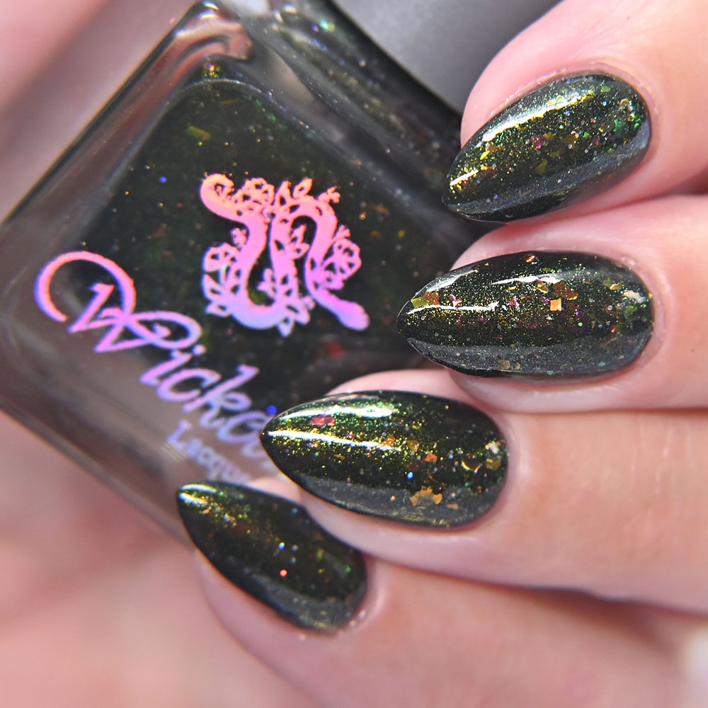 Description: Smaug is a smoky charcoal crelly base glowing with red/copper/gold iridescent and multichrome shimmers, lime/gold/aqua magnetic shimmer, holo microflakies and bronze/gold multichrome microflakies.