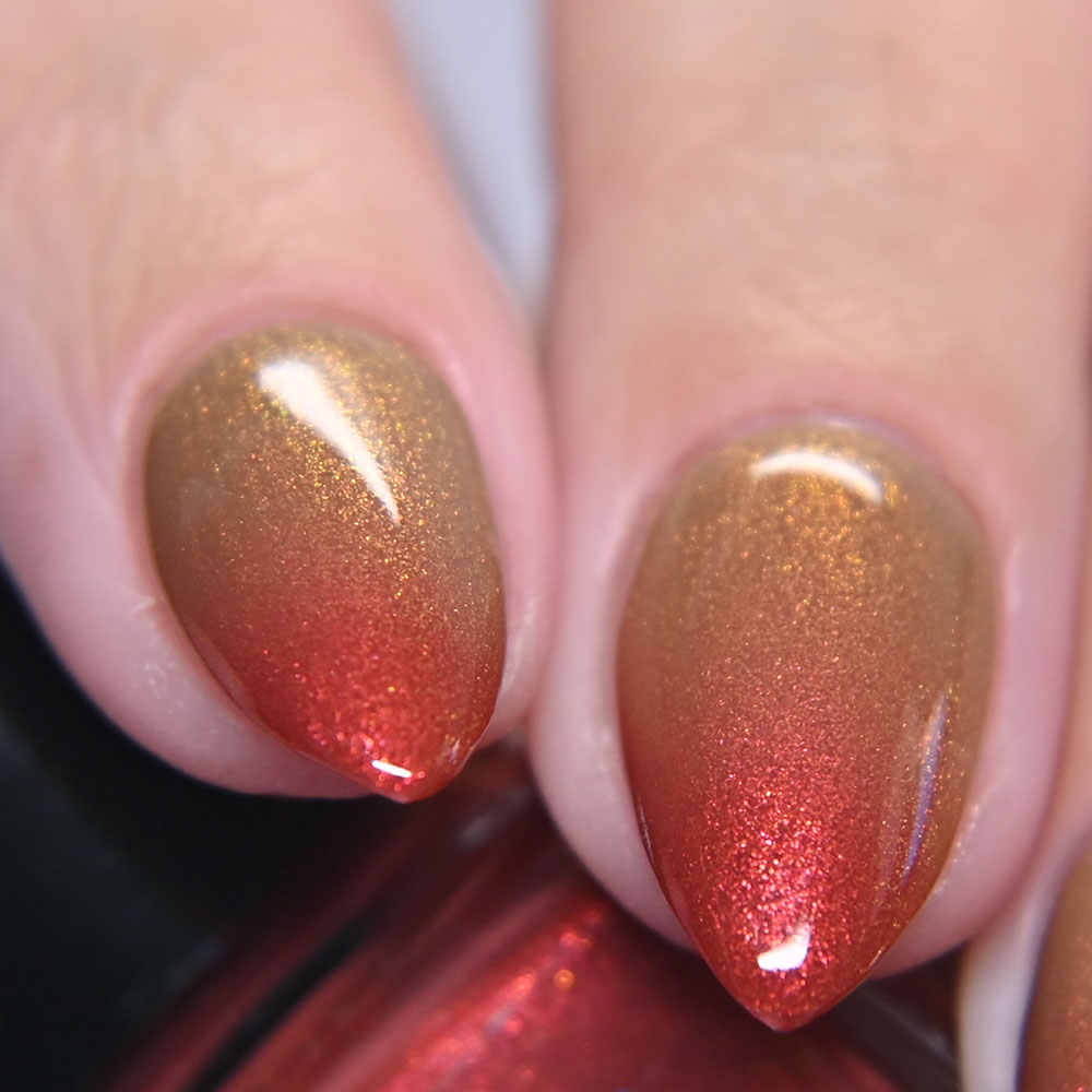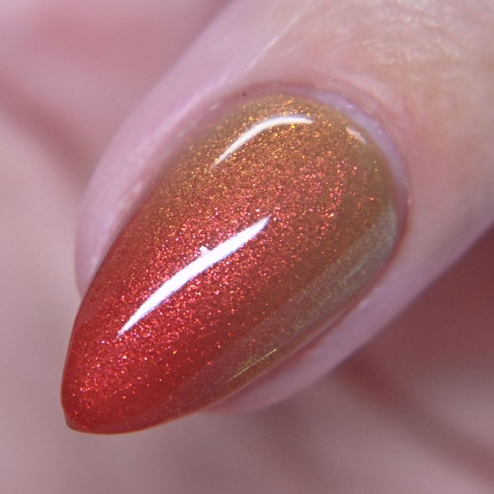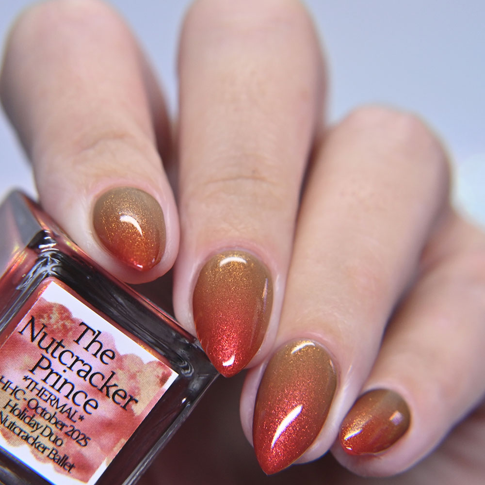 Description: The Nutcracker Prince is a red(cold) to tan(warm) thermal with a red to orange to gold shimmer.