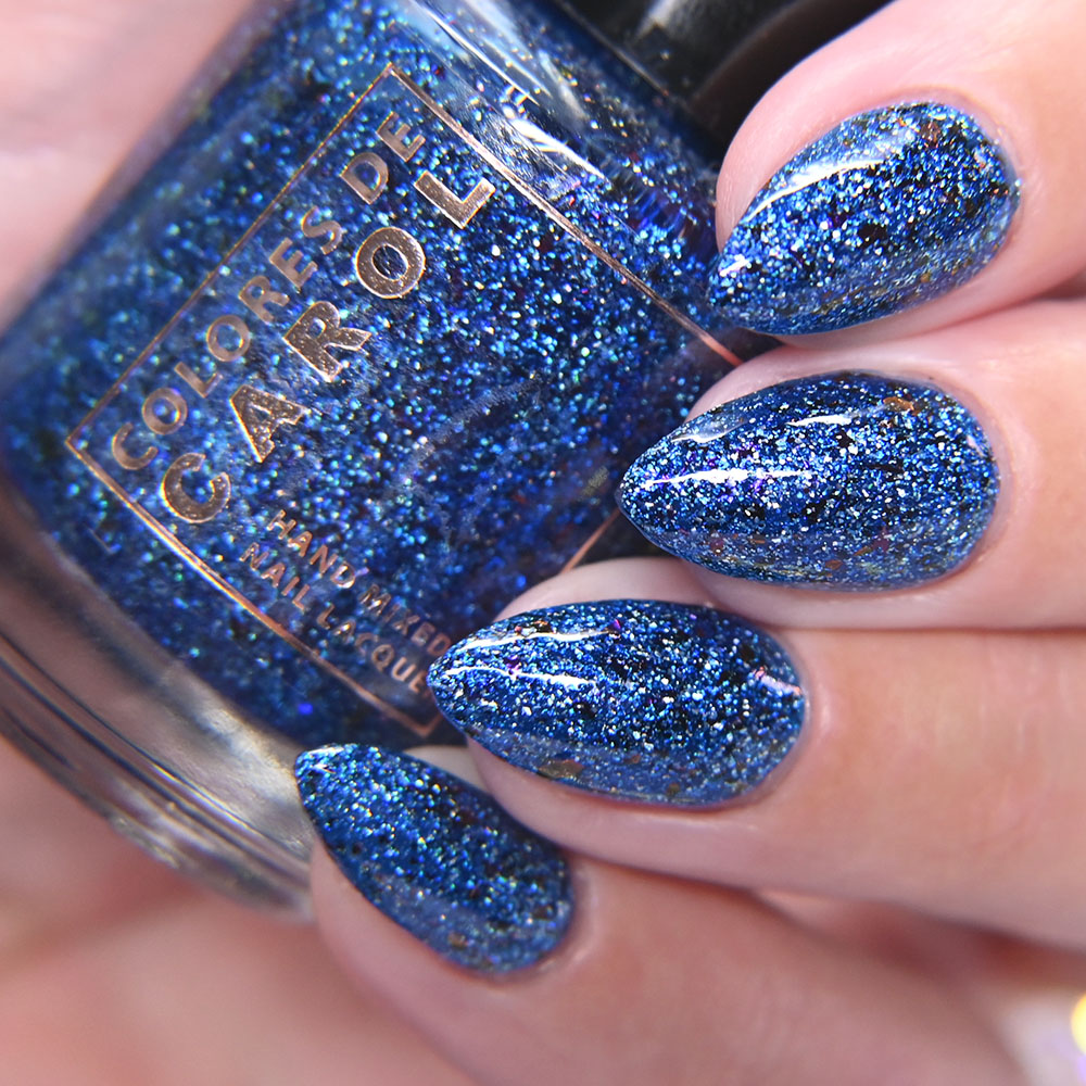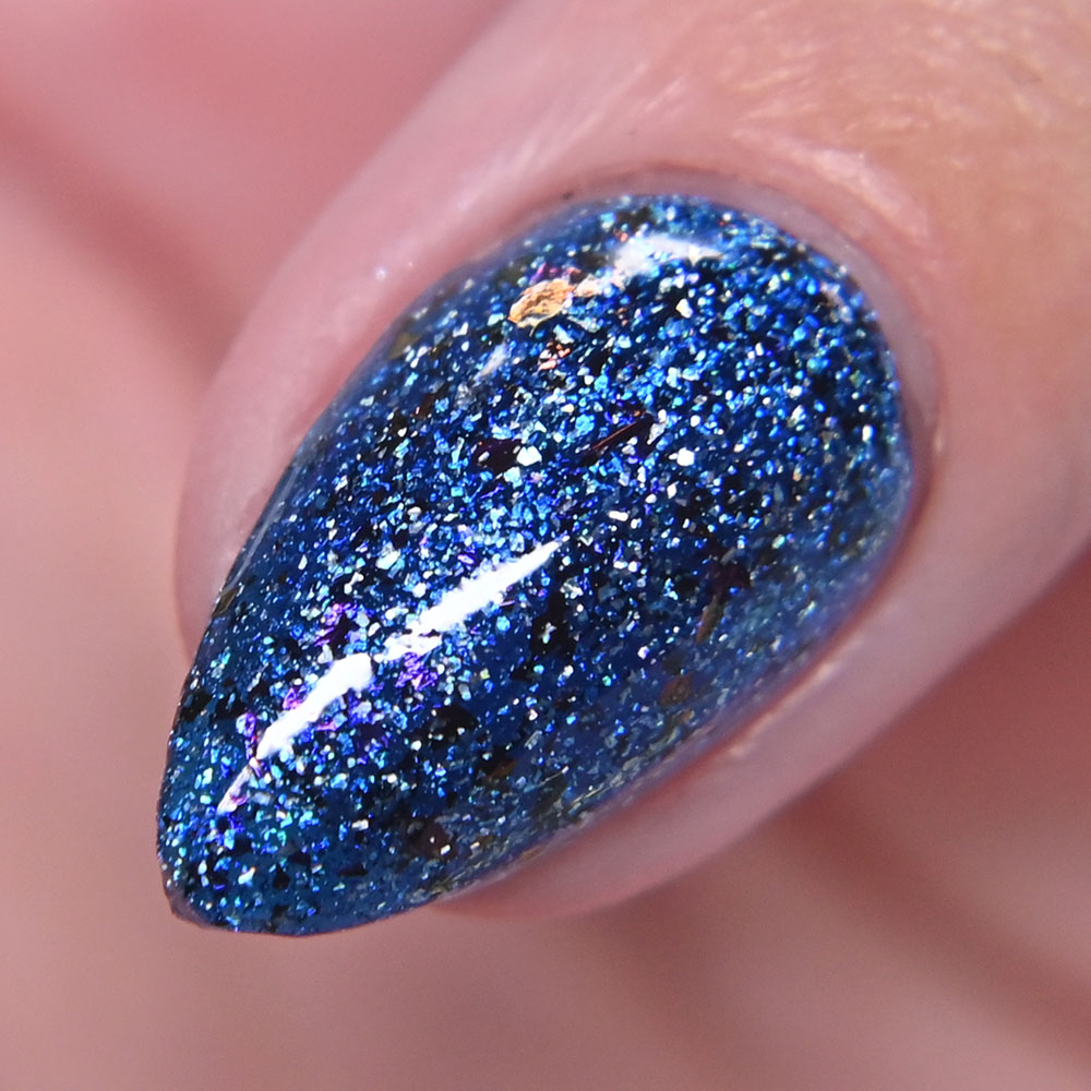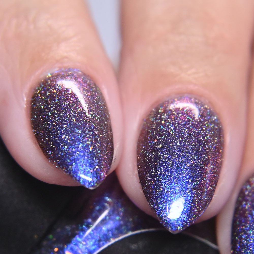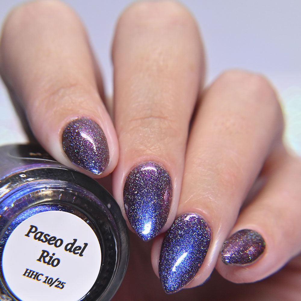 Description: Paseo del Rio is a blue to purple to bronze multichrome, with holographic flakes.