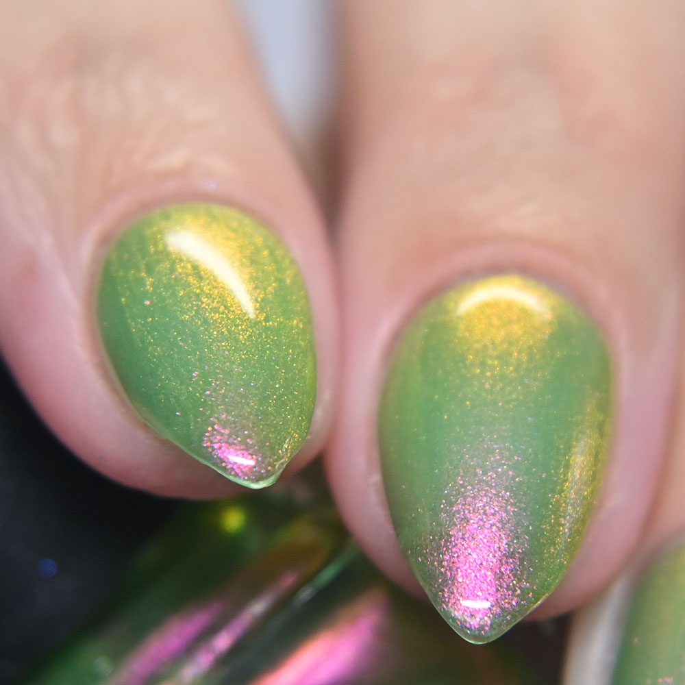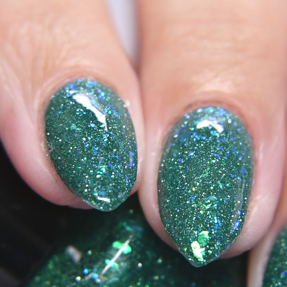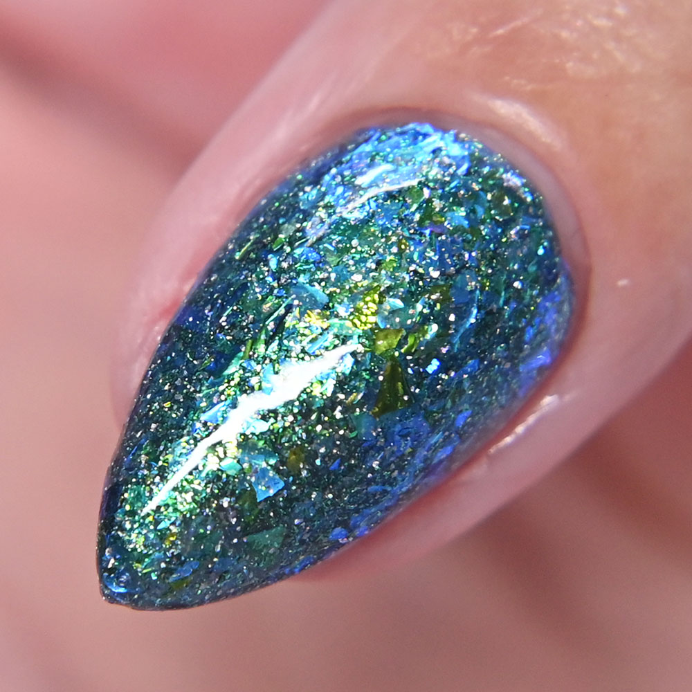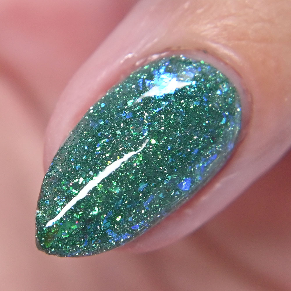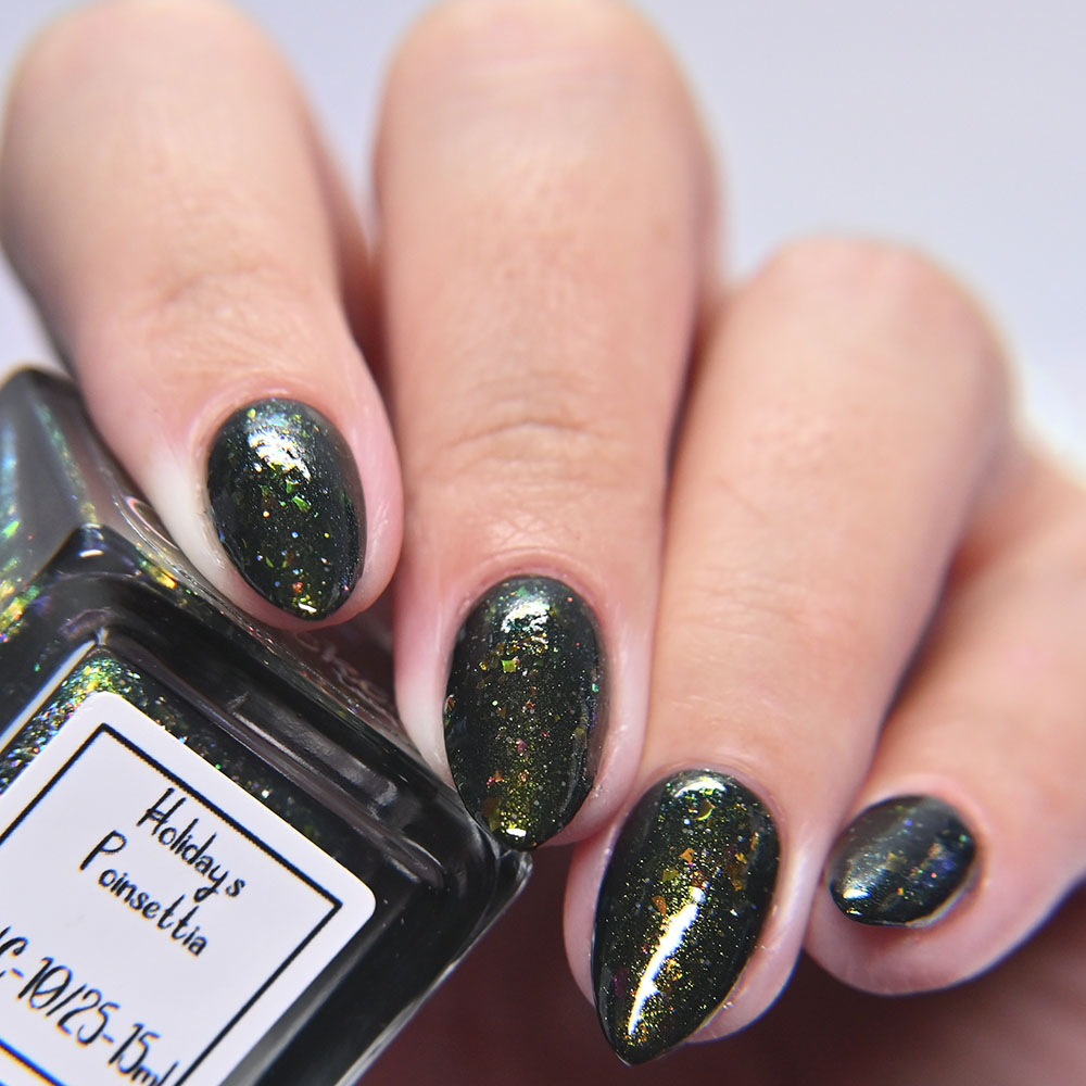 Description: Poinsettia is a green to blue multichrome, with holo glitters and amber gold and red flakes.
