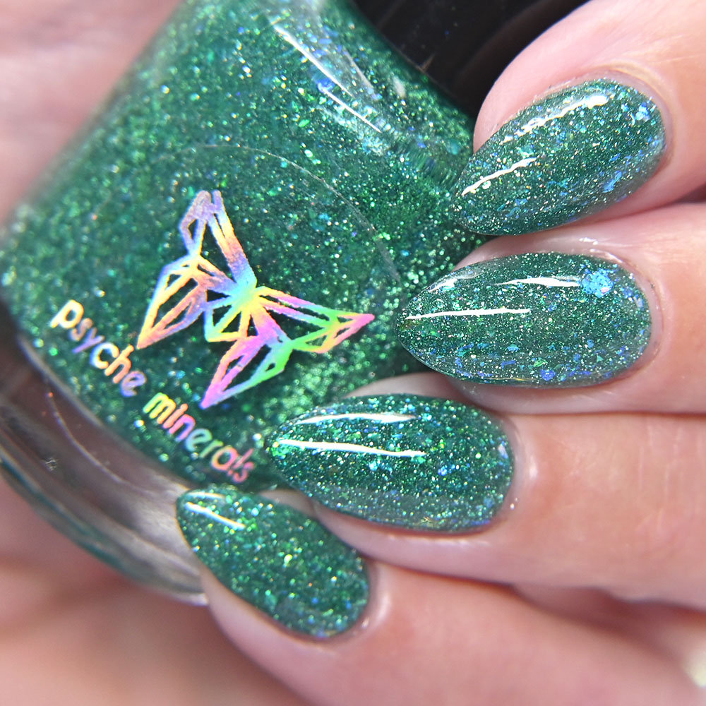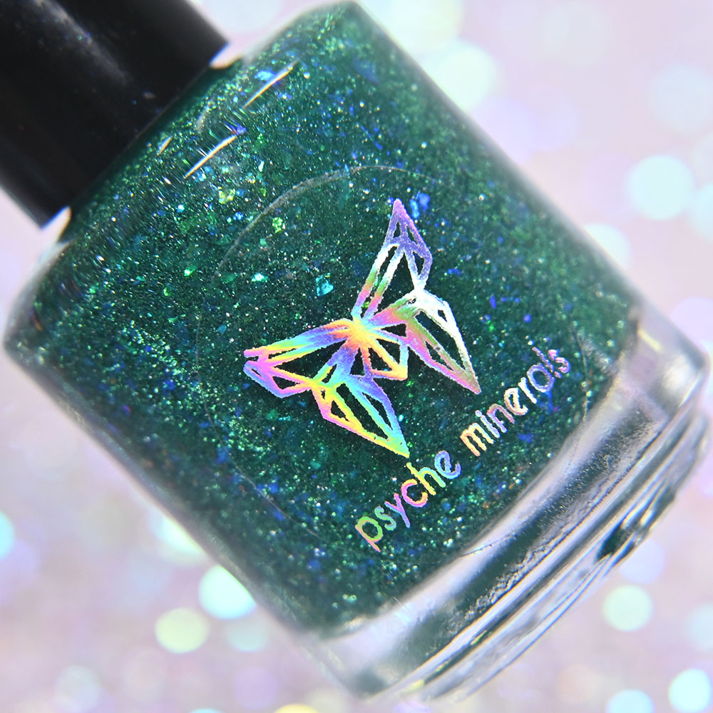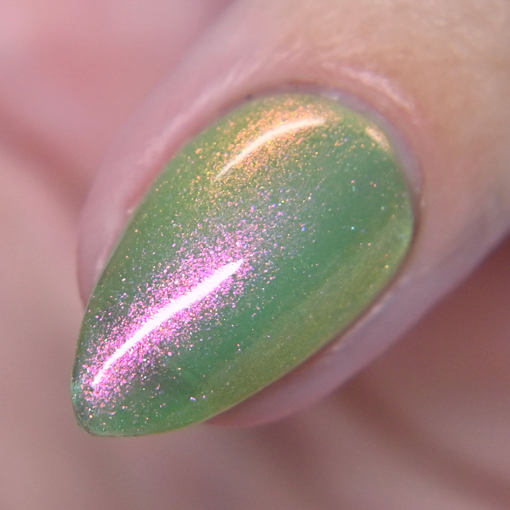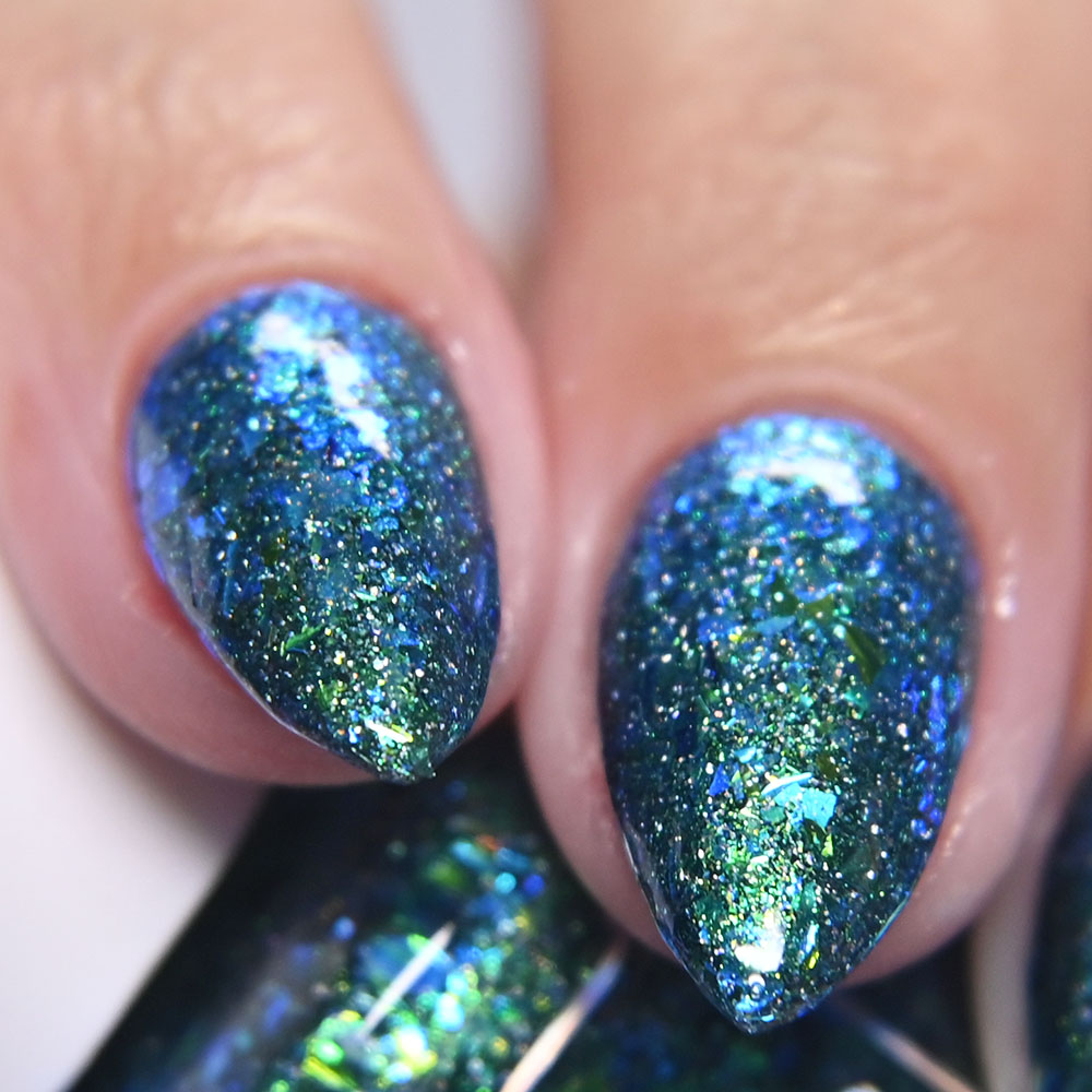 Description: Poinsettia is a green to blue multichrome, with holo glitters and amber gold and red flakes.