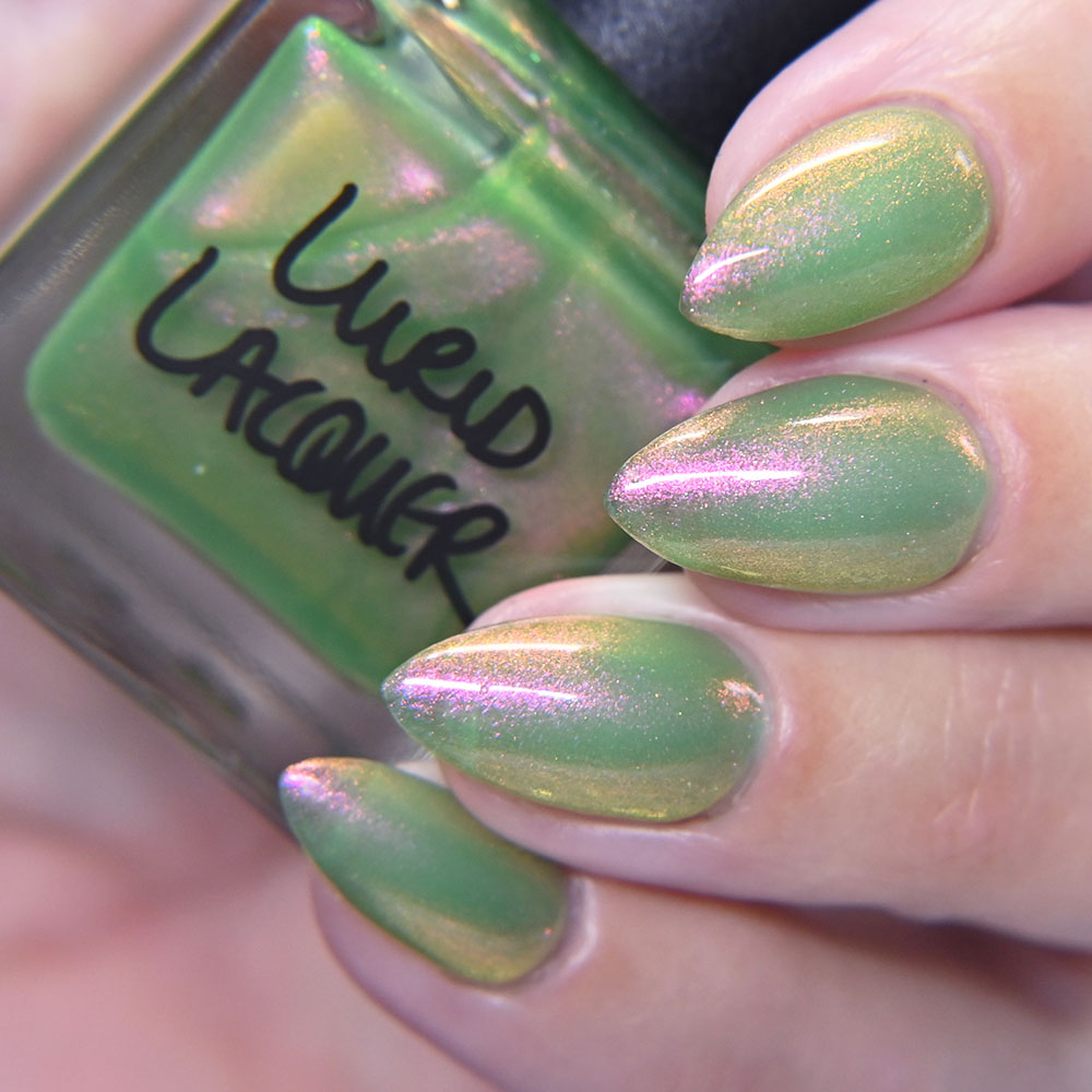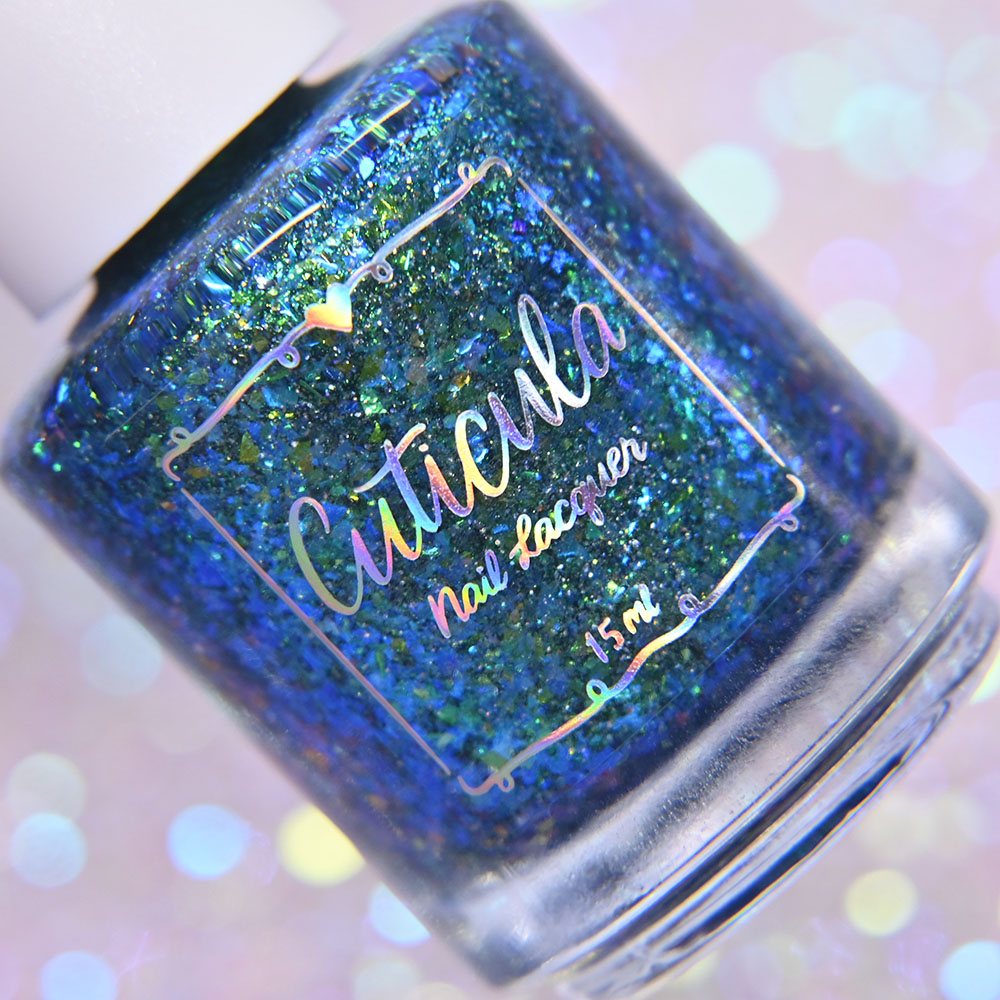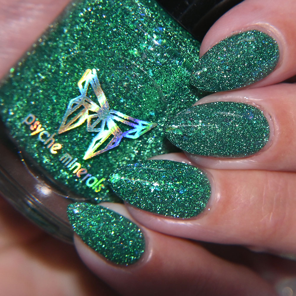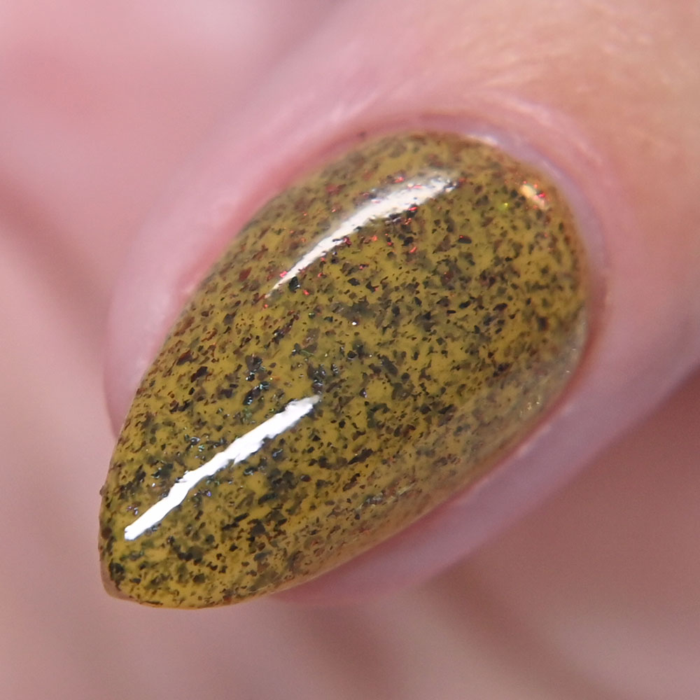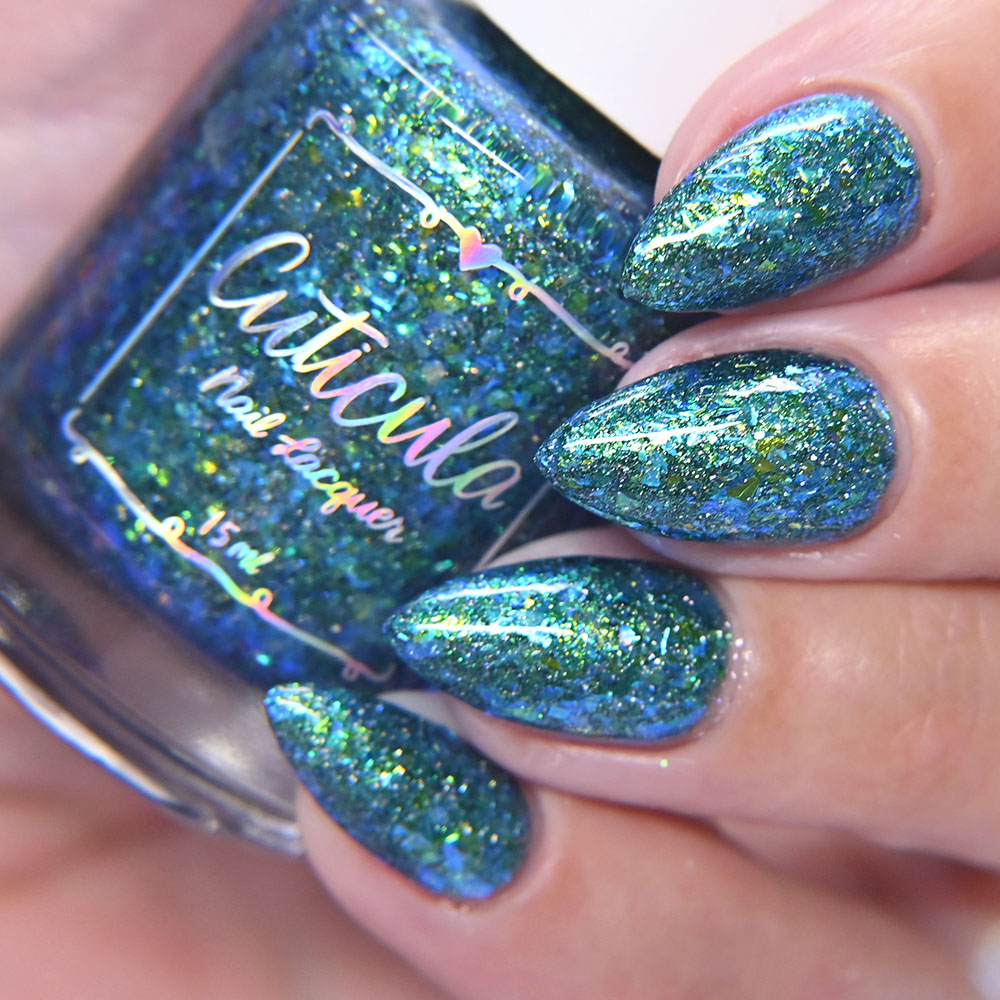 Description: Poinsettia is a green to blue multichrome, with holo glitters and amber gold and red flakes.