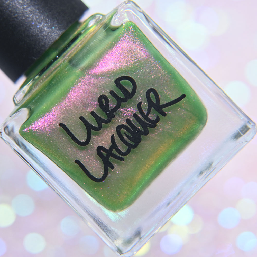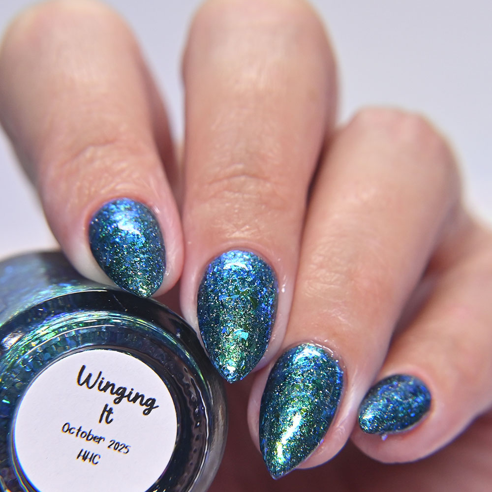 Description: Winging It is a murkey teal jelly base with sparkling green pigment, lime to green to blue to purple ultra chrome chameleon flakes, and silver holographic flakes.