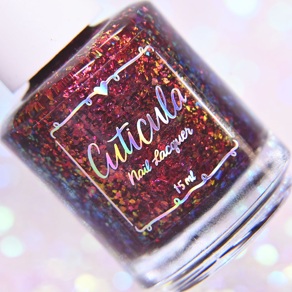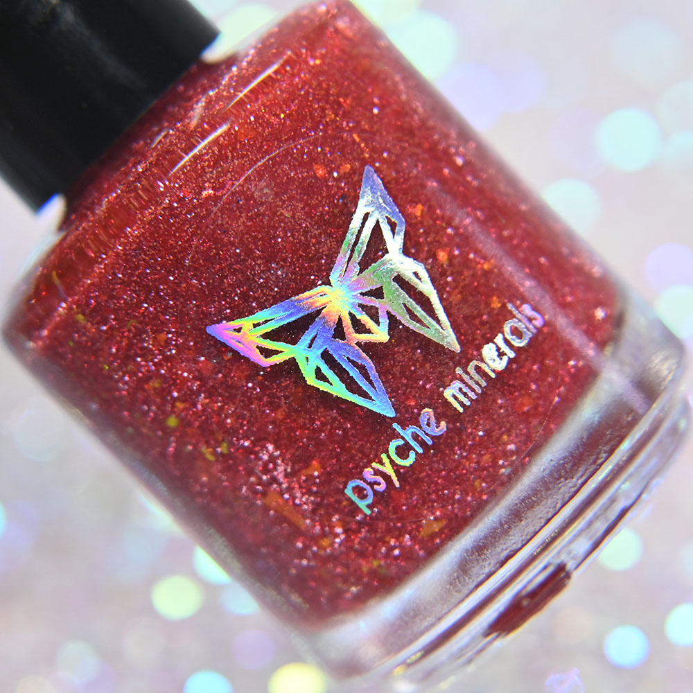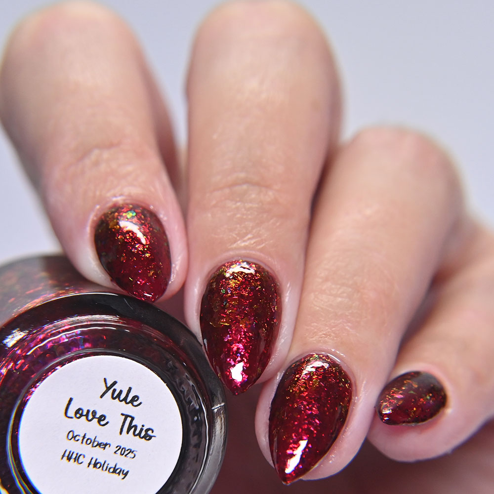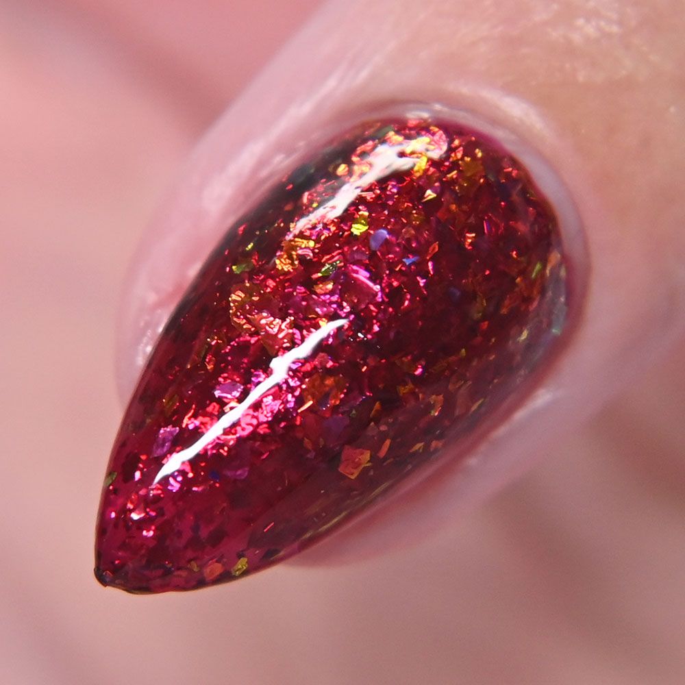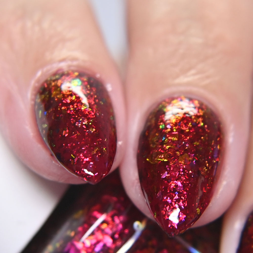 Description: Yule Love This is a deep jewel toned wine jelly base with shifting red to orange to green to yellow ultra chrome flakes.