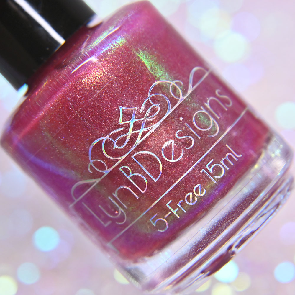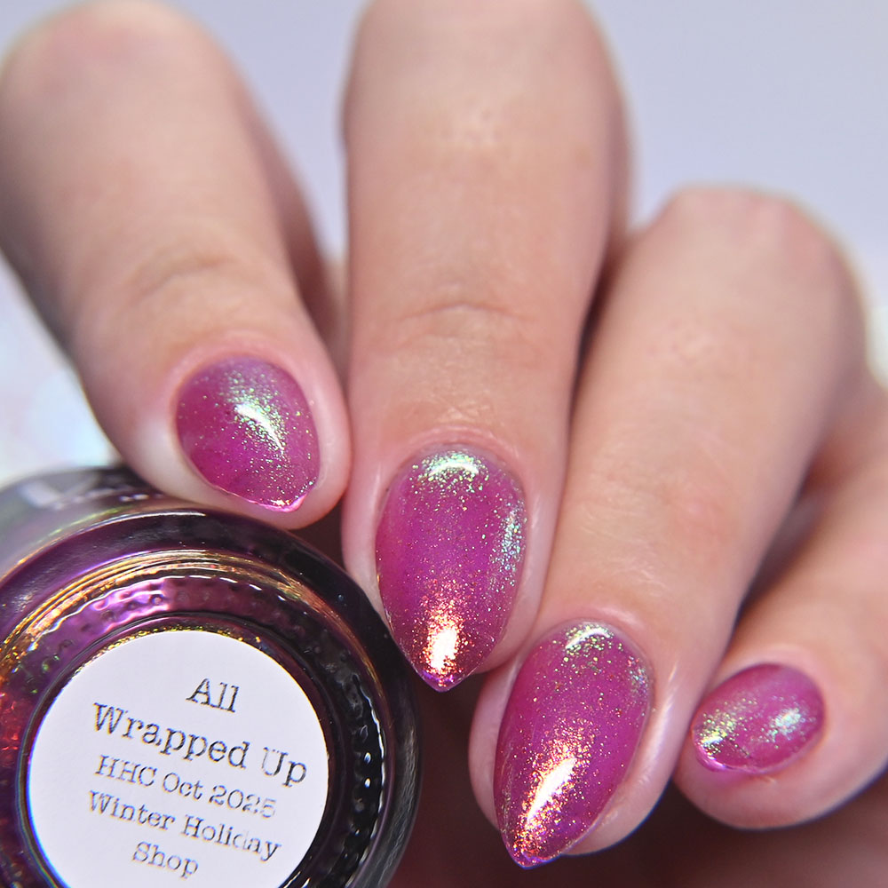 Description: All Wrapped Up is a violet leaning pink jelly base with large particle gold to green to blue shifting shimmer.