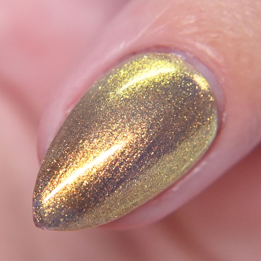 Description: Golden is a sheer greyish brown jelly base with intense gold shimmer.