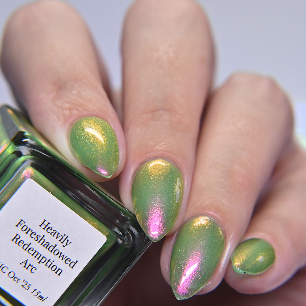 Description: Heavily Foreshadowed Redemption Arc is a sheer, medium green jelly base with glowy pink to red to orange to gold shimmer.