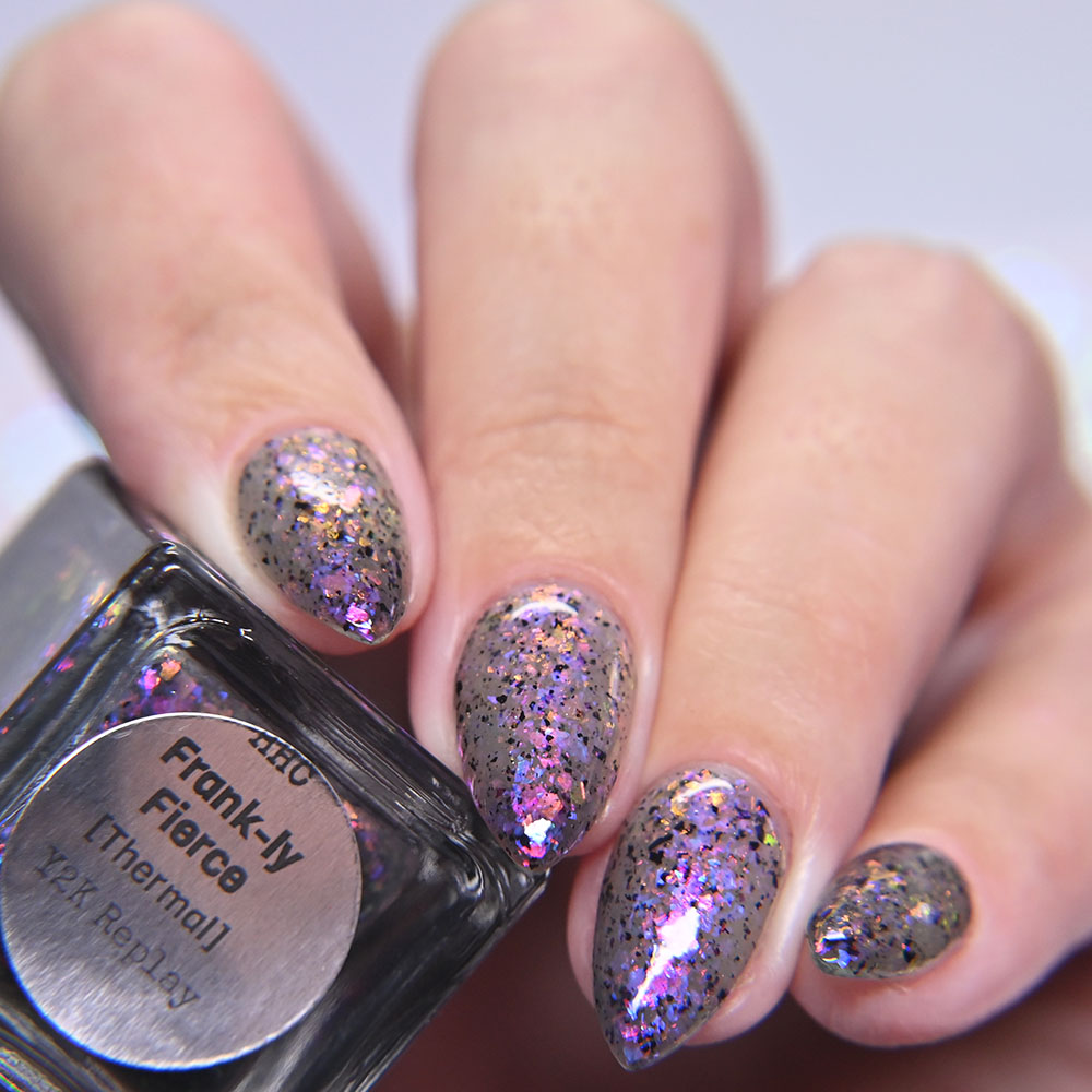 Description: Frank-ly Fierce is a clear to black thermal with pink to gold crystal flakies, blue to purple crystal flakies, and black metallic flakies.