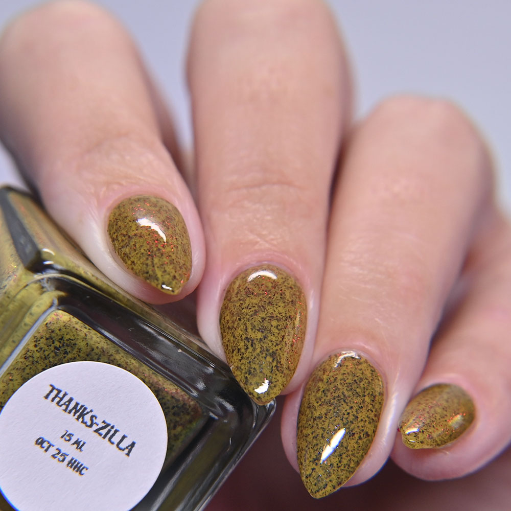 Description: Thanks-zilla is a grungy yellow crelly filled with multichrome micro flakies that shift black to red.