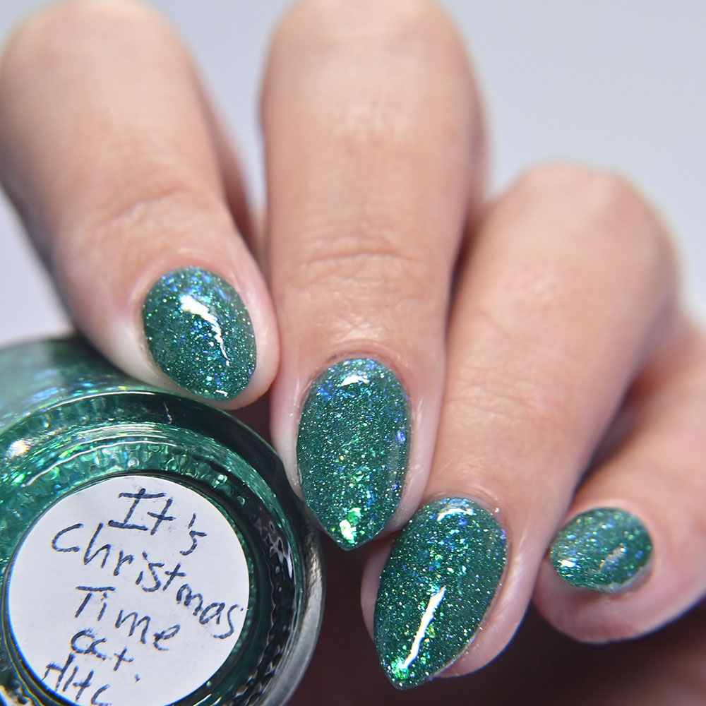 Description: It’s Christmas Time! is a teal green jelly with 2 different kinds of blue to green to gold iridescent flakes and green reflective glitter.