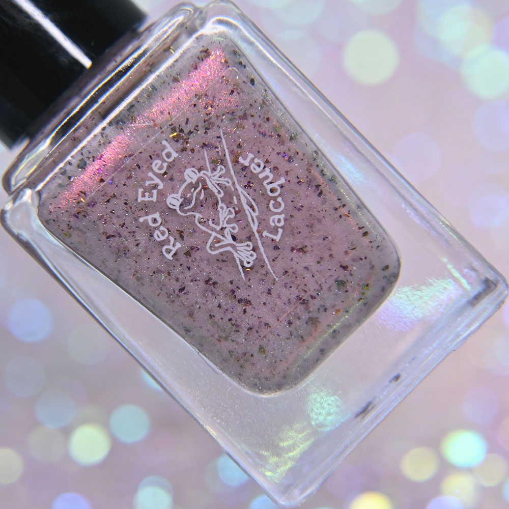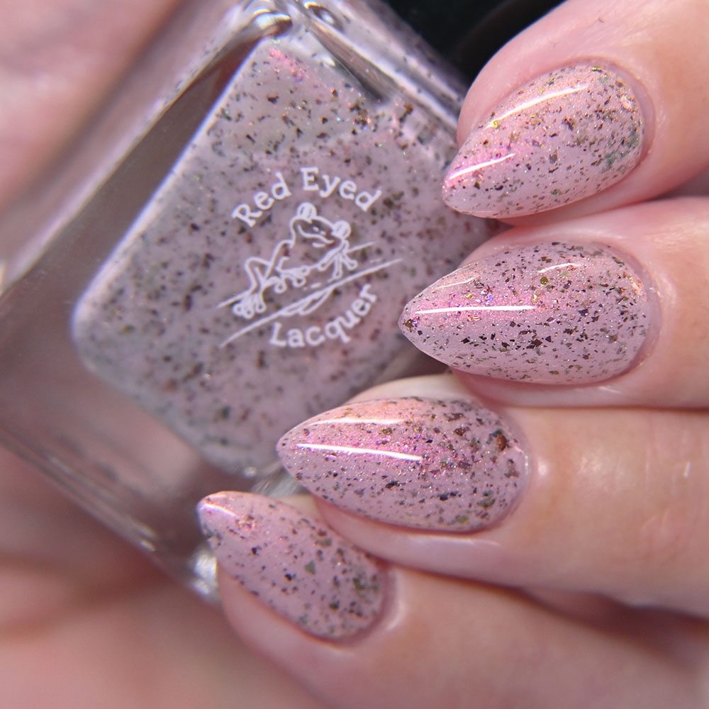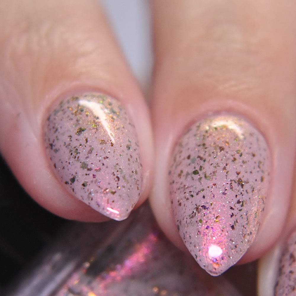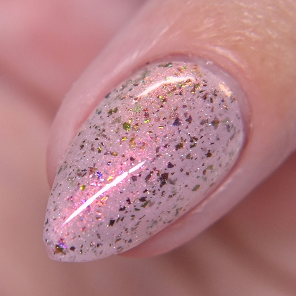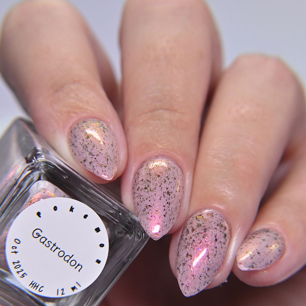 Description: Gastrodon is a pale pink crelly base with orange to gold to pink shifting shimmer and brown to green ultrachrome chameleon holo micro flakes.