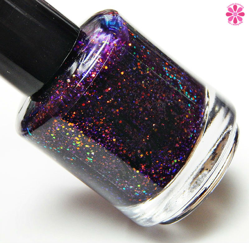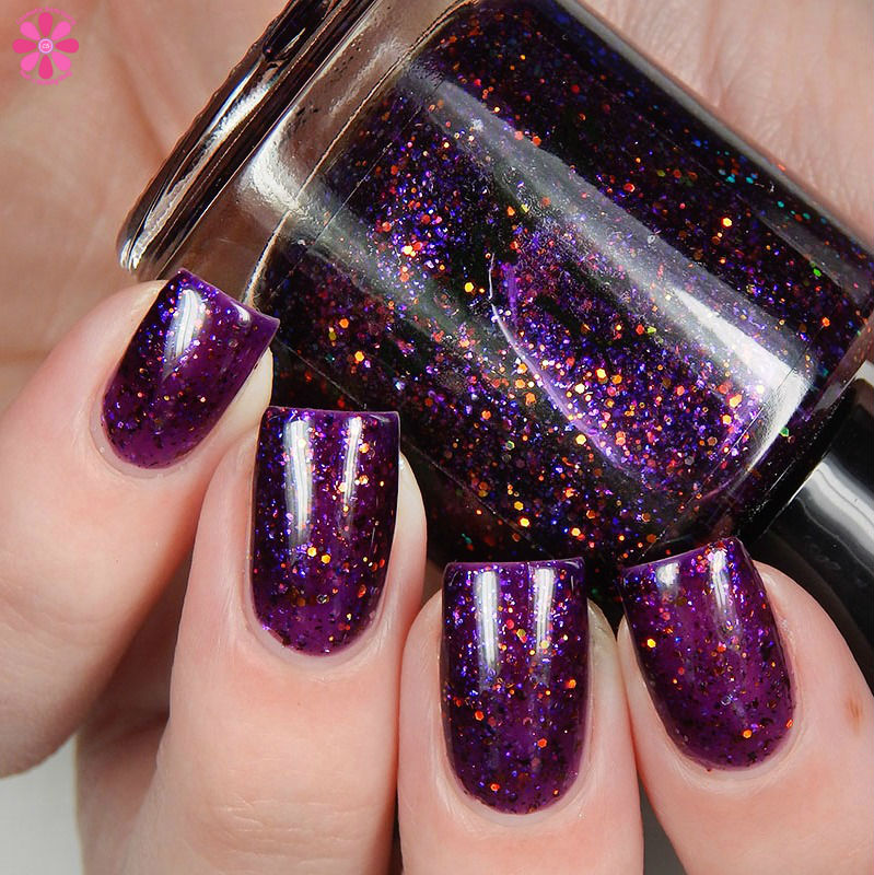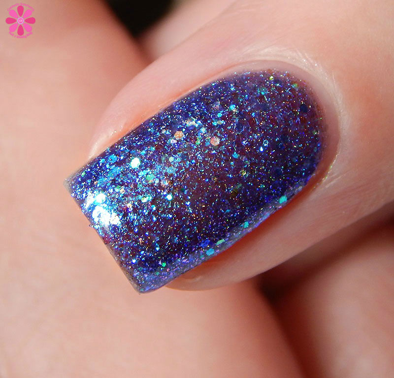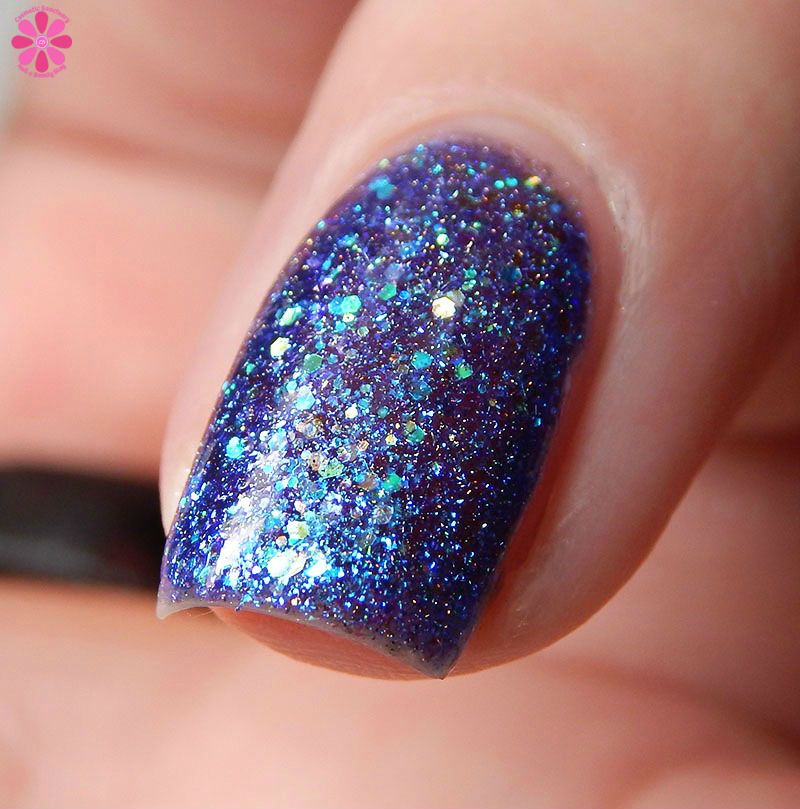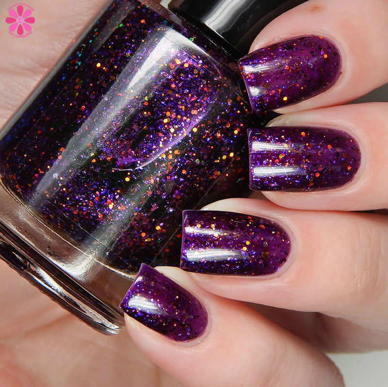 Winter Twilight is a deep grape purple jelly base packed with copper holo glitters, red to green iridescent glitter, purple to pink flakes and purple micro flakes. I used 2 coats and a glossy top coat for these photos.