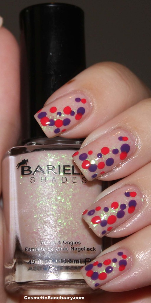 If you don’t have Buddha-ful, you need to go grab it. Gorgeous pale pinky nude with green iridescent flakes in it. Having this as the backdrop for Grape Escape (beautiful medium purple) and Elated (a bright, cheery coral) was perfect! Pure love.