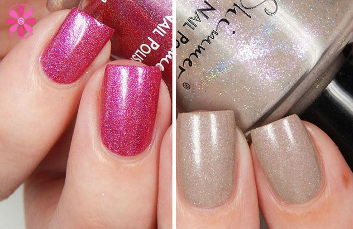 What The Shell is a medium light beige with silver holographic micro glitter and pink micro flakes. I used 2 coats and a glossy top coat for these photos.
