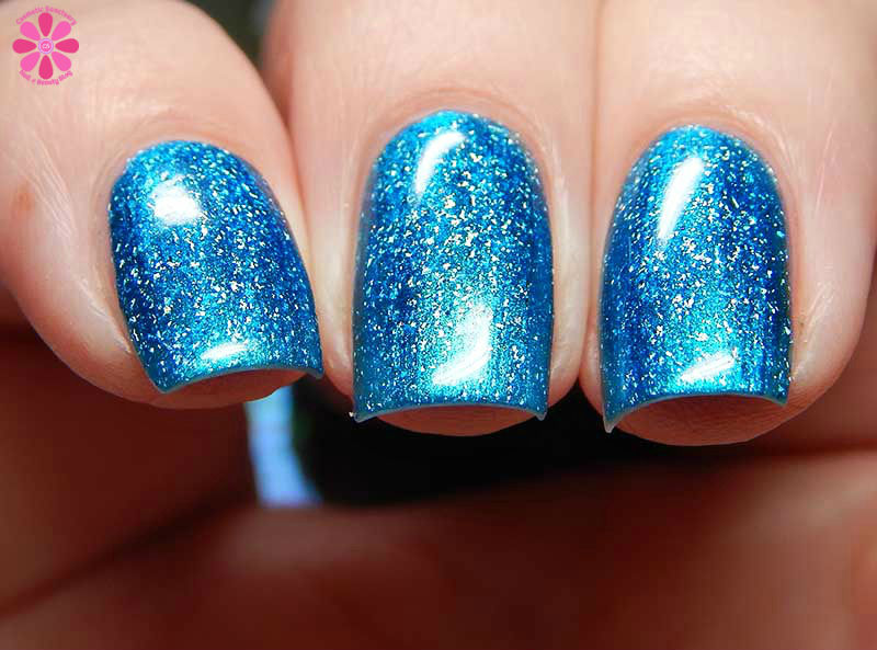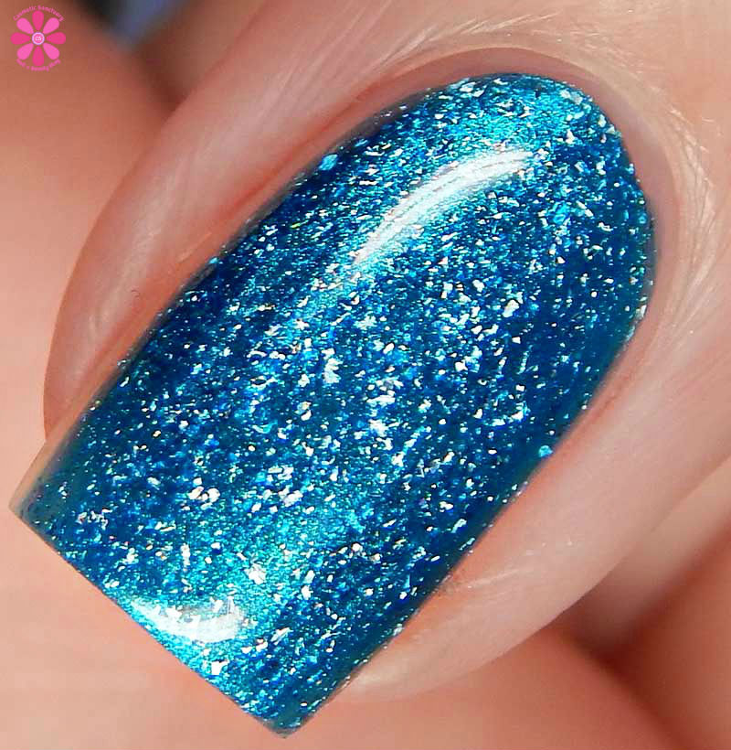 Better Lake Than Never was created with Alicia from DeliciousNails. This is a vibrant blue with turquoise shimmery glow and it has holographic glow flakes. I used 2 coats and a glossy top coat for these photos.