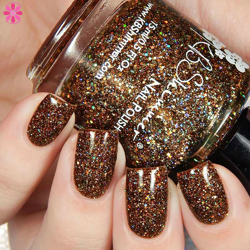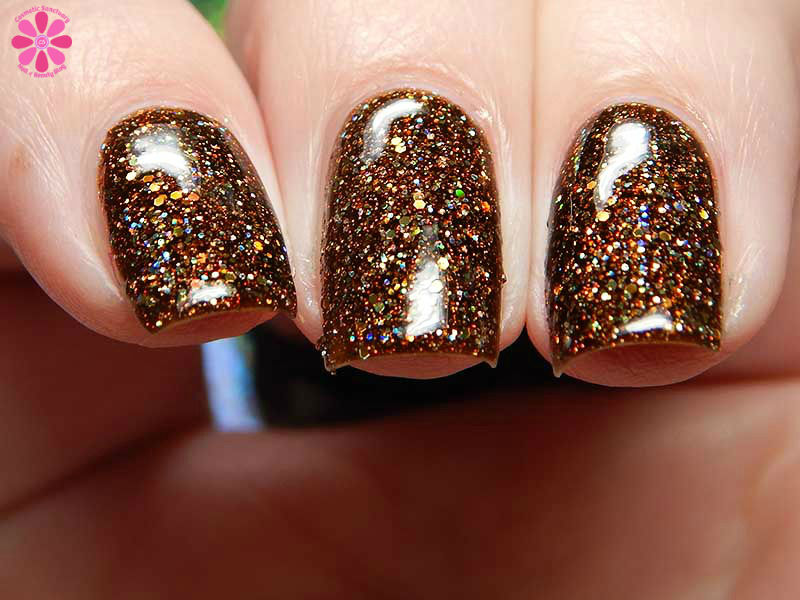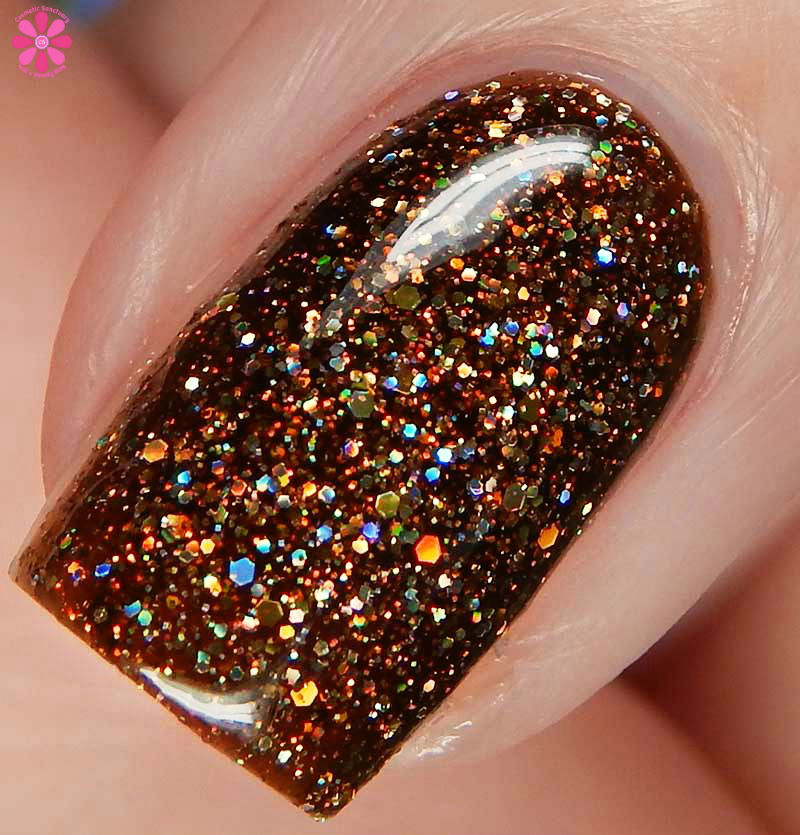 Espresso Yourself was created with Gaby of Lacquerloon. This is a rich, warm chocolate jelly base packed with brown, copper and gold small and micro holographic glitters. If you love the Mega Flame polishes, you’ll love this one too. I used 2 coats and a glossy top coat for these photos.