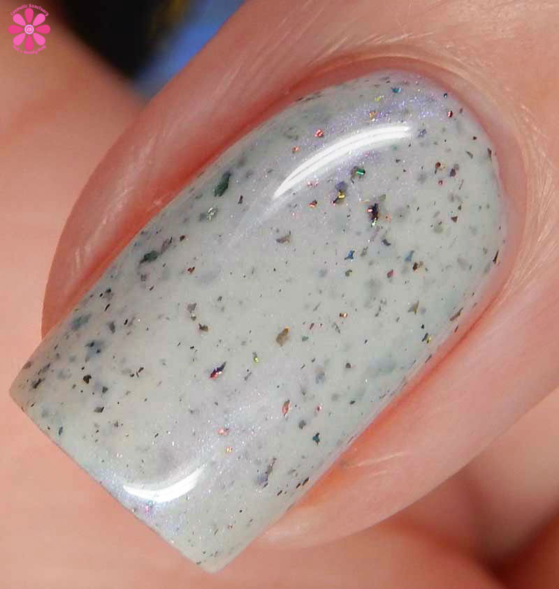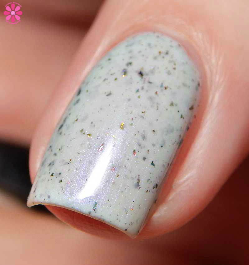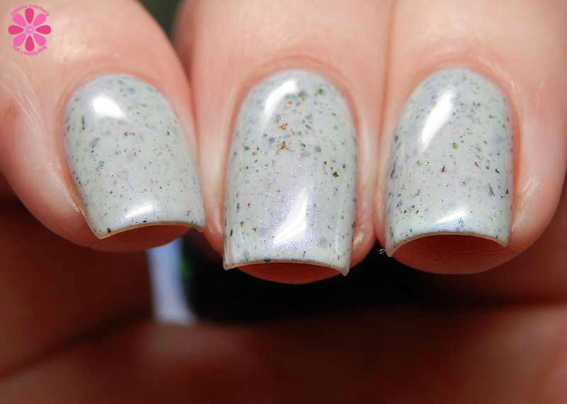 High-Rise To The Occasion was created with Michelle from EhmkayNails. This is a light dove grey creme with violet shimmer and rainbow metallic flakes. I used 3 thin coats and a glossy top coat for these photos.