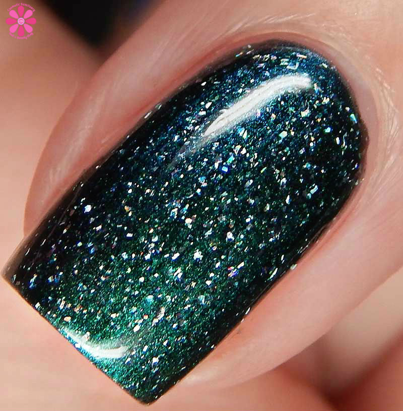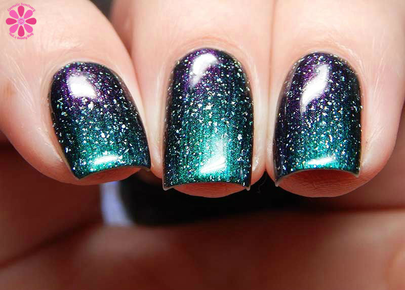 Northern Frights was created with Judy from BeautyJudy. This is a multichrome polish that shifts from emerald green to navy blue to indigo purple, plus is has silver holographic glow flakes. I used 2 coats and a glossy top coat for these photos.