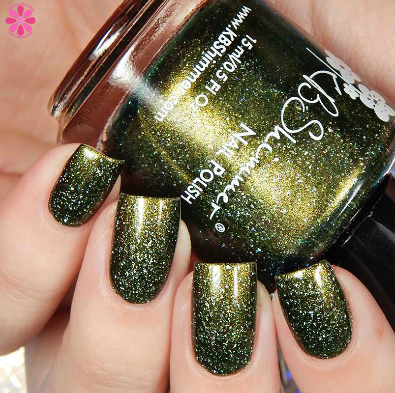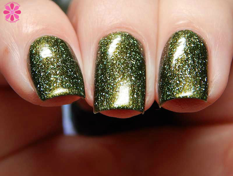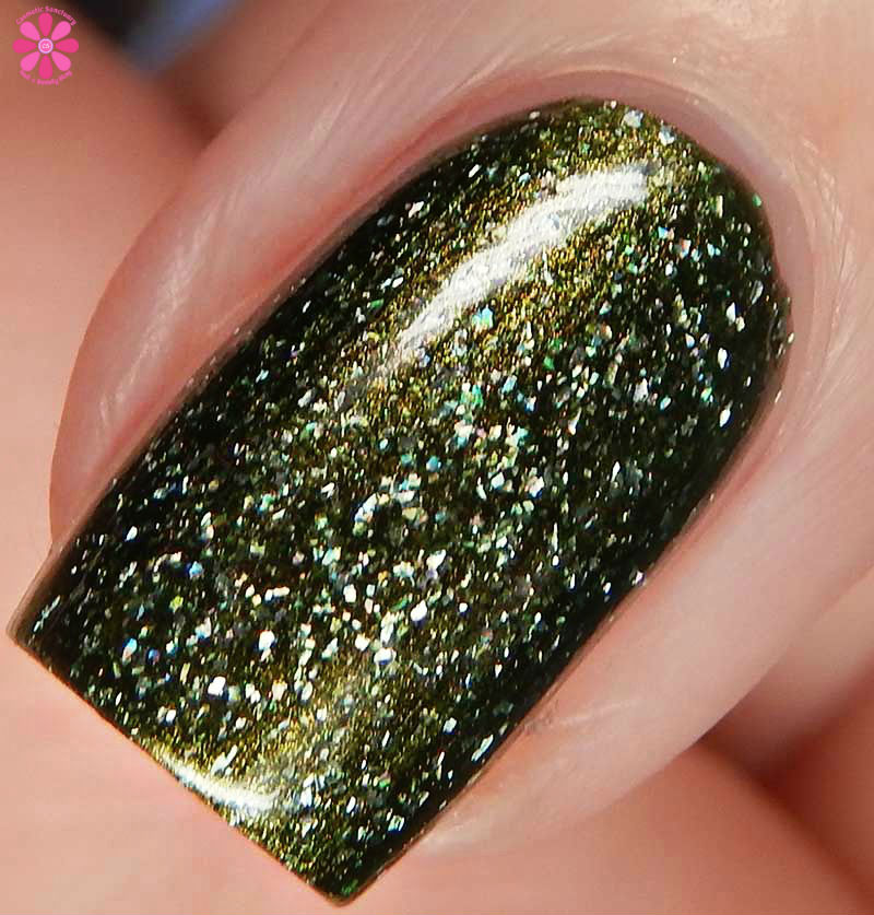 Olive Or Twist was created with Lovely Mishra from Nail It Lovely. This is a deep olive with a ton of gold shimmer and silver holographic glow flakes. I used 2 coats and a glossy top coat for these photos.