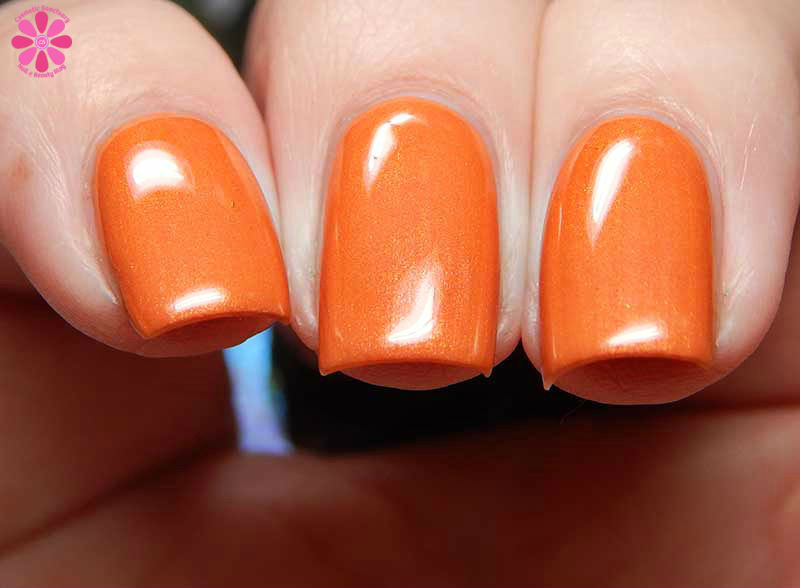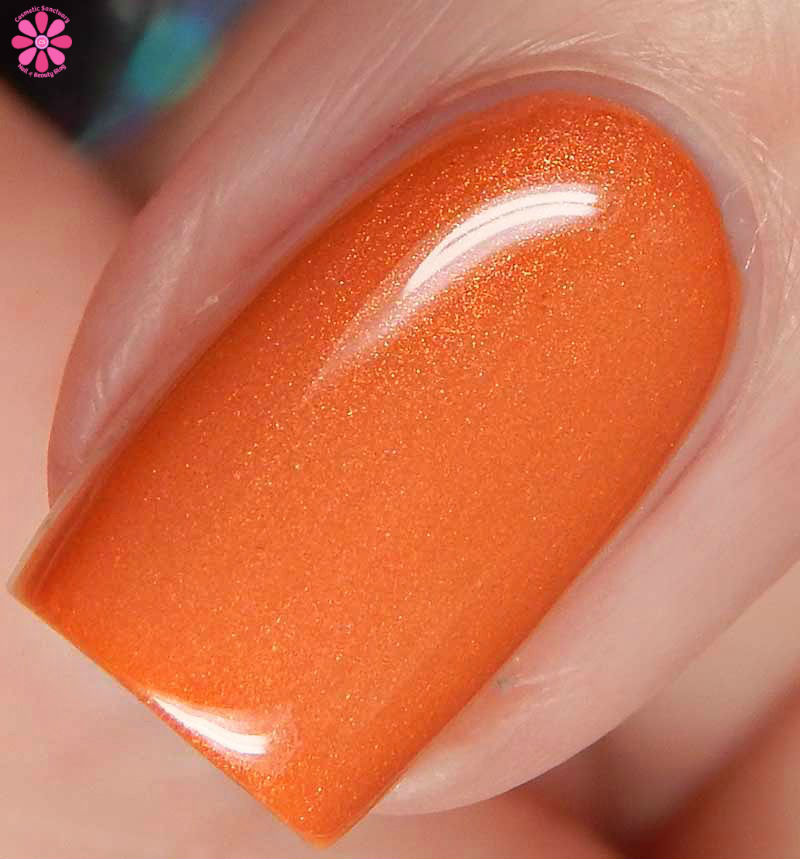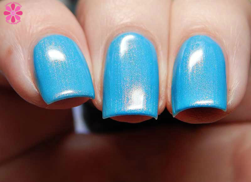 Peach For The Sky was created with Antoinette from AriceDotCom. This is a medium sky blue creme base loaded with peachy copper shimmer. I used 2 coats and a glossy top coat for these photos.