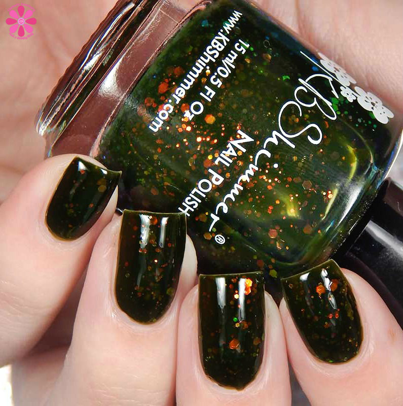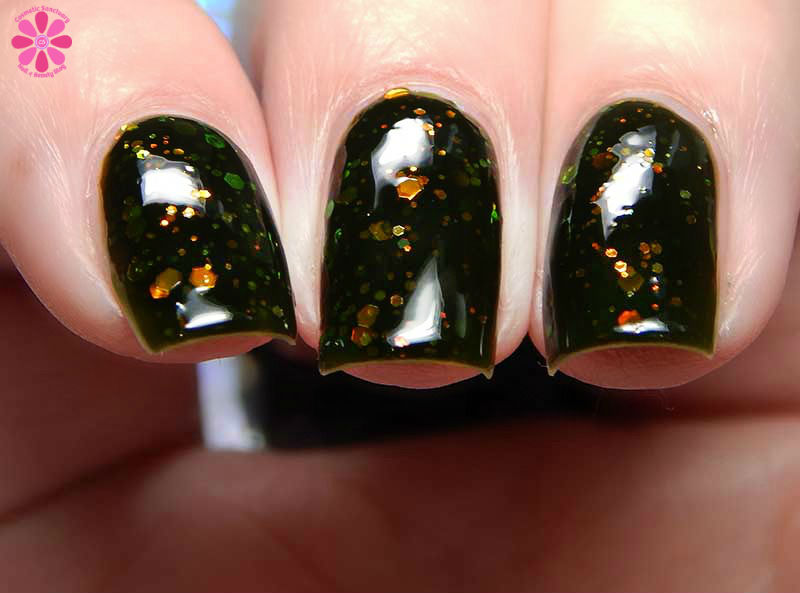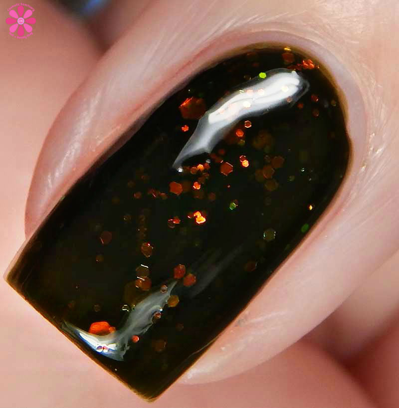 #squadghouls was created with Holly from Miss Holly Berries. This is a deep olive green jelly base with glitters that shift from orange to gold to green. I used 3 thin coats and a glossy top coat for these photos.