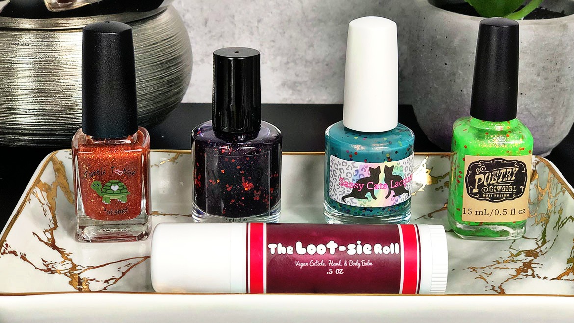 We have 5 makers involved in the Le Petite Indies No Tricks Just Treats Halloween 2019 box and they are Turtle Tootsie Polishes, What Addiction?, Poetry Cowgirl Nail Polish, Sassy Cats Lacquer and  K.N.I. Beauty & Bath. You can purchase the full box, or pick and choose which items you want from the box and purchase those items separately.