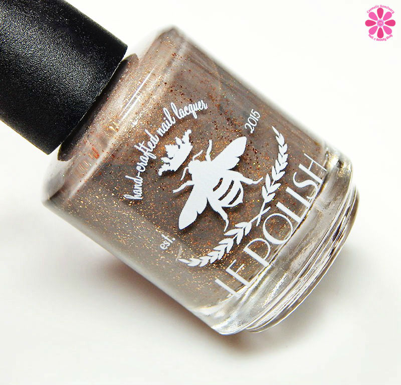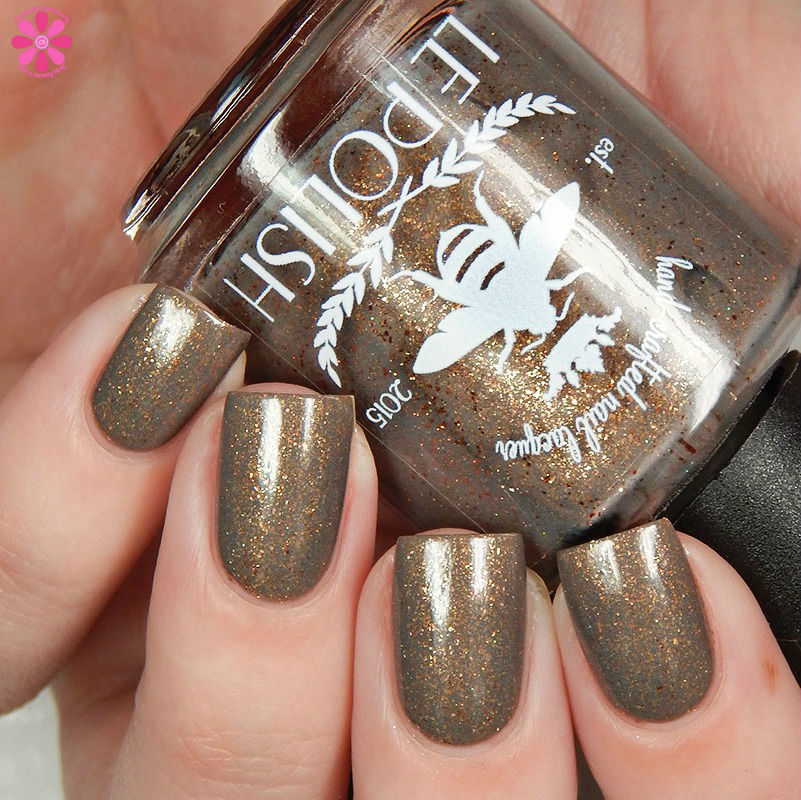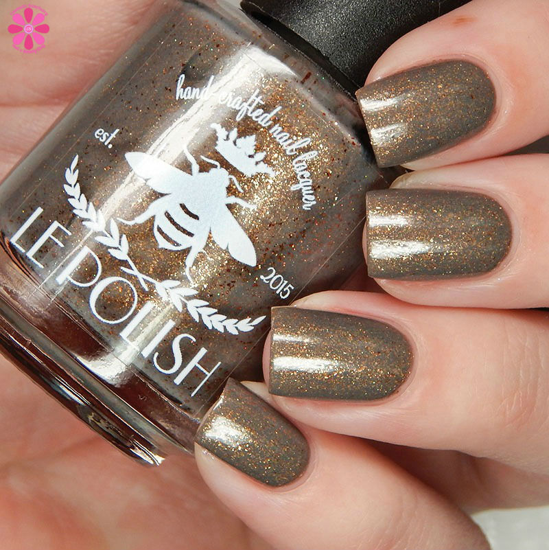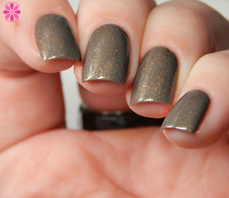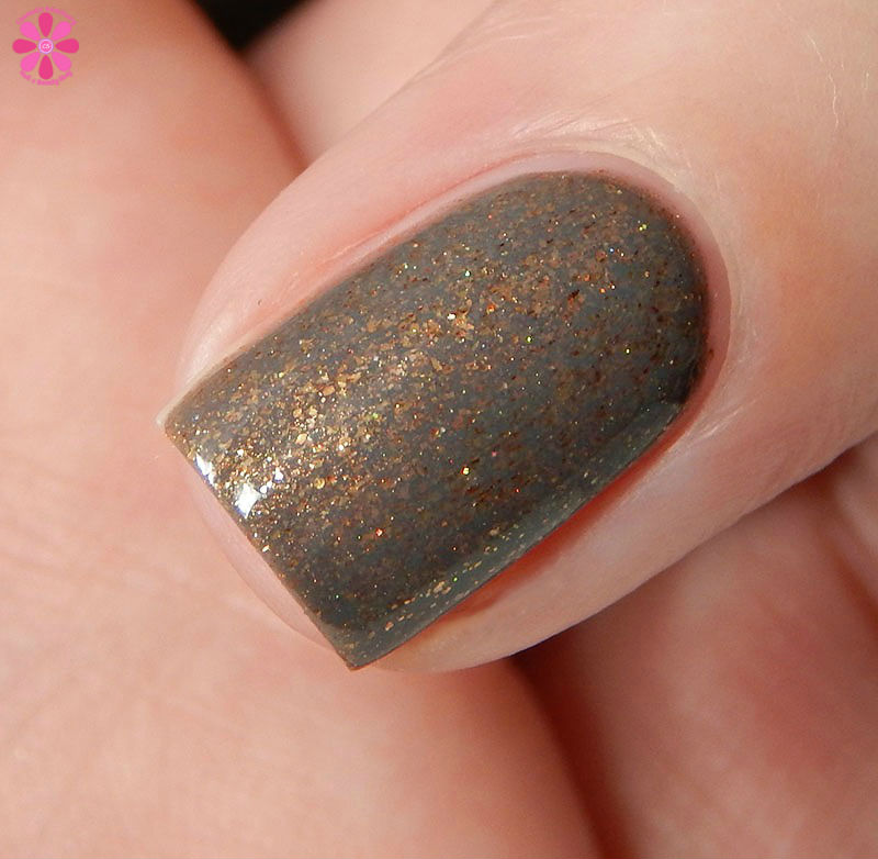 Polish Con’t Go is a creamy chocolate milk creme base with flecks of gold and copper shimmer and a scattering of holo. I used 2 coats and a glossy top coat for these photos.