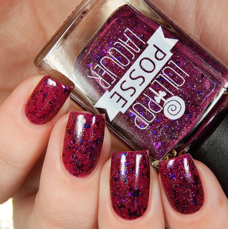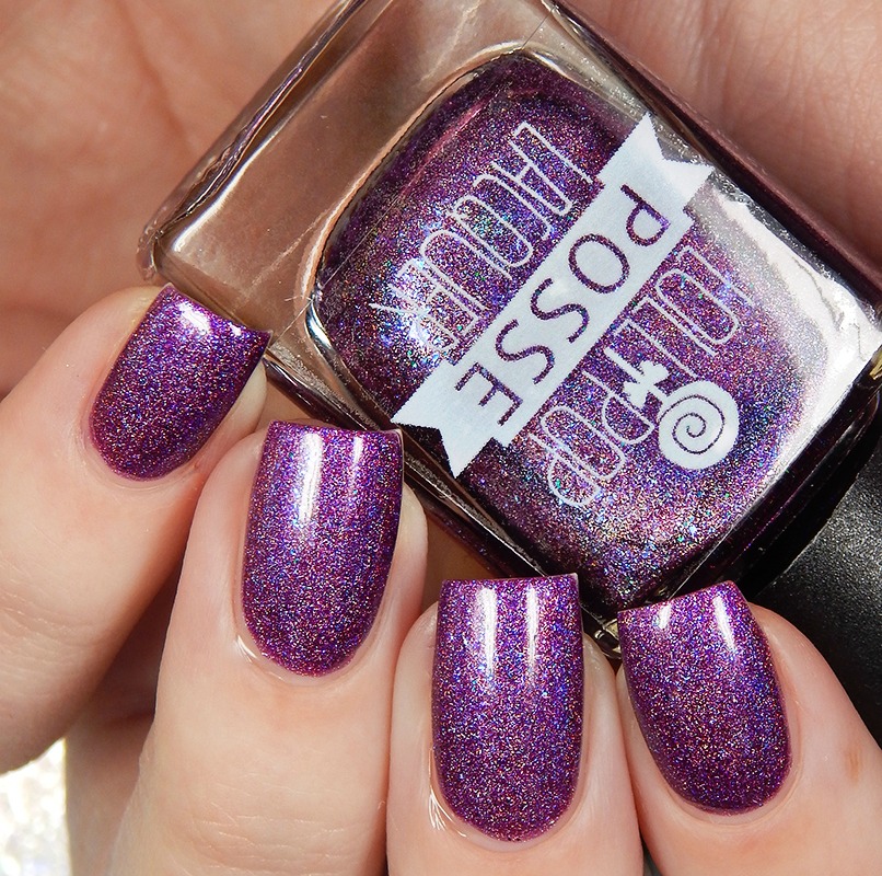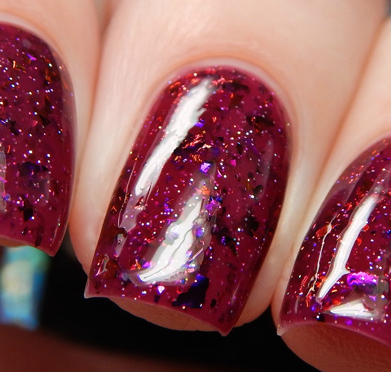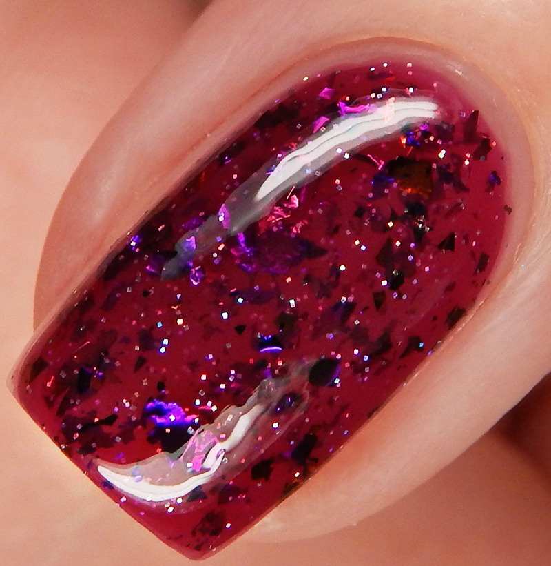 Out Of The Ash is a red based purple based scattered holographic with a vibrant blue flash and neon purple microflakes. I used 3 thin coats and a glossy top coat for these photos.