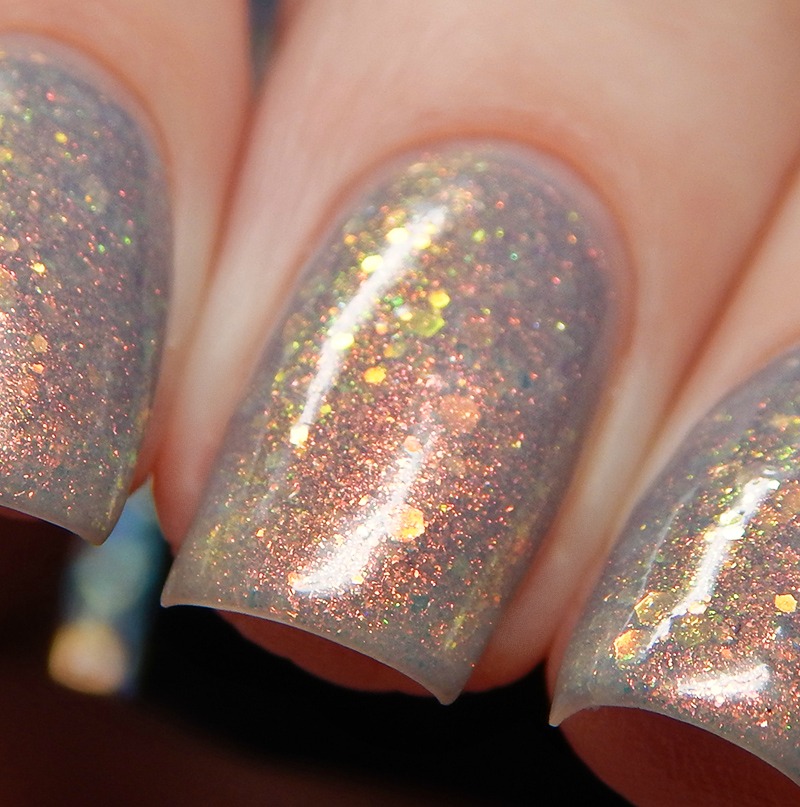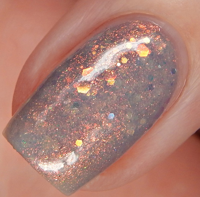 Temperance is a violet tinted greige jelly base with red to gold to green shifting Aurora pigment and red to green to gold shifting iridescent glitters. I used 3 thin coats and a glossy top coat for these photos. It is a sheer polish, but builds up nicely.