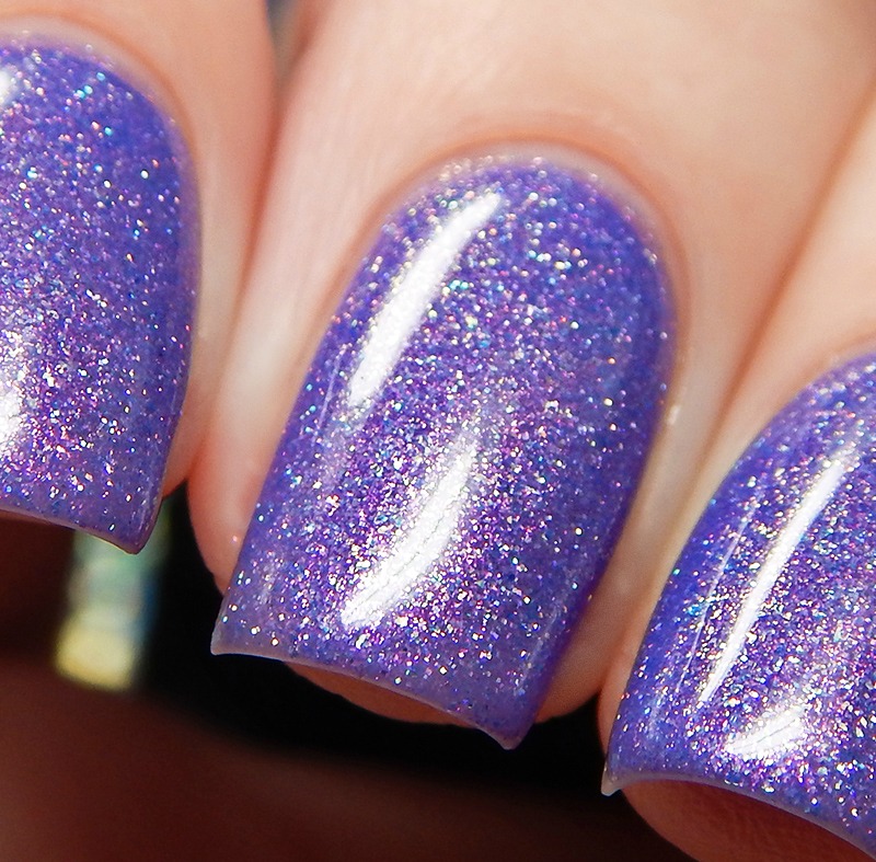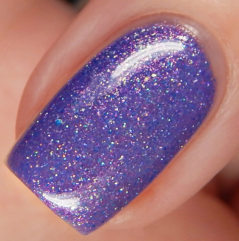 The Big Strip Tease is a medium lavender crelly with gold to red shifting chameleon pigment, blue to gold micro flakes and scattered holographic microglitters. I used 3 thin coats and a glossy top coat for these photos.
